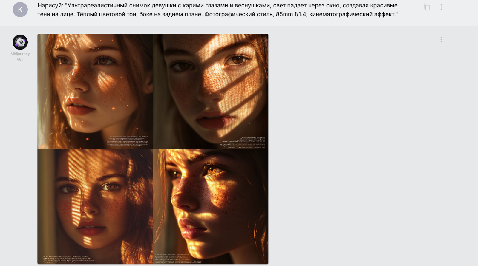 Где использовать? Промпт, который мы использовали в Chad AI: Фотореалистичный портрет 35-летнего мужчины с щетиной, в кожаной куртке, стоящего на улице под дождём. Вода капает с волос, свет фар отражается в лужах. Человек смотрит в камеру с задумчивым выражением лица Главные особенности: Минусы: Где использовать? Промпт, который мы использовали в Chad AI: Ультрареалистичный снимок девушки с карими глазами и веснушками, свет падает через окно, создавая красивые тени на лице. Тёплый цветовой тон, боке на заднем плане. Фотографический стиль, 85mm f/1.4, кинематографический эффект Главные особенности: Минусы: Где использовать? Промпт, который мы использовали в Chad AI: Тёплый, уютный интерьер книжного магазина в ретростиле, старинные деревянные полки, мягкий рассеянный свет, на переднем плане человек с чашкой кофе, задумчиво рассматривающий книги. Фотореализм, атмосферное освещение Главные особенности: Минусы: Где использовать? Промпт, который мы использовали в Chad AI: Чёрно-белая фотография старого Нью-Йорка 1950-х годов, мужчины в шляпах идут по улице, неоновая реклама кафе светится на фоне, лёгкий дождь, отражения в лужах, стиль классической плёночной камеры Все зависит от ваших целей: — для точного соответствия описанию → DALL·E 3; Наши лидеры по субъективной оценке — Midjourney и Stable Diffusion. Показываем результаты вблизи: Реалистичное изображение девушки, сгенерированное Midjourney Изображение в стиле старого Нью-Йорка, сгенерированное Stable Diffusion 💬 Какой генератор вам нравится больше? Делитесь в комментариях!