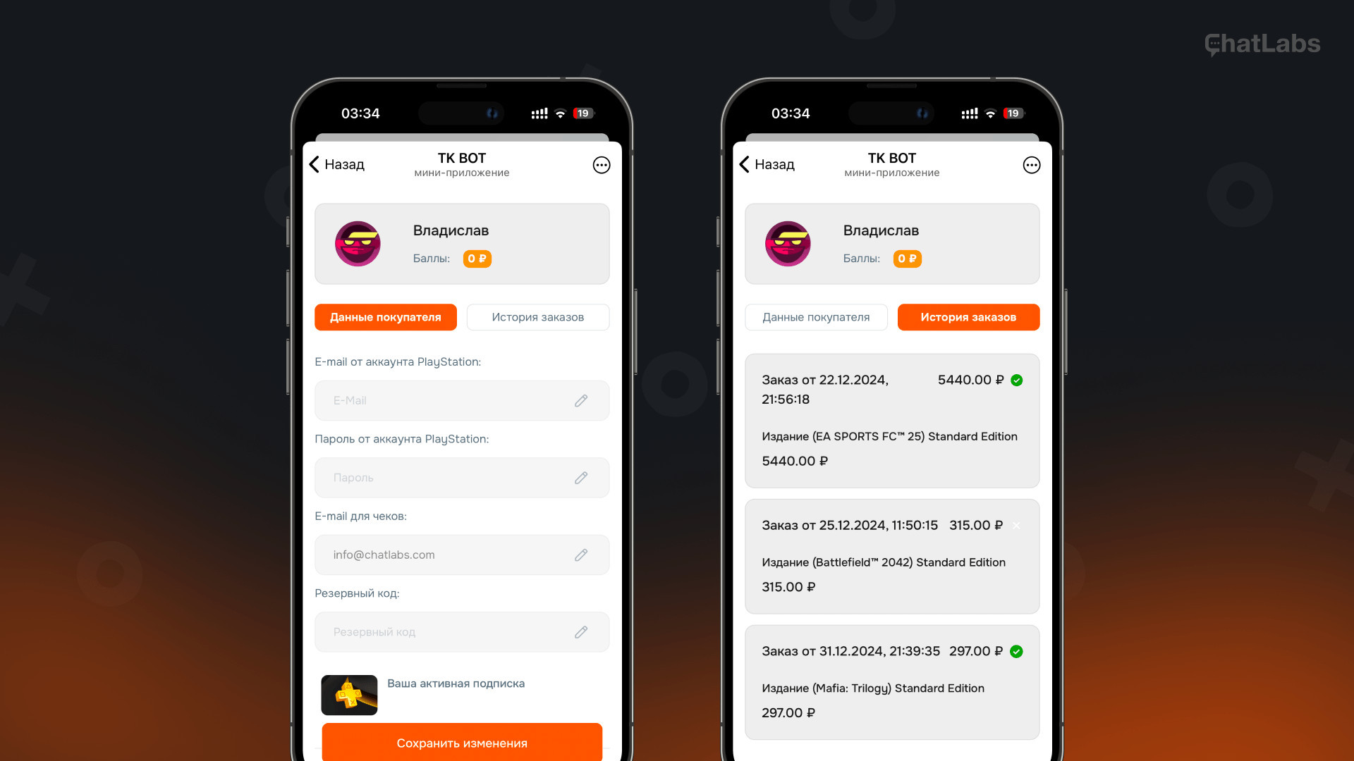 приложении для пользователя автоматически создаётся личный кабинет, который он сможет редактировать, например, сохранив e-mail, на который будут приходить чеки о покупках или пароль от аккаунта PlayStation. Также доступна возможность просмотра истории заказов. Если