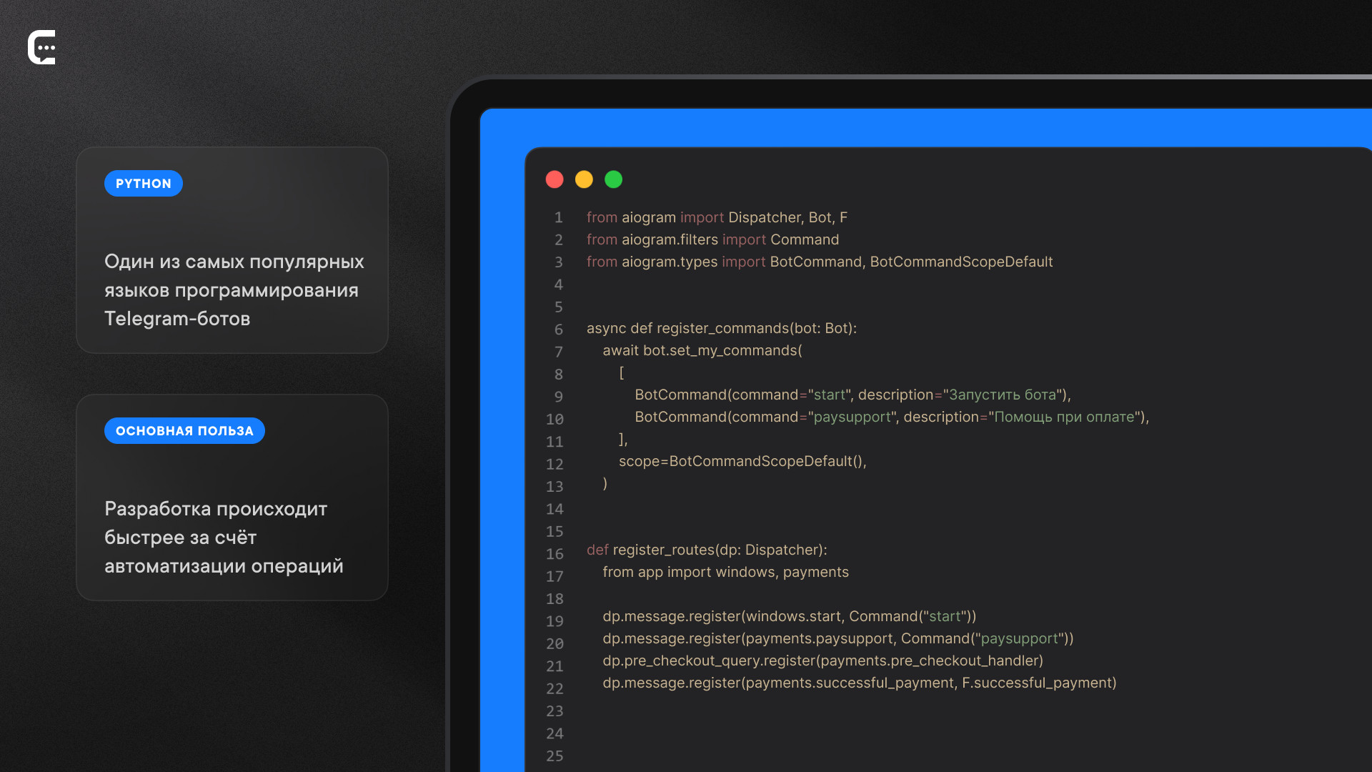 её польза — разработка происходит быстрее за счёт автоматизации всех низкоуровневых операций (например, формирования HTTP-запросов для упомянутого выше Telegram API), что позволяет сфокусироваться на построении логики самого бота. Если говорить о сроках разработки, то они могут различаться, в зависимости от сложности функционала и необходимости интеграции с внешними сервисами. На создание максимально простого решения может уйти несколько дней, а процесс разработки сложных ботов с широким спектром возможностей может растянуться на несколько недель. Ограничения Telegram-ботов также затрагивают несколько аспектов. Во-первых, отсутствует возможность создания сложного графического интерфейса, всё ограничивается набором кнопок и меню команд, а также интерфейсом диалогового окна стандартного чата Во-вторых,