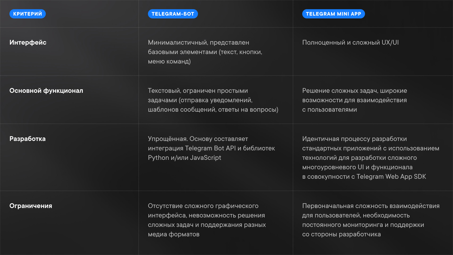 Несмотря на то, что ещё не до конца исчезла тенденция ставить между Telegram-ботами и мини-приложениями знак равенства, решения имеют куда больше различий, чем сходств.
