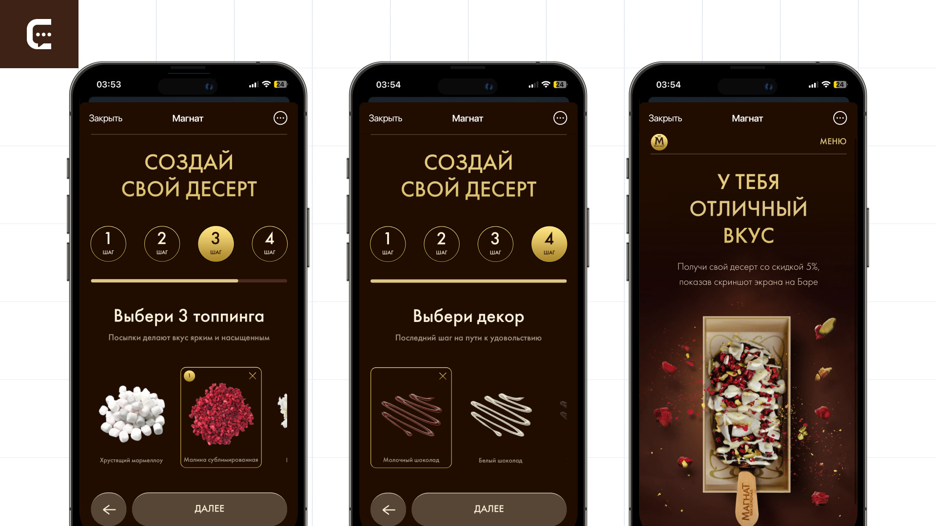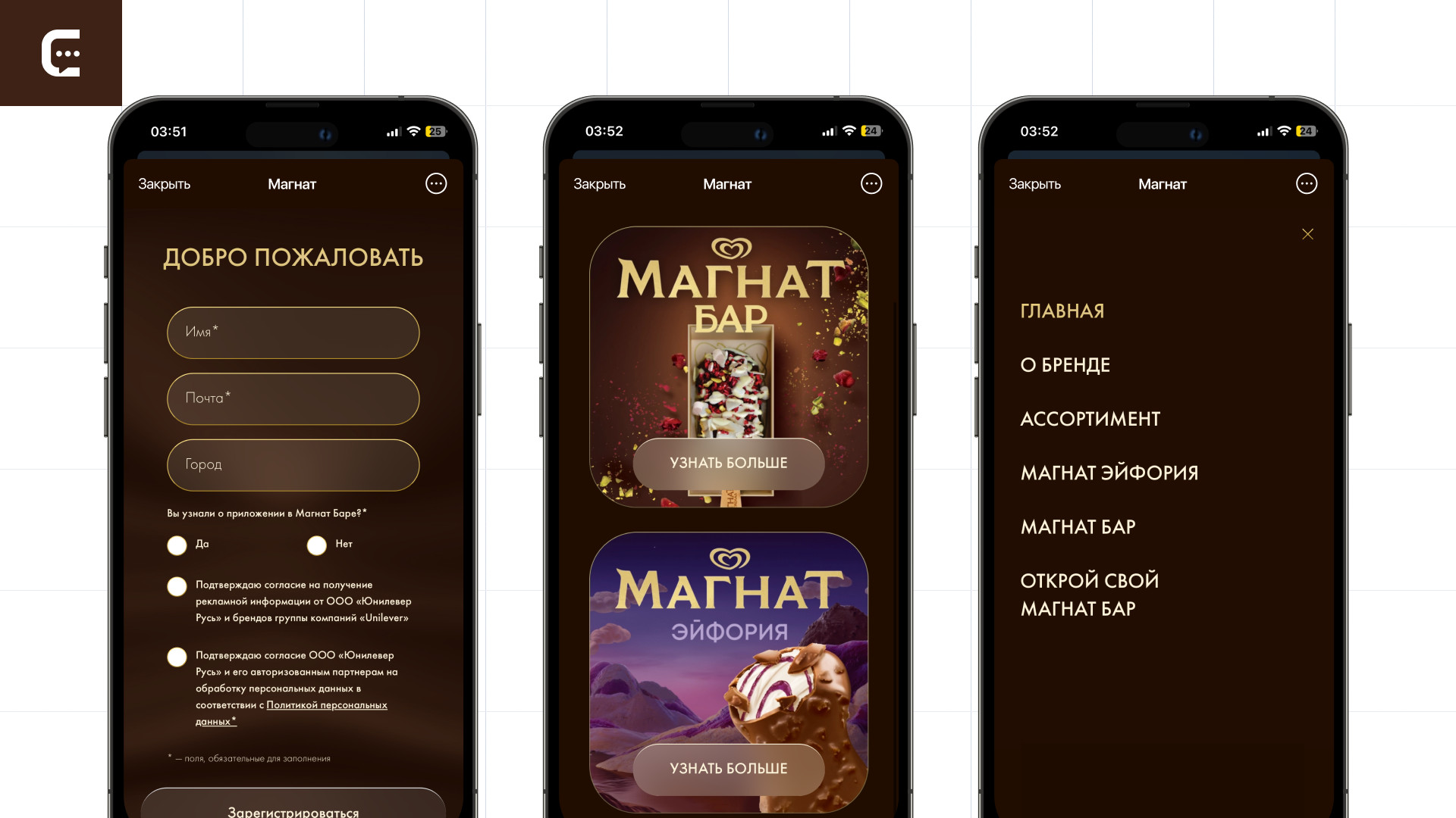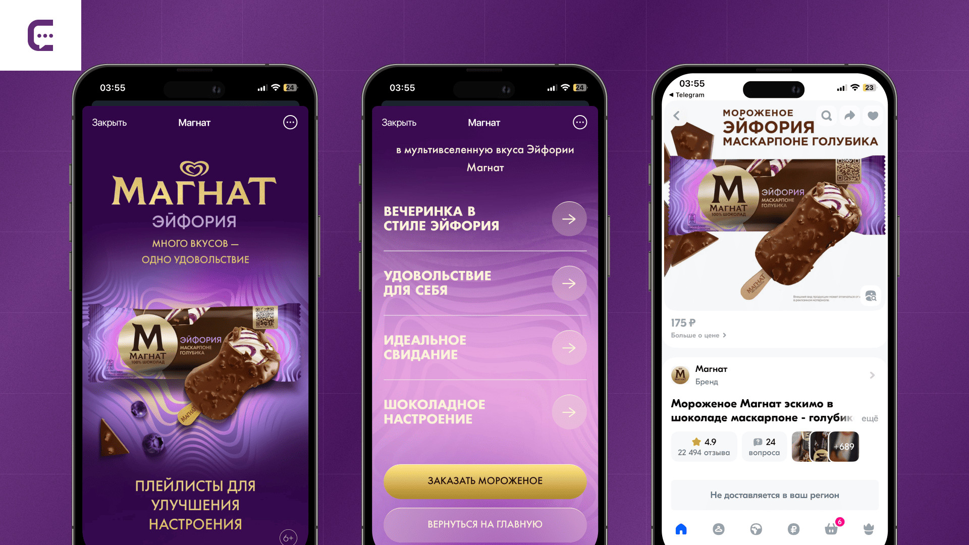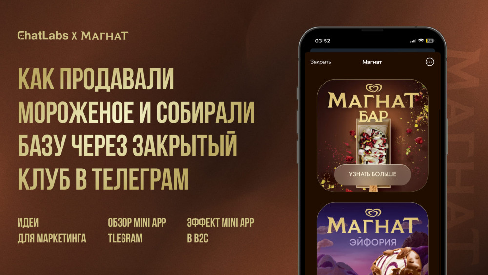 Бренд рассчитывал, что с помощью Mini App Telegram решит стратегические и тактические маркетинговые задачи. Только 21 марта 2024 удалось согласовать все детали реализации. Для команды ChatLabs это был вызов: за 10 дней разработать мини-приложение, провести нагрузочное и функциональное тестирование, развернуть проект и даже внести доработки (забегая вперед — потребовалось всего 2 итерации). Web App для мороженого Ингман — классический спецпроект в Телеграм. Мы в ChatLabs разрабатывали аналогичные digital-решения — например, чат-бот для розыгрыша Sokolov или чат-бот чекового промо для Lit Energy. Общая информация о спецпроекте: Специалисты по продвижению FMCG-продуктов в on- и off-trade часто сталкиваются с проблемами: конкуренты предлагают одинаковые промо, а аудитория устала от однотипных акций в стиле «Собери 6 наклеек, получи сковородку в подарок». Маркетинговые спецпроекты в Телеграм — это один из вариантов, как повысить узнаваемость и лояльность, увеличить продажи, вызвать вау-эффект. Механики и примеры реализации Web App для TG представлены в разделе «Кейсы». В TMA для Ингман реализовали механику закрытого клуба. Его участники получают бонусы: Информация о закрытом клубе распространялась дозированно: он создан «не для всех». На этапе привлечения аудитории использовали ссылки на сайте, QR-коды и консультации на мероприятиях. В частности, точки продаж (Магнат Бары) работали на VK Fest, молодежном форуме YouLead, фестивале Инстадиум. Поскольку клуб позиционировался закрытым, не использовали виральные механики или платный трафик. Для входа в закрытый клуб нужен «пропуск» — запуск Mini App и заполнение формы в мини-приложении: Пользовательские данные попадают в CRM и веб-админку мини-приложения. В будущем с ними можно работать: например, чтобы отправлять «догоняющие» или «реанимирующие» push-уведомления в Телеграм, сегментировать базу и запускать email-рассылку. После заполнения анкеты пользователю доступны два события внутри клуба: Эти события работают на вовлечение и удержание пользователей в рамках промо. «Магнат Бар» — меню, где за 4 шага пользователь собирает собственное мороженое. Делается это на основе персональных предпочтений: одни любят эскимо без глазури, а другим нравится шоколад в шоколаде, покрытый шоколадом. Механика создания десерта в мини-приложении подразумевает 4 шага, пройти которые можно за 30 секунд: На последнем этапе участник акции получает комплимент («У тебя отличный вкус») и инструкцию, что делать дальше — показать скриншот экрана на Магнат Баре и получить скидку. Также можно открыть карту Магнат Баров в 11+ городах: Москва, Сочи, Санкт-Петербург, Казань, Новосибирск, Ростов-на-Дону, Екатеринбург. Магнат Бар в мини-приложении Телеграм позволяет решить несколько маркетинговых задач: вовлечение пользователя, персонализированный опыт, знакомство с продуктовой линейкой, стимулирование сезонных продаж. Концепция раздела «Магнат Эйфория» — услышать, как звучит вкус любимого мороженого. Переложили вкусовые рецепторы на ноты и получили 4 плейлиста под любое настроение для полного погружения в мультивселенную вкуса Эйфории Магнат: Нейротреки позволяют решить несколько маркетинговых задач: удержать пользователя в приложении, познакомить с разными видами мороженого (SKU), предложить купить десерт с понравившейся мелодией. После реализации основной функцион