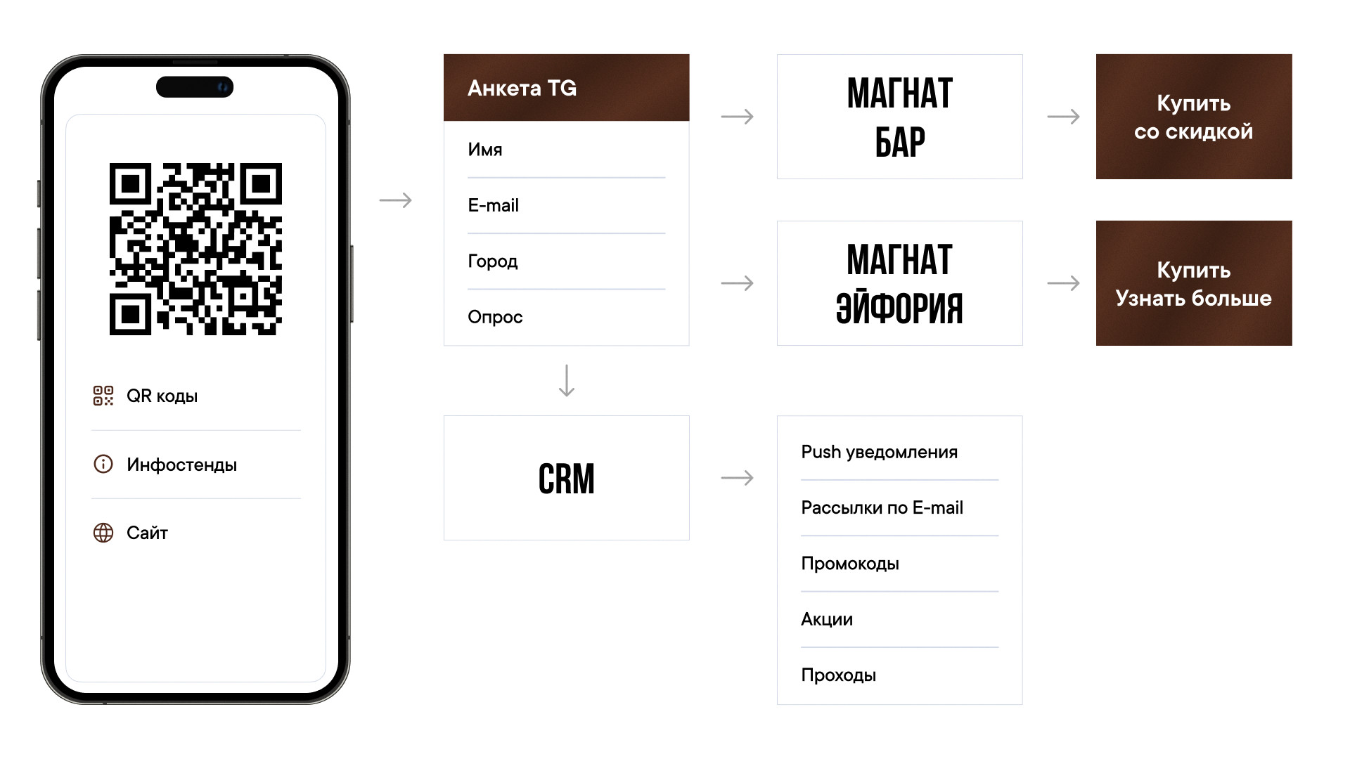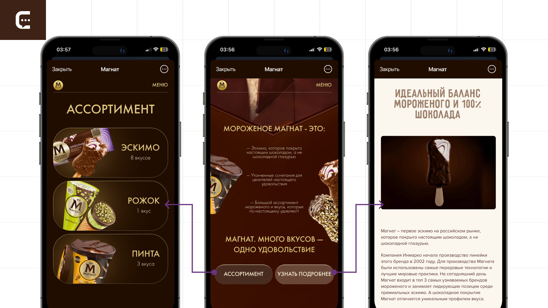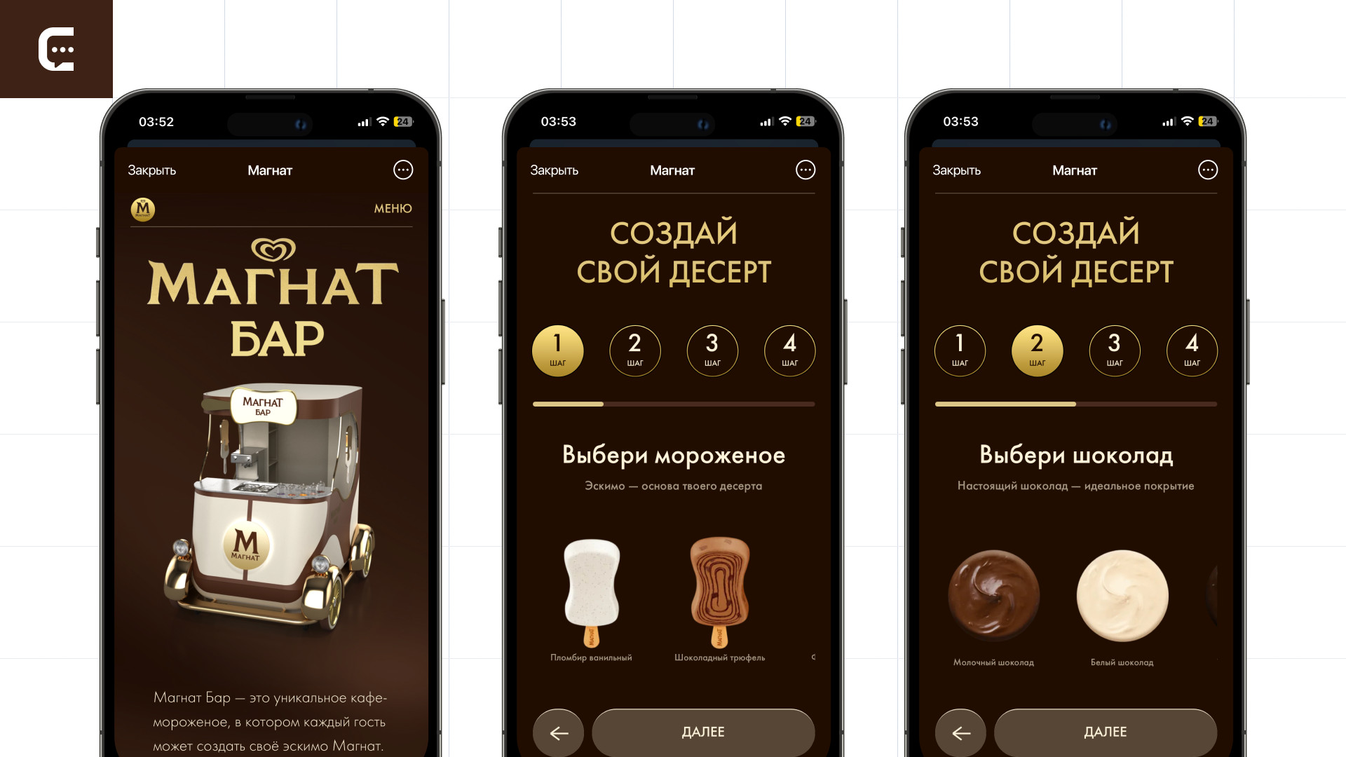 Бренд рассчитывал, что с помощью Mini App Telegram решит стратегические и тактические маркетинговые задачи. Только 21 марта 2024 удалось согласовать все детали реализации. Для команды ChatLabs это был вызов: за 10 дней разработать мини-приложение, провести нагрузочное и функциональное тестирование, развернуть проект и даже внести доработки (забегая вперед — потребовалось всего 2 итерации). Web App для мороженого Ингман — классический спецпроект в Телеграм. Мы в ChatLabs разрабатывали аналогичные digital-решения — например, чат-бот для розыгрыша Sokolov или чат-бот чекового промо для Lit Energy. Общая информация о спецпроекте: Специалисты по продвижению FMCG-продуктов в on- и off-trade часто сталкиваются с проблемами: конкуренты предлагают одинаковые промо, а аудитория устала от однотипных акций в стиле «Собери 6 наклеек, получи сковородку в подарок». Маркетинговые спецпроекты в Телеграм — это один из вариантов, как повысить узнаваемость и лояльность, увеличить продажи, вызвать вау-эффект. Механики и примеры реализации Web App для TG представлены в разделе «Кейсы». В TMA для Ингман реализовали механику закрытого клуба. Его участники получают бонусы: Информация о закрытом клубе распространялась дозированно: он создан «не для всех». На этапе привлечения аудитории использовали ссылки на сайте, QR-коды и консультации на мероприятиях. В частности, точки продаж (Магнат Бары) работали на VK Fest, молодежном форуме YouLead, фестивале Инстадиум. Поскольку клуб позиционировался закрытым, не использовали виральные механики или платный трафик. Для входа в закрытый клуб нужен «пропуск» — запуск Mini App и заполнение формы в мини-приложении: Пользовательские данные попадают в CRM и веб-админку мини-приложения. В будущем с ними можно работать: например, чтобы отправлять «догоняющие» или «реанимирующие» push-уведомления в Телеграм, сегментировать базу и запускать email-рассылку. После заполнения анкеты пользователю доступны два события внутри клуба: Эти события работают на вовлечение и удержание пользователей в рамках промо. «Магнат Бар» — меню, где за 4 шага пользователь собирает собственное мороженое. Делается это на основе персональных предпочтений: одни любят эскимо без глазури, а другим нравится шоколад в шоколаде, покрытый шоколадом. Механика создания десерта в мини-приложении подразумевает 4 шага, пройти которые можно за 30 секунд: На последнем этапе участник акции получает комплимент («У тебя отличный вкус») и инструкцию, что делать дальше — показать скриншот экрана на Магнат Баре и получить скидку. Также можно открыть карту Магнат Баров в 11+ городах: Москва, Сочи, Санкт-Петербург, Казань, Новосибирск, Ростов-на-Дону, Екатеринбург. Магнат Бар в мини-приложении Телеграм позволяет решить несколько маркетинговых задач: вовлечение пользователя, персонализированный опыт, знакомство с продуктовой линейкой, стимулирование сезонных продаж. Концепция раздела «Магнат Эйфория» — услышать, как звучит вкус любимого мороженого. Переложили вкусовые рецепторы на ноты и получили 4 плейлиста под любое настроение для полного погружения в мультивселенную вкуса Эйфории Магнат: Нейротреки позволяют решить несколько маркетинговых задач: удержать пользователя в приложении, познакомить с разными видами мороженого (SKU), предложить купить десерт с понравившейся мелодией. После реализации основной функцион