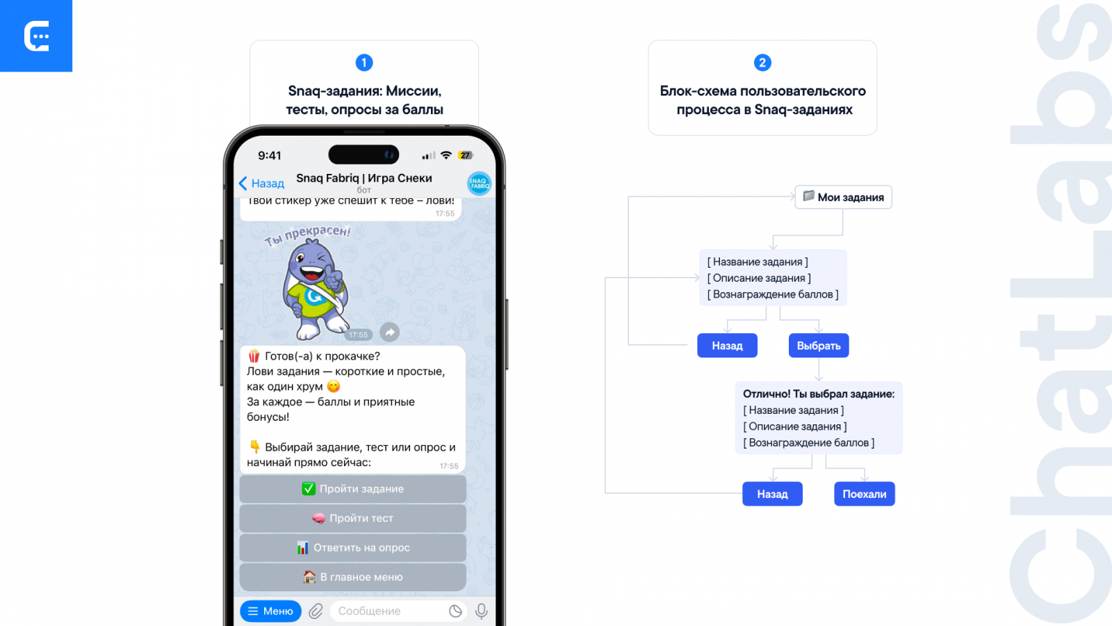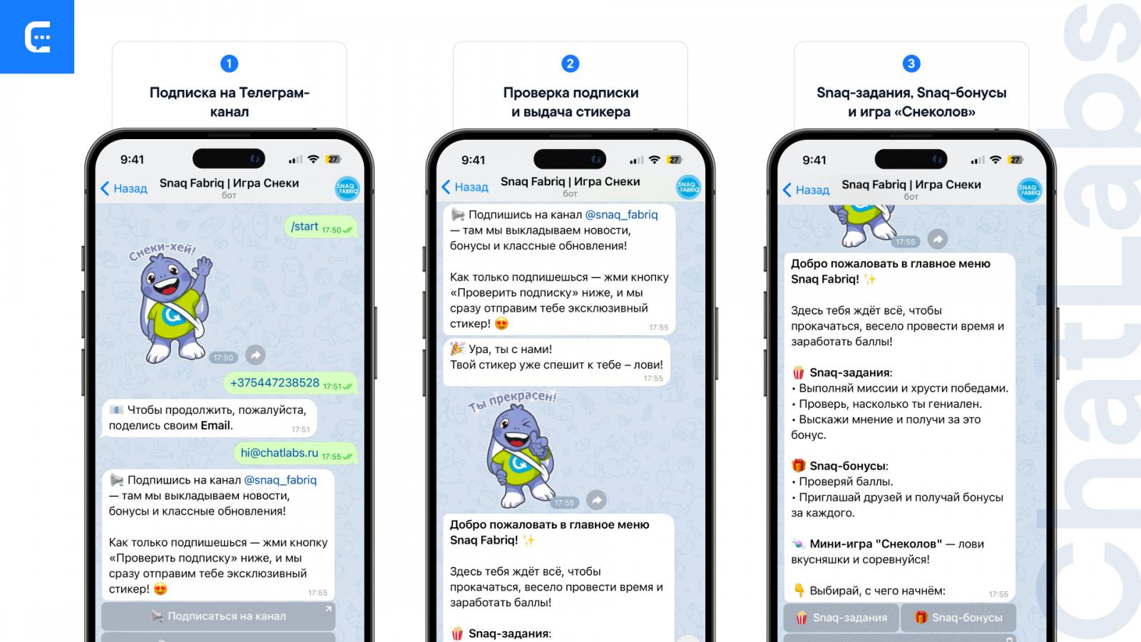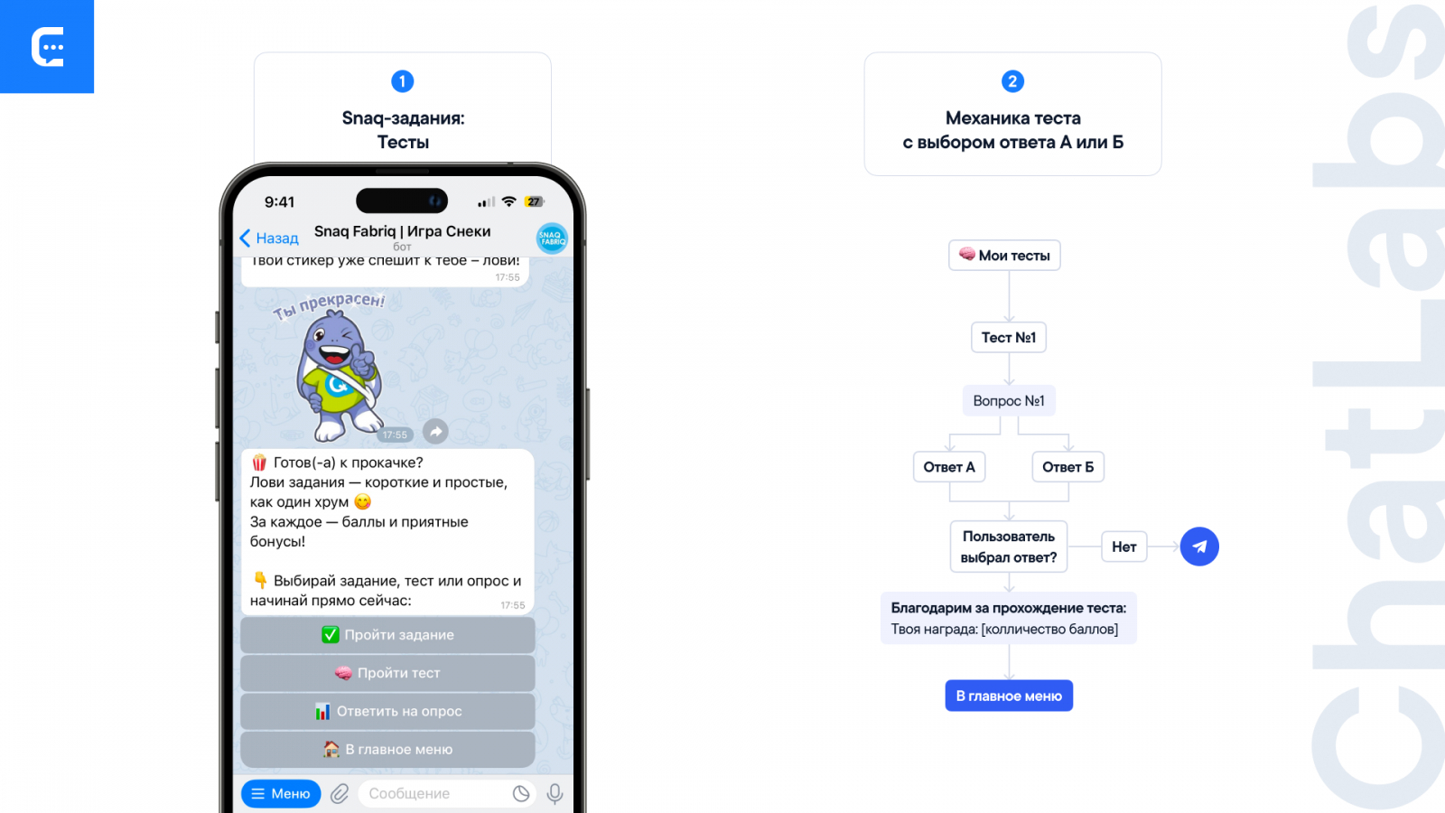 В условиях с 1 сентября 2025 года, когда каналов рекламы становятся все меньше, бренды ищут альтернативные способы продвижения и взаимодействия с аудиторией. Один из таких форматов — спецпроекты в мессенджерах Телеграм, Вконтакте, MAX. Технически промоактивности могут проводиться с использованием ботов и Mini App: Для Snaq Fabriq разработчики ChatLabs создали программу лояльности с геймификацией в Телеграм. Технически это связка Телеграм-бота и мини-приложения, которая позволяет закрыть сразу несколько задач бизнеса: сбор данных аудитории, увеличение подписчиков, повышение продаж, получение отзывов и обратной связи. Вместо Телеграма можно использовать отечественные мессенджеры: MAX, VKontakte. Программа лояльности для пользователя проста: заработал баллы —> потратил в интернет-магазине. В центре бонусной системы — баллы (очки). Механика работы виртуальной валюты подразумевает ее «зарабатывание». Баллы начисляются за: Каждая из механик в рамках спецпроекта может содержать риски. Например, при запуске реферальной программы «Пригласи друга» возможны проблемы фрода, спама по друзьям, получения невалидных данных. Как правило, это исправляется валидацией на входе. В случае с опросами, тестами и заданиями часто сложно рассчитать механику начисления: пропорционально правильным ответам, всего за прохождение и т.д. Кроме этого, в «миссиях» и «заданиях» возникает соблазн обмануть систему: прислать отфотошопленный скрин, старую фотографию полки, несуществующий отзыв на маркетплейсе. Решается внедрением дополнительного этапа — модерация и одобрение со стороны администратора. Поэтому в ChatLabs рекомендуют заранее продумывать механику спецпроекта и учитывать риски. Мы подготовили чек-лист с разбором этапов и ошибок запуска Mini App. Скачивайте и используйте его, чтобы изначально закладывать правильную архитектуру и не переделывать мини-приложения. Программа лояльности Snaq Fabriq в мессенджере Телеграм подразумевала начисление баллов за активности: Бонусные баллы можно было потратить при заказе в интернет-магазине бренда. Пользователь добавлял товар в корзину и выбирал «Списать бонусные баллы». Воронка Телеграм-бота и Mini App создана с учетом ToV компании. Дополнительно продуманы UX-сценарии с вовлекающими механиками. Например, участника акции сопровождает герой-маскот. Персонаж появляется на подарочных стикерах и выступает элементом брендирования. В отдельной инструкции рассказывали, как SOKOLOV смог при помощи спецпроекта увеличить аудиторию и привести новых подписчиков в Телеграм-канал. Механика раскрутки канала в Telegram подразумевает простые шаги: Очки будут доступны и за другие активности в Телеграм-боте. Это позволяет бизнесу в рамках одного спецпроекта закрывать разные задачи: сбор обратной связи, формирование лояльности, удержание, продажи. Механика набора аудитории переносится в другие мессенджеры: MAX, Vkontakte. Когда условия выполнены, участник попадает в главное меню. Из него возможен доступ к разделам: Для сбора отзывов бизнес использует разные методы. Например, это могут быть: По разным исследованиям, только 18% покупателей готовы поделиться опытом, если продавец попросит. При этом шансы получить отзыв увеличиваются почти в два раза, если у пользователя будет мотивация. Возможные варианты — скидки на следующую покупку, подарки, участие в розыгр