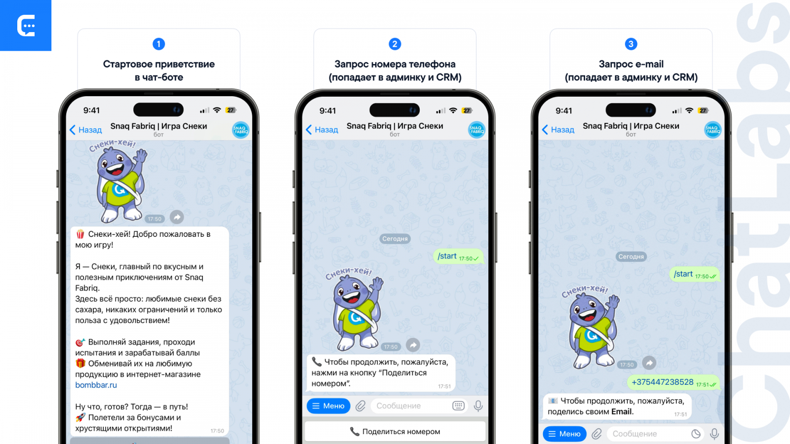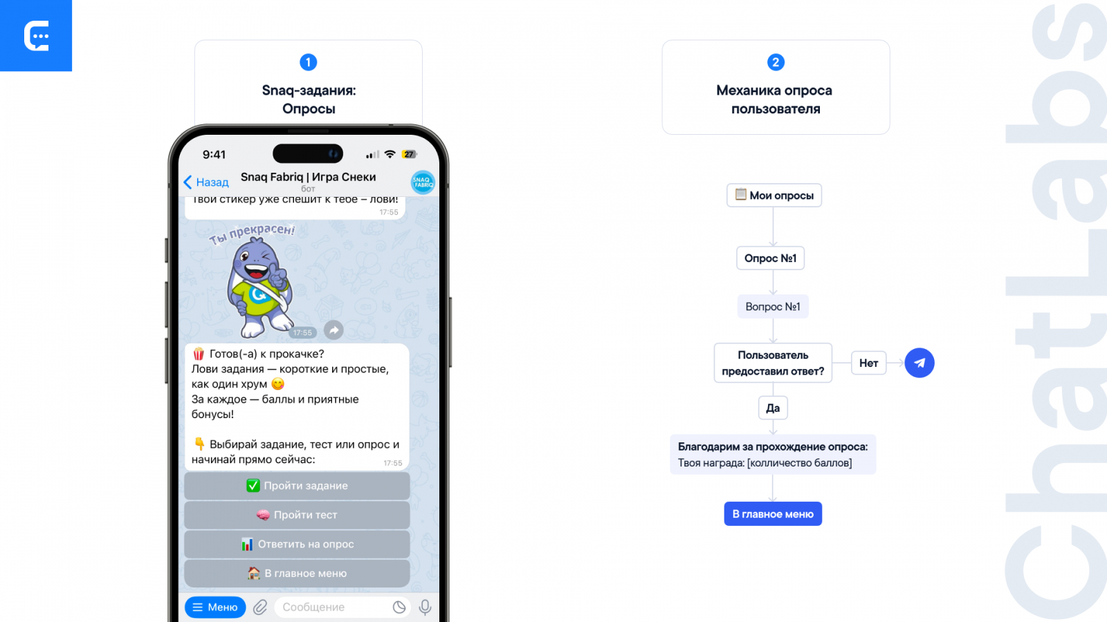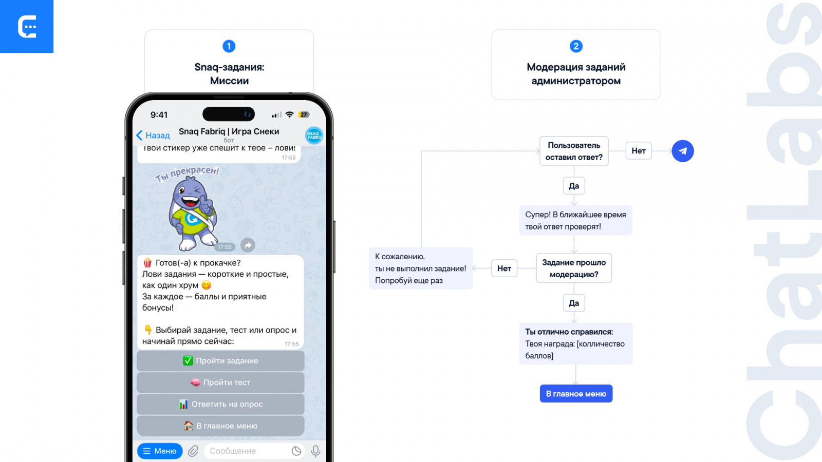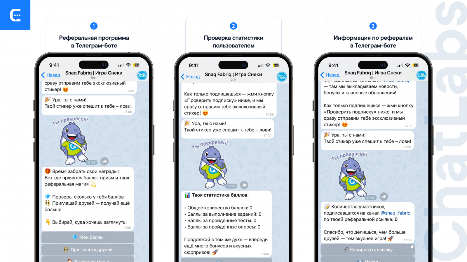 В условиях с 1 сентября 2025 года, когда каналов рекламы становятся все меньше, бренды ищут альтернативные способы продвижения и взаимодействия с аудиторией. Один из таких форматов — спецпроекты в мессенджерах Телеграм, Вконтакте, MAX. Технически промоактивности могут проводиться с использованием ботов и Mini App: Для Snaq Fabriq разработчики ChatLabs создали программу лояльности с геймификацией в Телеграм. Технически это связка Телеграм-бота и мини-приложения, которая позволяет закрыть сразу несколько задач бизнеса: сбор данных аудитории, увеличение подписчиков, повышение продаж, получение отзывов и обратной связи. Вместо Телеграма можно использовать отечественные мессенджеры: MAX, VKontakte. Программа лояльности для пользователя проста: заработал баллы —> потратил в интернет-магазине. В центре бонусной системы — баллы (очки). Механика работы виртуальной валюты подразумевает ее «зарабатывание». Баллы начисляются за: Каждая из механик в рамках спецпроекта может содержать риски. Например, при запуске реферальной программы «Пригласи друга» возможны проблемы фрода, спама по друзьям, получения невалидных данных. Как правило, это исправляется валидацией на входе. В случае с опросами, тестами и заданиями часто сложно рассчитать механику начисления: пропорционально правильным ответам, всего за прохождение и т.д. Кроме этого, в «миссиях» и «заданиях» возникает соблазн обмануть систему: прислать отфотошопленный скрин, старую фотографию полки, несуществующий отзыв на маркетплейсе. Решается внедрением дополнительного этапа — модерация и одобрение со стороны администратора. Поэтому в ChatLabs рекомендуют заранее продумывать механику спецпроекта и учитывать риски. Мы подготовили чек-лист с разбором этапов и ошибок запуска Mini App. Скачивайте и используйте его, чтобы изначально закладывать правильную архитектуру и не переделывать мини-приложения. Программа лояльности Snaq Fabriq в мессенджере Телеграм подразумевала начисление баллов за активности: Бонусные баллы можно было потратить при заказе в интернет-магазине бренда. Пользователь добавлял товар в корзину и выбирал «Списать бонусные баллы». Воронка Телеграм-бота и Mini App создана с учетом ToV компании. Дополнительно продуманы UX-сценарии с вовлекающими механиками. Например, участника акции сопровождает герой-маскот. Персонаж появляется на подарочных стикерах и выступает элементом брендирования. В отдельной инструкции рассказывали, как SOKOLOV смог при помощи спецпроекта увеличить аудиторию и привести новых подписчиков в Телеграм-канал. Механика раскрутки канала в Telegram подразумевает простые шаги: Очки будут доступны и за другие активности в Телеграм-боте. Это позволяет бизнесу в рамках одного спецпроекта закрывать разные задачи: сбор обратной связи, формирование лояльности, удержание, продажи. Механика набора аудитории переносится в другие мессенджеры: MAX, Vkontakte. Когда условия выполнены, участник попадает в главное меню. Из него возможен доступ к разделам: Для сбора отзывов бизнес использует разные методы. Например, это могут быть: По разным исследованиям, только 18% покупателей готовы поделиться опытом, если продавец попросит. При этом шансы получить отзыв увеличиваются почти в два раза, если у пользователя будет мотивация. Возможные варианты — скидки на следующую покупку, подарки, участие в розыгр