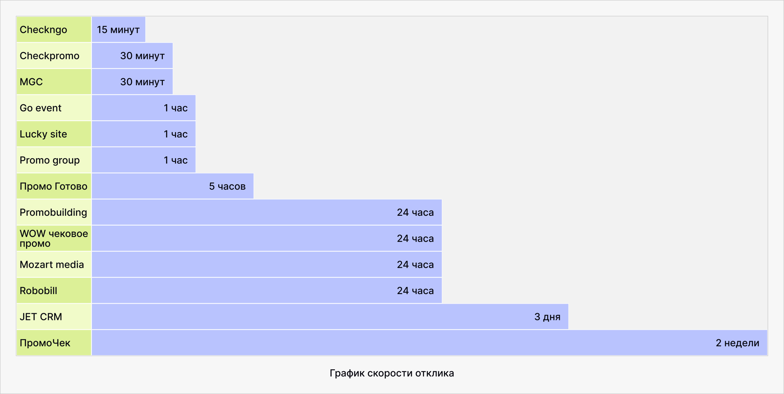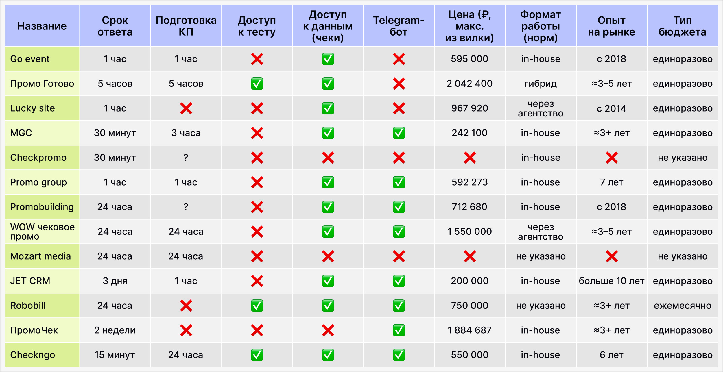 Первое впечатление о платформе складывается уже на этапе взаимодействия с менеджерами. Быстрая реакция — это не просто «приятный бонус», а реальный показатель заинтересованности и выстроенных процессов внутри компании. Если оператор не может быстро организовать звонок, что будет с промо-кампанией, тем более срочной? Мы проверили такие показатели: Уже на этом этапе много компаний отвалились. Были такие, кто перезванивал сразу же и сходу предлагали варианты работы. Другие компании перезвонили через 3 дня (например, JET CRM), а некоторые даже через 2 недели (ПромоЧек). *Для справки, среднее время ответа Checkngo — 15 минут в рабочее время. Особенно отметились такие компании: Большинство других компаний ответили в течение дня или на следующий день. После знакомства с менеджерами мы перешли к следующему этапу — получению коммерческого предложения. Это важный момент: по КП легко понять, насколько компания поняла задачу, готова ли подстраиваться под клиента и умеет ли считать полную экономику промо. Мы запросили документы у всех, с кем удалось установить контакт, и оценили: Конечно, некоторые не отправляют коммерческое предложение без конкретики. Для этого иногда просят заполнить бриф или подробнее ответить на вопросы (иногда даже слишком подробно, как например WOW Чековые промо). В других случаях КП отправляют только после решения о сотрудничестве (как Checkpromo). В итоге получились такие результаты: Отдельно мы оценивали гибкость в подходе. Некоторые компании готовы подстраивать стоимость под объемы, формат и даже специфику бренда (как Checkngo), другие же придерживаются жесткого прайса. Такая разница может сильно повлиять на итоговую экономику кампании — особенно если промо запускается в тестовом режиме. В идеале, при выборе платформы для чекового промо хочется увидеть, как всё работает вживую: полистать личный кабинет, протестировать механику, посмотреть, как выглядит лендинг. Но на практике далеко не все игроки рынка готовы открывать завесу и делиться действующими кейсами. На самом деле, только несколько компаний готовы показать тестовую версию или хотя бы примеры реализованных промо. С другой стороны платформы, которые не предоставляют демо вовсе — даже по запросу. Кто-то ограничивается КП, кто-то вовсе пропадает после первого контакта. Например: Если коротко, демоверсия платформы — это симулятор, в рамках которого можно пройти весь пользовательский путь: зарегистрироваться, загрузить чеки, провалидировать их и поучаствовать в розыгрыше. Она нужна, чтобы показать работу платформы потенциальным заказчикам изнутри от лица пользователя. Демо-платформа Checkngo. Демо-бот Checkngo. Кейсы Но самым важным этапом для любой компании, запускающей акцию, является её реализация. Мы изучили, как проходят запуски разных платформ, какие возможности для интеграции и дополнительные функции они предлагают. На этом этапе обсуждаются самые важные вопросы — сколько времени займёт запуск промо, какой бюджет акции и как рассчитывается и какие дополнительные инструменты могут помочь сделать акцию более успешной. Мы оценивали это по таким критериям: Процесс реализации промо может сильно варьироваться в зависимости от компании. Некоторые платформы предлагают быстрые решения с минимальными сроками реализации, другие же предоставляют возможность для глубокой к