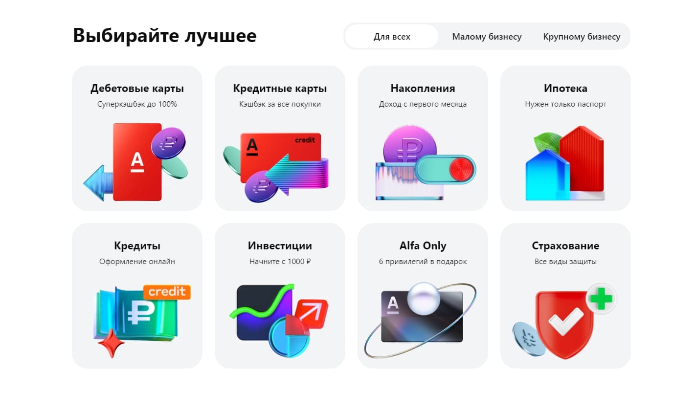 Этот тренд представлен в виде карточек. Их используют маркетплейсы, магазины и даже банки. Сейчас такой прием можно увидеть не только на разных сайтах, но и в десятках приложений. Карточки объединены похожими по смыслу частями. Они рассказывают о «плюсах» сотрудничества с компанией, способах доставки или товарах из разных категорий. Сайт Альфа-Банка — простая и понятная иллюстрация удачного использования этого тренда. Пользователь открывает ресурс — и ему комфортно искать информацию. Все благодаря минималистичному оформлению и интуитивно понятной навигации. Помогают «не заблудиться» поисковик и конфигуратор. А дизайн-система в формате карточек рассказывает клиентам банка о преимуществах компании и ее продуктах.