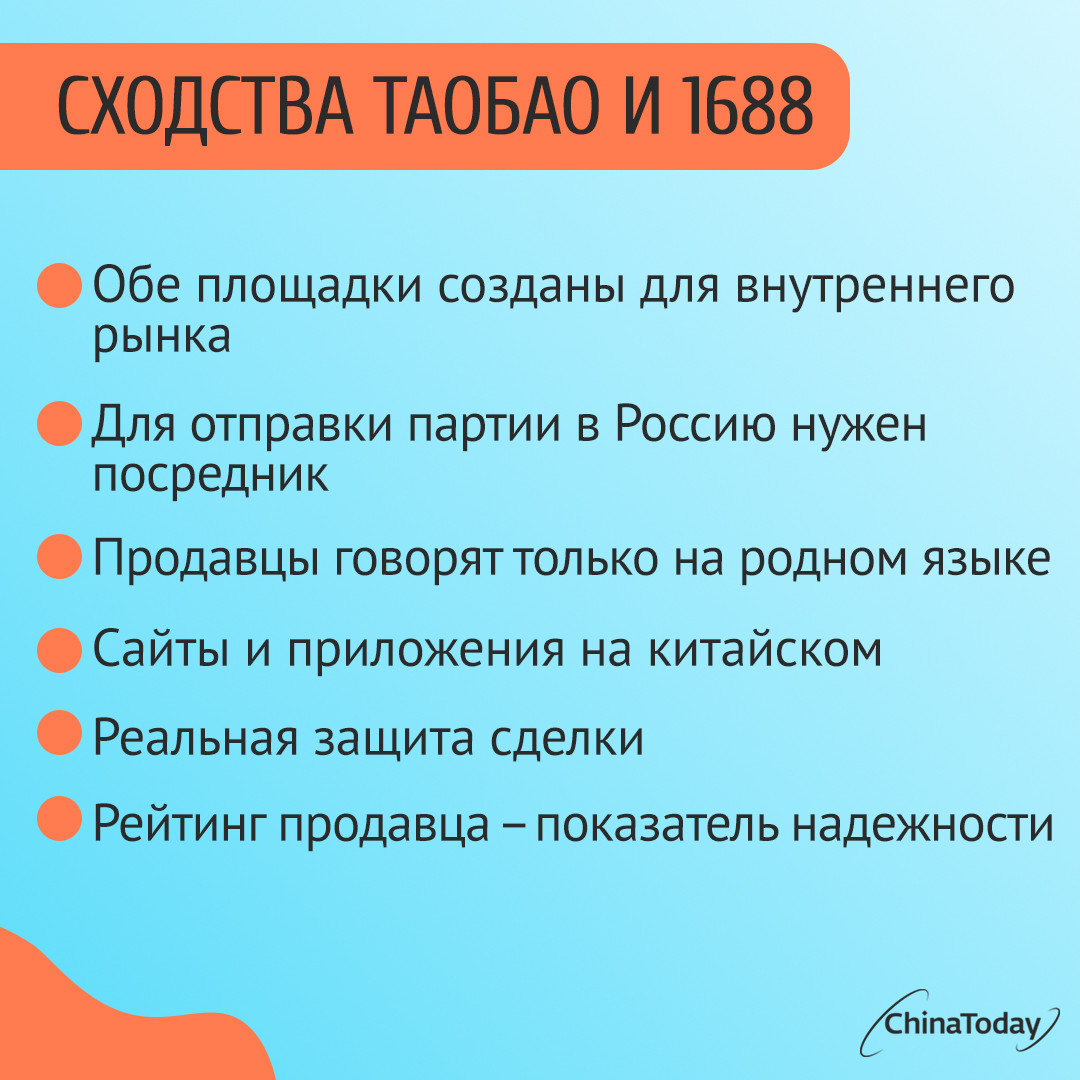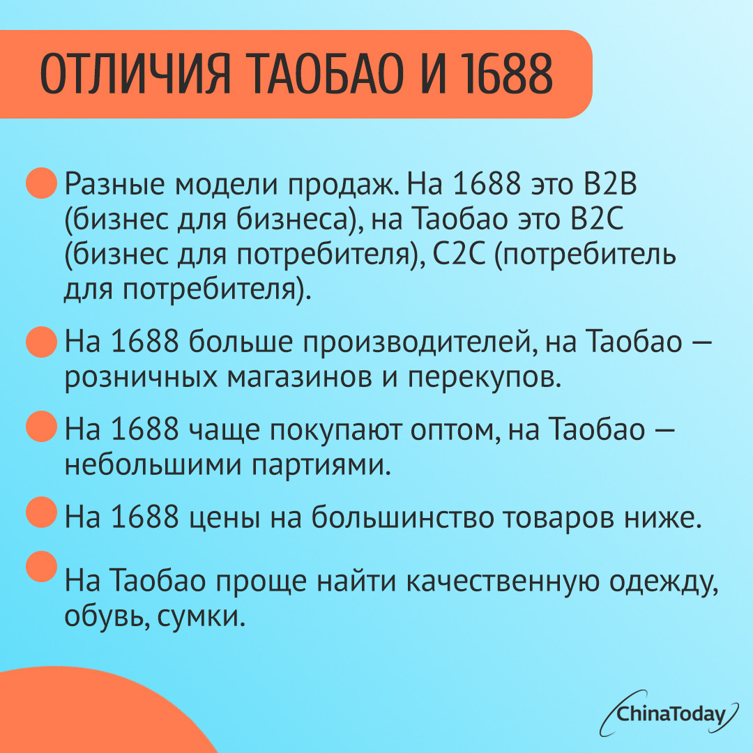 Основное отличие — в ориентации на разных потребителей: 1688 — крупный опт для китайских покупателей, Алибаба — опт для покупателей по всему миру, Таобао — розница для внутреннего китайского рынка.