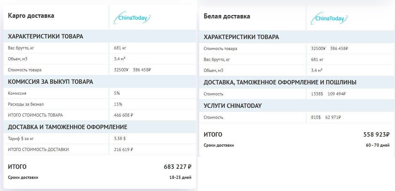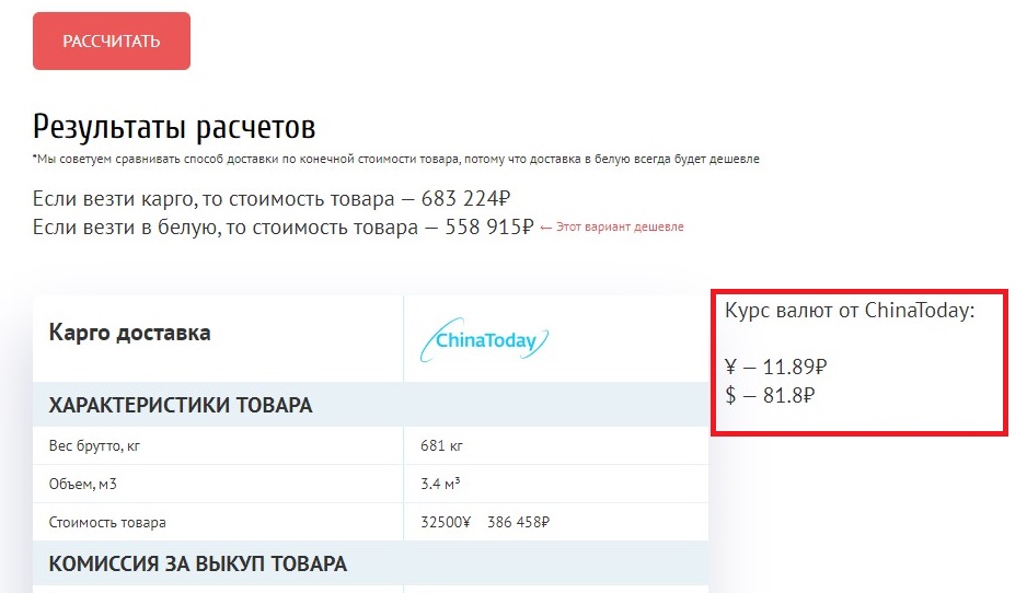 Мы давно придумали и создали карго-калькулятор доставки из Китая. Предприниматели им активно пользуются. Но сейчас мы пошли дальше: настроили калькулятор так, что теперь он считает два варианта доставки — карго и в белую. Пользователь может сравнить и решить, как ему выгоднее везти. 1. Зайдите на страницу калькулятора → 2. Укажите вес, объем, стоимость товара в юанях. При этом: 3. Выберете способ оплаты: — Наличными; — Безналичный — на р/с со счета юридического лица. Такой способ добавит +15% к расходам на карго доставку. Подойдет, если нужны документы на груз: накладная по форме Торг-12, договор купли-продажи. 4. Нажмите на кнопку «Рассчитать». 5. Готово! Всего 3 поля для заполнения, 2 кнопки и несколько секунд времени — и перед вами предварительный расчет стоимости доставки из Китая вашего товара двумя разными способами. 1. Тариф на белую доставку морем всегда ниже, чем карго. Но итоговая стоимость товара в России сильно зависит от таможенных пошлин, НДС и сертификации. Поэтому калькулятор считает эти статьи расходов по средним показателям: — Пошлина — 6,5% — НДС — 20% — Обязательная сертификация — нет (0 рублей). 2. Курс валют, по которому программа переводит юани и доллары в рубли — справа от результатов расчетов. 3. Калькулятор, как и любой софт, не может учитывать все нюансы, как это сделает человек. Чтобы узнать точный расчет доставки от эксперта по логистике — жмите на кнопку внизу страницы. На этом обзор сервиса для предпринимателей считаем завершенным. Надеемся, он поможет вам вести бизнес с Китаем быстро, просто и эффективно. Рассчитать цену доставки из Китая на калькуляторе онлайн →