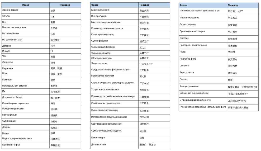 «Хорошо, сделаем вовремя, цена Х юаней», — стандартный ответ поставщика. А потом выясняется, что одно выполнить продавец не может, за другое придется доплатить, а срок производства и цена значительно увеличиваются. Чтобы такого не произошло, обсуждайте каждое требование к товару отдельно, по пунктам. Вот как описывает работу с китайцами наш специалист по ВЭД: «По своему опыту могу сказать, что если есть возможность, лучше не пытайтесь самостоятельно вести переговоры с поставщиками. В лучшем случае, потеряете время, а в худшем — неверно донесете требования до поставщика и получите совсем не то, что хотели. Делайте четкое и понятное ТЗ, подкрепляйте договоренности документами». Китайцы любят большие заказы, а за небольшие партии в 100-300 штук берутся неохотно. Если нужен мелкий опт, наберитесь терпения: вам будут медленно отвечать, долго отгружать товар. Еще одна хитрость китайских продавцов: выполнить первый заказ дешево, а на последующие поднять цены. Причины называют разные: удорожание материалов, увеличение расходов на зарплату, мировой кризис. Клиент решил сам общаться с поставщиком. Вбивает в гугл-переводчик «Давайте с вами обсудим брак» → получает сочетание 让我们讨论婚姻 → отправляет продавцу → тот в шоке и не понимает, что от него хотят. На самом деле 让我们讨论婚姻 означает для китайцев брак между мужчиной и женщиной. Еще пример: попросите гугл-переводчик перевести на китайский слово «мята»: переводит правильно — 薄荷. А теперь эти же иероглифы попробуйте перевести на русский — получите «монетный двор». И еще ↓ Думаем, этого достаточно, чтобы убедиться, насколько порой абсурдным бывает машинный перевод. Помните, что в китайском языке многое зависит от контекста. Если общайтесь с поставщиком самостоятельно: 1. Используйте короткие, односложные фразы. Чем проще фраза, тем больше вероятности, что продавец вас поймет с первого раза. 2. Вместо Google Переводчика используйте сервис bkrs.info. БКРС разбивает фразу на слова, показывает похожие по смыслу словосочетания. 3. В гугл-переводчике перевод будет точнее, если перевести фразу с русского на английский → с английского на китайский → с китайского на русский. Так вы убедитесь, что смысл фразы сохранен. 4. Текст на китайском с картинки переводите через Baidu Translate. 5. Используйте прямой порядок слов: подлежащее → сказуемое → все остальное. Если в предложении есть время, дата, число, пишите их после подлежащего или в начале предложения: 6. Чтобы задать вопрос, в конце предложение добавьте иероглиф 吗 (вопросительная частица). Но можно и просто поставить вопросительный знак, большинство вас поймет. Есть товар в наличии? — 产品有货? Подготовили список слов, которые понадобятся при работе с китайскими поставщиками. Воспользуйтесь помощью человека, который профессионально проведет переговоры с поставщиками. В ChinaToday с продавцами общаются специалисты по ВЭД. Они в совершенстве владеют китайским языком, умеют провести переговоры правильно: Заполняйте заявку — все хлопоты по общению с китайскими продавцами возьмем на себя. Найдем поставщика под ваш запрос, проведем переговоры, доставим груз на ваш склад в России.
