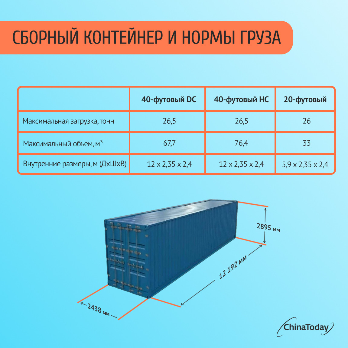 Стандартный контейнер — 40 футовый Dry Freight Container (DC) или High Cube (HC). Вмещает груз объемом до 67,7 м³ и весом до 26 тонн. Это самый распространенный и выгодный вариант. Второй по популярности — 20-футовый контейнер, он вмещает 28-33 м³ грузов. Но используется реже, потому что: