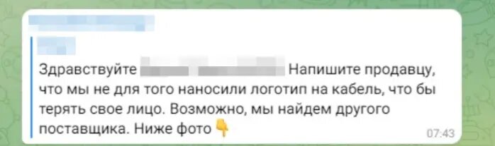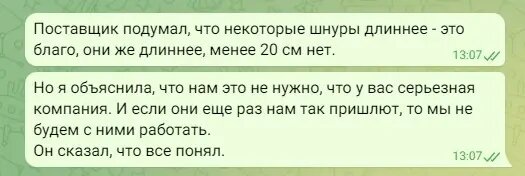 Особенность нашего случая в том, что бракованные кабели производились под логотипом клиента. Поэтому было важно поддерживать соответствующее качество и репутацию компании. Клиент передал свои претензии нашему специалисту по ВЭД, Дарье. Она провела с поставщиком разъяснительную беседу и уточнила: такие расхождения в товарах недопустимы. А также сообщила, что при повторении ситуации компания будет вынуждена найти другого поставщика. Продавец понял свою ошибку и пообещал, что такого не повторится. Переговоры — первое, с чего следует начать. Поставщик, который стремится к наращиванию бизнеса, точно так же не хочет терять свою репутацию и постоянного клиента. При общении избегайте: Четко разъясните свою позицию, учитывайте разницу в менталитете (из-за нее, собственно, и возникла проблема). Обязательно уточните, что повторное нарушение соглашения приведет к разрыву сотрудничества. Удобнее всего общаться напрямую через китайский мессенджер WeChat. Но не забудьте про разницу во времени. Если в Москве 20:00, то в Иу уже час ночи — не лучшее время для переговоров. Почему мы при проверке не заметили расхождения в размерах? Ведь все поставки проходят через китайский склад ChinaToday. Ответ прост: клиент не просил их измерять. Он и подумать не мог, что это потребуется. А сотрудники склада проверяют тысячи товаров. Они просто не могли знать, какая длина шнура нужна клиенту и важно ли это. А тех.задания на проверку не было. Поэтому на складе проверили шнуры зрительно: товар совпадает, количество соответствует. Теперь клиент напишет ТЗ для склада — пожелания, как проверять его товар. И включит пункт об измерении длины. Ранее заказчик уже составлял ТЗ на проверку для других своих заказов. Несколько советов по составлению тех. задания для работников склада: Если возите товары из Китая с ChinaToday, менеджер поможет составить грамотное, предельно понятное тех. задание на проверку. Если ситуация возникнет во второй раз, рекомендуем смело брать поставщика из предварительно составленного списка и заключать новый контракт. Конечно, если есть такая возможность. Чтобы быстро справляться с подобными проблемами, возите грузы с ChinaToday. Заполняйте заявку: бесплатно посчитаем, сколько будет стоить доставка вашего товара из Китая — карго или в белую. Мы сами найдем поставщиков, договоримся с ними и поставке, проверим товар на складе и доставим в Россию.