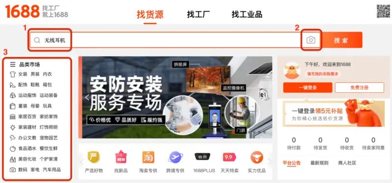 - Переведите название нужного товара на китайский, вставьте в поисковую строку сверху на сайте (1). Искать можно также по картинке (2) или по категориям слева (3).