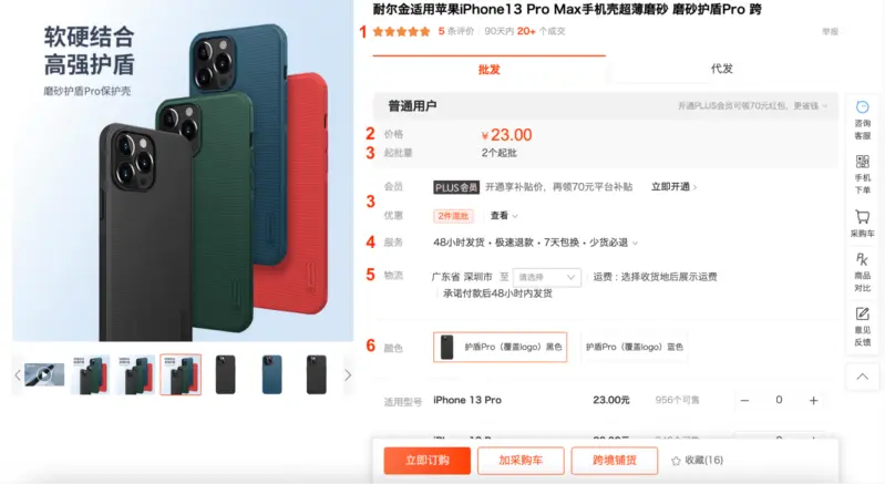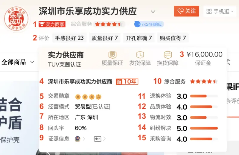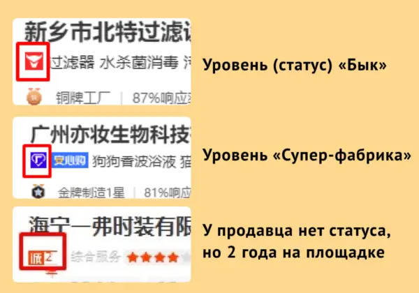 Для этого снизу выберите второй слева фильтр по количеству сделок — 成交额. Также можно фильтровать товары по цене — 价格 или задать диапазон цен в юанях. Делимся полезными функциями и лайфхаками, которыми пользуются наши переводчики при поиске поставщиков и товаров: 1. Если не знаете название товара на китайском, сначала запустите поиск по фото, а потом в карточке или названии товара найдите его правильное написание. 2. Через строку поиска можно искать и конкретного производителя. Не удивляйтесь, что при поиске фабрик открывается сайт factory.1688.com. Здесь можно посмотреть сильнейших производителей товаров с сортировкой по разным факторам: 3. Не выбирайте поставщиков, которые работают на площадке год и менее. Лучше выбрать более проверенных, если они есть в вашей нише. 4. Если ищите по фотографии и на ней есть несколько предметов, сервис разобьет картинку на фрагменты. Выберете нужный предмет и увидите похожие товары в каталогах. 5. Обращайте внимание на минимальный размер заказа. Он может быть как 3, так и 1000 штук. При этом цена напрямую зависит от количества единиц товара: чем больше покупаем, тем ниже цена. 6. Всегда уточняйте у поставщика реальное количество товара в наличии. В карточке товара обычно указано некорректное значение. 7. Если нужен производитель, ищите в карточке товаров отметку 生产厂家. Но не спешите верить на слово, нужно еще убедиться — фабрика это или перекуп на самом деле. 8. Для перевода запросов используйте Deepl.com: результат получится более точным. Разберем основную информацию в карточке товара. После ввода поискового запроса в выдаче отображаются небольшие карточки с основной информацией: Здесь указывается название товара, характеристики (цвет, материал), цена в юанях. Чтобы открыть подробную информацию, кликните на карточку. Чуть ниже можно найти подробное описание (1): вес, габариты, материал, отзывы (2), инструкцию по заказу товара (3). Ниже идет подробное описание продукта, доставки, фотографии с инфографикой. Сверху карточки товара находится информация о поставщике. Наведите курсор на область, чтобы открыть подробную информацию: 1. Знак быка. Означает, что продавец давно на 1688, у него высокие продажи, немного или совсем нет брака, продавец предоставил учредительные документы и прошел проверку. 2. Фразы, которые часто встречаются в отзывах. По ним можно быстро понять основные плюсы товара. 3. Отметка 16 тысяч юаней.Это супер-гарантия. Значит, поставщик добровольно внес площадке залог в 16 000 юаней. Если возникнет спорная ситуация, 1688 перечислит покупателю деньги в пределах этой суммы. Если у поставщика есть такая отметка — это дополнительный критерий безопасности, потому что: 4. Местоположение, сколько лет продавец на площадке. 5. Объем продаж. Чем больше отгрузок и меньше жалоб, тем выше рейтинг. 4 и 5 — хороший показатель. 6. Тип компании: торговая (贸易型) или производитель (生产型). 7. Местоположение. 8. Процент повторных продаж. Важный показатель, может многое сказать о качестве товара: 9. Документы продавца проверены. 10. Уровень обслуживание в звездах. Ниже — критерии оценки по 5 бальной шкале. 11. 退换体验 — обмен и возврат. 12. 品质体验 — качество товара. 13. 物流时效 — скорость доставки. 14. 纠纷解决 — уровень разрешения споров. 15. 采购咨询 — качество консультаций. Чтобы открыть другую информацию о поставщике, кликните по его названию вверху. 