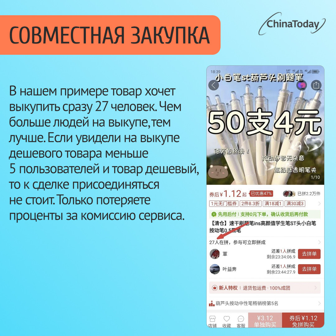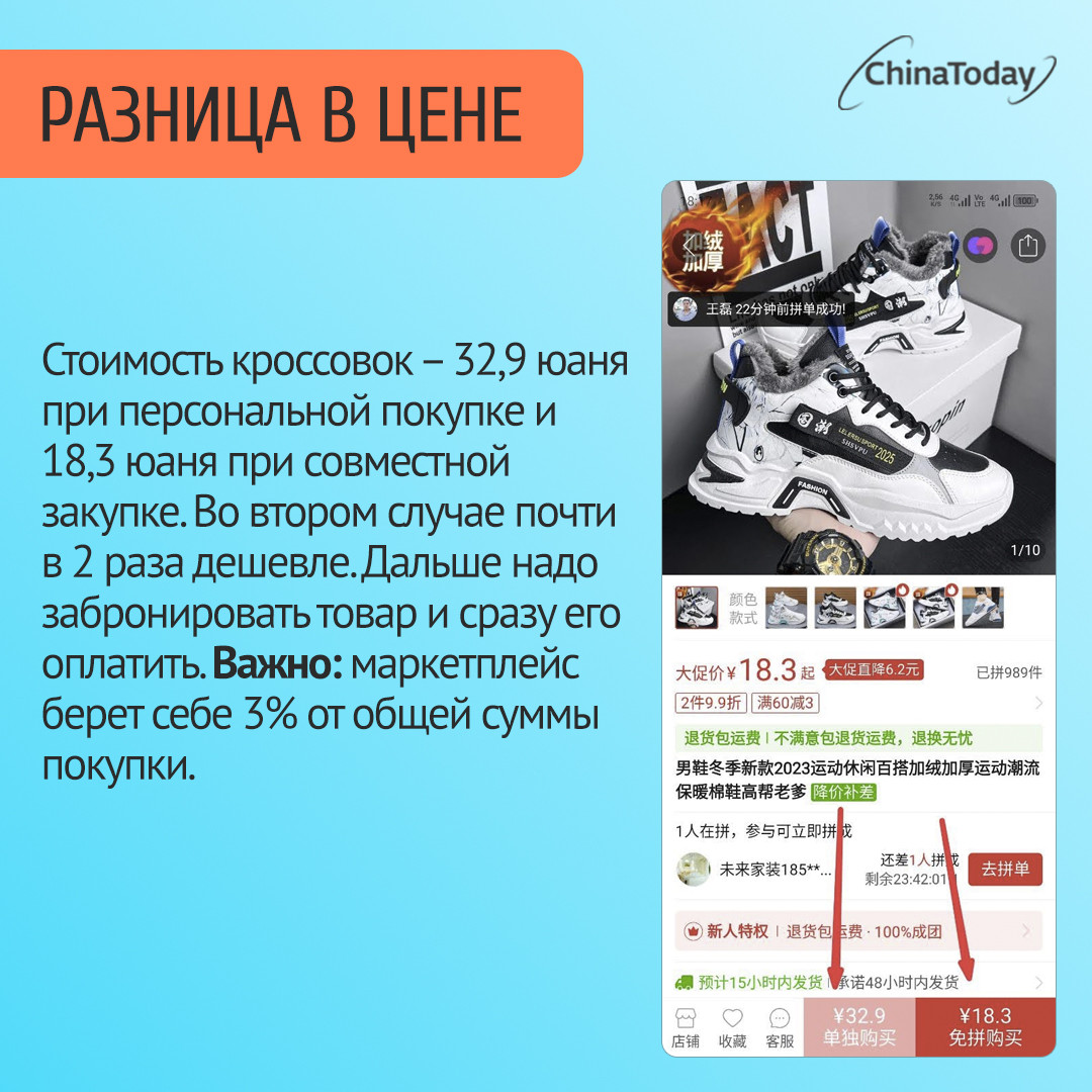 Pinduoduo дословно переводится как «объединяй как можно больше». Здесь выгодно покупать группой копии брендов, недорогие потребительские и сезонные товары. Но есть нюанс: ответственность за качество в случае возврата и обмена несут сами продавцы. Поэтому ошибка при выборе продавца или товара может дорого стоить.