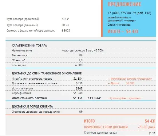 Товары отправляются в контейнерах по морю. Средний срок доставки в белую — 35–50 дней. Для просчета стоимости белой доставки понадобятся данные по каждому артикулу (коду ТН ВЭД) товара. Потому что список документов и размер таможенных платежей зависит от того, какой именно товар вы везете. В вопросе сертификации и документов на детские товары из Китая много нюансов, поэтому его и разберем подробно ↓ Детская одежда и обувь в обязательном порядке сертифицируется или декларируется по регламенту ТР ТС 007/2011 «О безопасности продукции для детей и подростков». А на некоторые товары требуется более серьезный документ — СГР (в основном на товары для детей до года). На детскую обувь, первый и второй слой одежды обычно выдается сертификат соответствия, на третий слой одежды — декларация о соответствии. Если планируете завозить разные виды одежды и обуви, придется оформить несколько документов согласно техническим регламентам. Декларация о соответствии выдается на серию (по регламенту ТР ТС 007/2011) или партию ( П№ 353) товара. В первом случае предварительно завозятся образцы для прохождения испытаний и подтверждения, что товар соответствует всем требованиям безопасности. Декларация может быть зарегистрирована без лабораторных исследований образцов — на основании собственных доказательств компании-заявителя. Это упрощенная схема ввоза товаров по ПП № 353. В обновленном списке запрещенных к ввозу по упрощенной схеме товаров указаны конкретные наименования и коды ТН ВЭД детских товаров ↓ Если нужный детский товар подлежит обязательной сертификации/декларированию и не указан в списке запрещенных к ввозу по ПП№ 353, на него можно оформить ДС на партию. То есть, для импорта не нужно ввозить образцы — можно сразу везти партию → оформлять ДС на партию → после ДС/СС на серию. Пример 1: Клиент обратился с запросом на закупки двух видов лонгсливов для детей от 3 лет. Для ввоза в белую на товар необходимо оформить сертификат соответствия (П № 353 не применимо). Предварительно отобрали и отправили на испытания образцы — по 5 шт. каждого вида. Лонгсливы отличались по составу и соответственно коду ТН ВЭД, поэтому на каждый вид необходим отдельный сертификат соответствия. Вот данные по расчетам ↓ Образцы для лабораторных испытаний тоже обязательно ввозятся в белую. Доставка образцов в Россию вместе с таможенным оформлением и сертификатом обошлась клиенту в 58 тыс. рублей на каждый вид товара. Пример 2: Получили запрос на ввоз образцов обуви для детей до 3 лет со следующими характеристиками: Чтобы законно торговать детской обувью в России, необходима сертификация с тремя протоколами испытаний по группам — ясельной, малодетской и дошкольной. Оформление происходит только с образцами — минимум 3 пары на один протокол испытаний. Стоимость оформления СС — 75 тыс. рублей, срок — 2–3 недели с момента поступления образцов в лабораторию. Вот данные расчета по ввозу образцов ↓ А вот уже расчет на партию детской обуви после получения СС по коду ТН ВЭД 6404199000 и маркировки всей партии штрих-кодами «Честный знак» ↓ Некоторые товары для детей, помимо сертификации, также проходят государственную регистрацию в Роспотребнадзоре (СГР), за которой следует декларирование. СГР требуется на товары для детей раннего возраста, включая: Наличие СГР требуется, чтобы законно ве