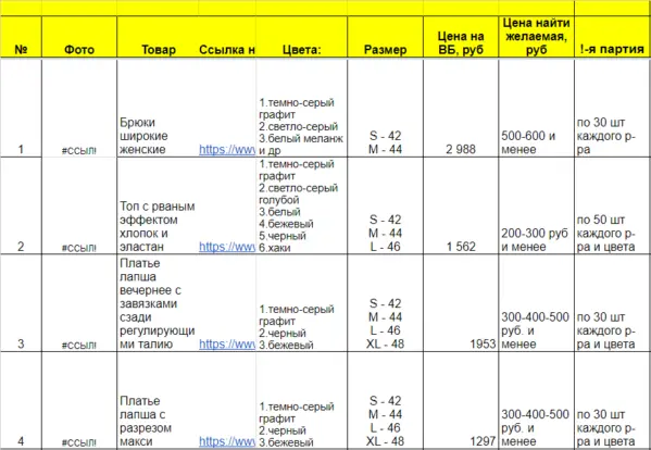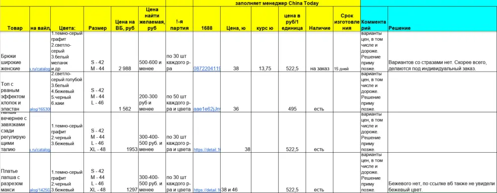 К нам обратилась Наталья с запросом на подбор производителей для 8 товаров категории «Женская одежда» — брюк, топов и платьев. Клиентка торгует на Вайлдберриз и отобрала топовые товары, лидирующие в выдаче на маркетплейсе. Наталья ранее работала с нами, поэтому подготовила и подробно заполнила таблицу, в которой указала: