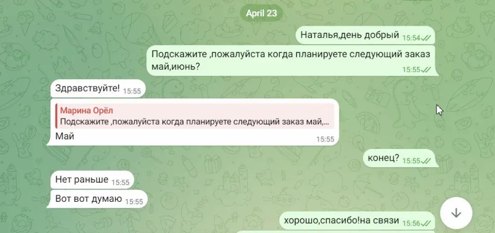- Переговоры. Пообщались с выбранными поставщиками, чтобы уточнить наличие товара, нужные цвета, размеры, стоимость единицы, готовность доставить или отшить определенное количество продукции, сроки.