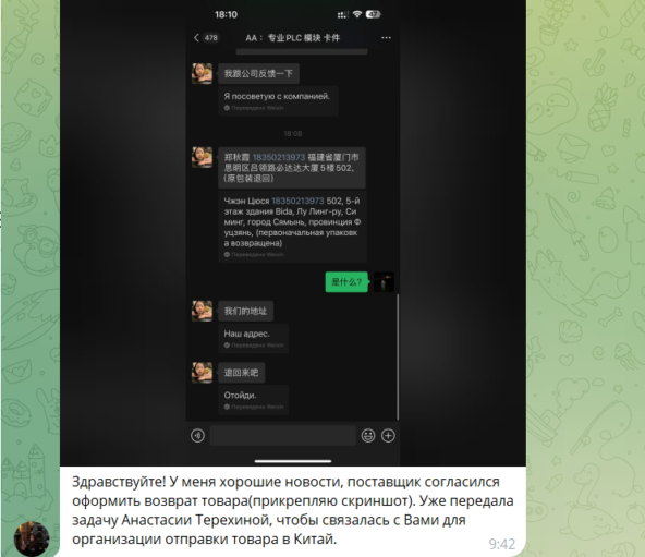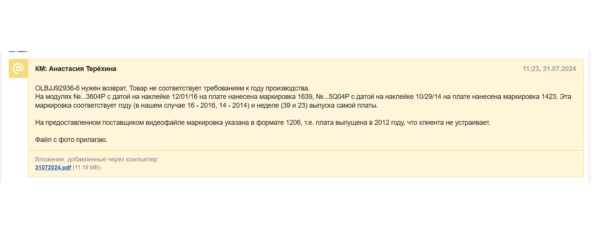 Товар — блоки питания Emerson. Оператор сделал заказ товара у поставщика, товар пришел на склад, но клиент был неудовлетворен фотоотчетом и запросил обмен товара. Обмен был произведен, поставщик выслал новый товар. Что ж, такое случается. Замененный товар мы проверили. Клиент согласовал новый фотоотчет, и заказ был отправлен в Россию. Казалось бы, можно выдохнуть. Товар приехал в Россию к клиенту, и тут наш клиентский менеджер Анастасия получает такое сообщение от клиента: "Претензия такая: Получили оборудование Блок питания Emerson EPM.VE5009 KJ1501X1-BC3 в кол-ве 20шт. При выкупе были оговорены следующие требования к оборудованию: оригинальное, абсолютно новое, год производства 2022. При приемке оборудования на нашем складе были выявлены следующие замечания: 1) оборудование не новое, есть царапины, потертости, у двух модулей сломаны крепления, Также видны следы установки на Din-рейку, есть царапины и следы приклеивания. 2)год производства не соответствует запрашиваемому, на внутренних комплектующих модуля (транзисторах, конденсаторах, варисторах) стоят цифры, которые соответствуют году производства — 08,07,06 — 2006-2008 год производства. На печатной плате видны цифры 08, что соответствует 2008 году. 3)наклейки белые с годом выпуска переклеены, они с резко обрезанными краями в ручную, на оригинальных заводских наклейках края полукруглые. Также на наклейках присутствуют характерные следы смазанной краски, что говорит о том, что наклейки штамповали не на заводе. 4)к внешнему виду коробок, в которые были упакованы модули тоже есть замечания, они не новые, часть с заломами". Наш менеджер ВЭД Аделина изучила фото: на них видно, что клиент прав: оборудование от 2023 года, а внутренние детали к нему оказались 2008 года. Несоответствие техническому заданию клиента налицо. Мы сразу же написали поставщику письмо с просьбой о замене товара, но понимали риски: к этому моменту товар уже находился в РФ, а перед его отправкой клиент принял и одобрил фотоотчет. Это означало, что в данном случае у поставщика были все основания отклонить наши претензии. Дело осложнялось тем, что поставщик оказался не прямым производителем, а посредником: на все претензии отнекивался, мол, такой товар был ранее принят клиентом по фото, какие могут быть вопросы. В свою защиту поставщик выслал нам письмо от производителя блоков питания, в котором тот подтверждал, что товар оригинальный и соответствует всем заявленным требованиям. Диалог зашел в тупик. С одной стороны — разочарованный клиент, с другой — считающий себя правым поставщик. Чтобы выйти из ситуации без потерь, мы провели внутренний мозговой штурм команды. Приняли решение обратиться к третьей стороне: провести экспертизу и подтвердить, что товар не соответствует требованиям клиента. В случае положительного заключения экспертизы ее результаты стали бы основанием для возврата денег клиента за несоответствующий товар. Аделина на китайском ресурсе нашла компанию, которая должна была провести экспертизу. Она запросила у этой компании договор на сотрудничество, начала заполнять его и параллельно вела переписку с поставщиком. «Я направила образец договора с компанией по экспертизе поставщику с сопроводительным письмом: «Мы обратились в компанию для проведения экспертизы и получения заключения о том, что вы выслали нам не соответствующий т