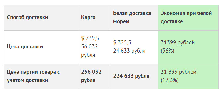 Итак, клиенту нужно было привезти из Китая груз весом 170 килограммов. Какая разница получилась при расчете стоимости карго и белой доставки груза, смотрите в таблице ниже. Расчет показал, что доставка партии товара в белую поможет клиенту сэкономить 31 399 рублей. Это 56% стоимости доставки и 12,3% расходов на партию товара с учетом доставки. Естественно, он выбрал этот вариант и воспользовался белой доставкой. Александр, представитель клиента: "В нашем случае я не вижу смысла в карго-доставке. Мне нравится белая доставка морем. Сроки по карго были 30-60 дней, на белую доставку они оказались дольше — 60-90 дней, а иногда бывает и более 90. Но белая доставка оказалась дешевле даже для нашей более-менее большой партии. Если правильно спланировать закупки по срокам, более долгое ожидание товара проблемой не будет. Достаточно заказать новую партию с расчетом, чтобы успеть ее получить, когда будет заканчиваться старая. Плюс при карго есть потенциальные проблемы с законом. За накладную «ТОРГ-12» придется доплачивать 14%, обналичивать деньги. А при белой доставке мы по умолчанию получили декларации и закрывающие документы без всяких доплат, оплатили по безналу, чем закрыли ряд проблем". Задача выполнена, клиент доволен экономией. А мы в очередной раз сделали выводы о плюсах белой доставки. Если вы не знаете, какой вариант доставки выгоднее вам, запросите у своего посредника расчет обоих. Только рассчитав точную стоимость карго и белой доставки, вы сможете сравнить оба варианта и принять решение, как выгоднее везти вам.