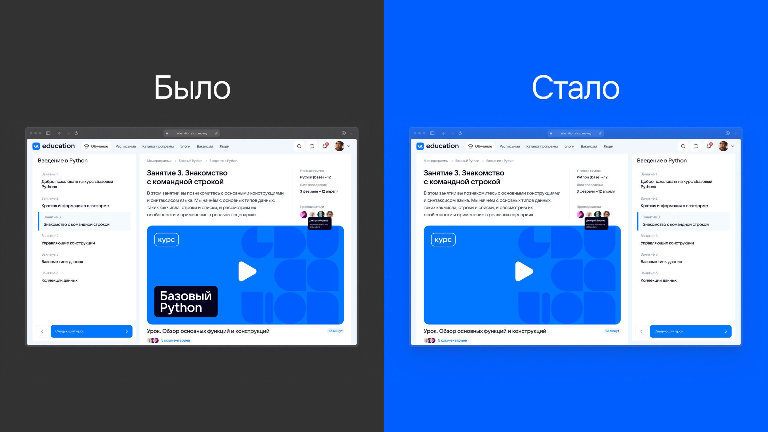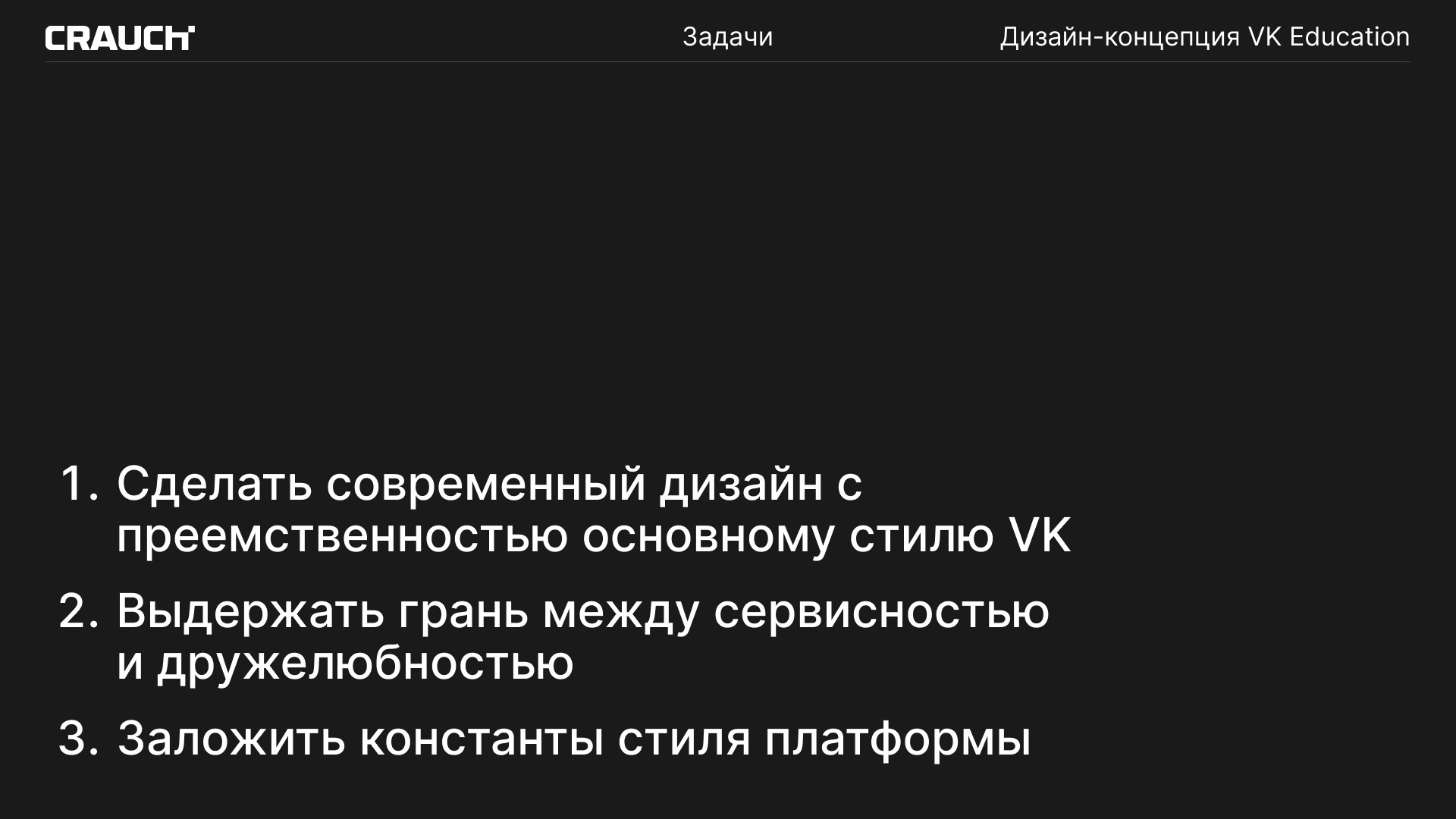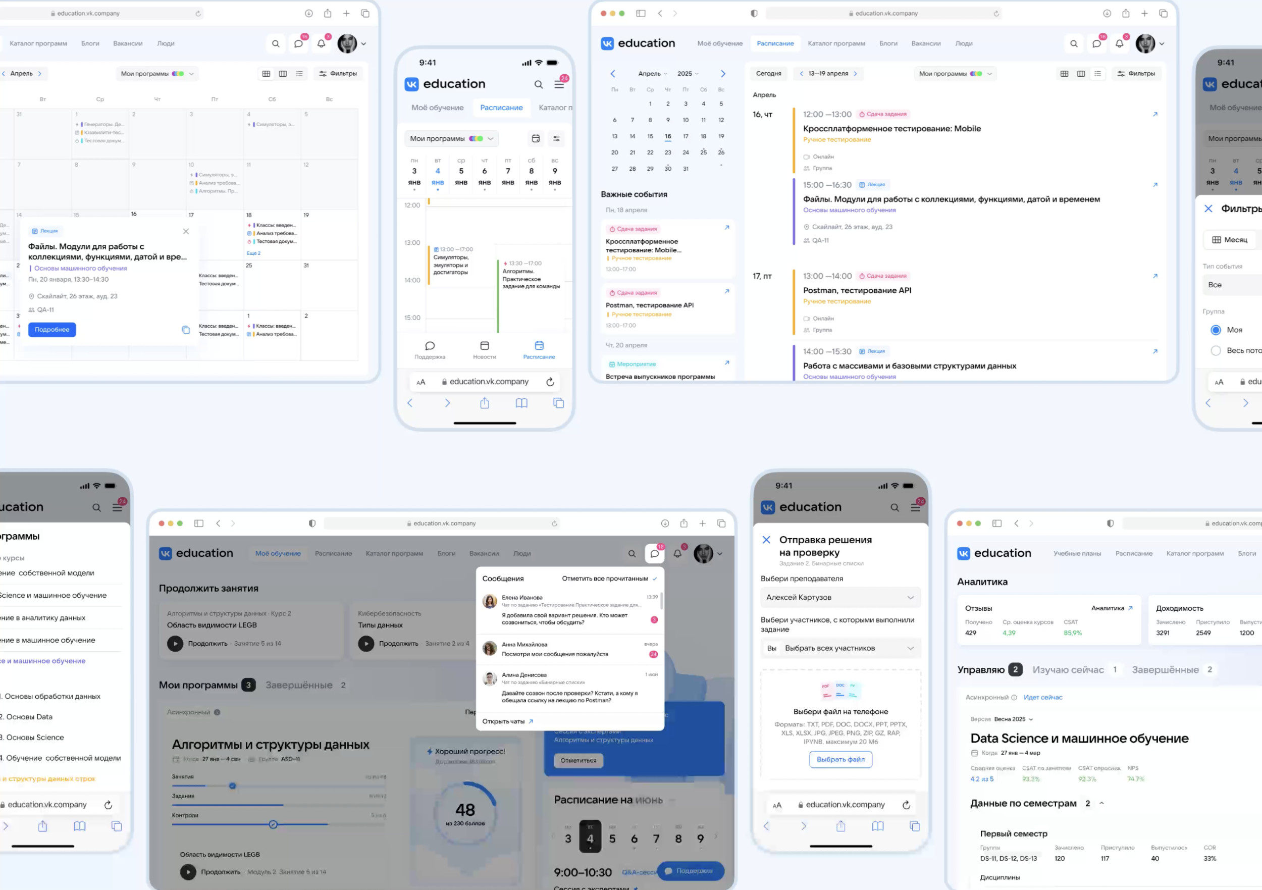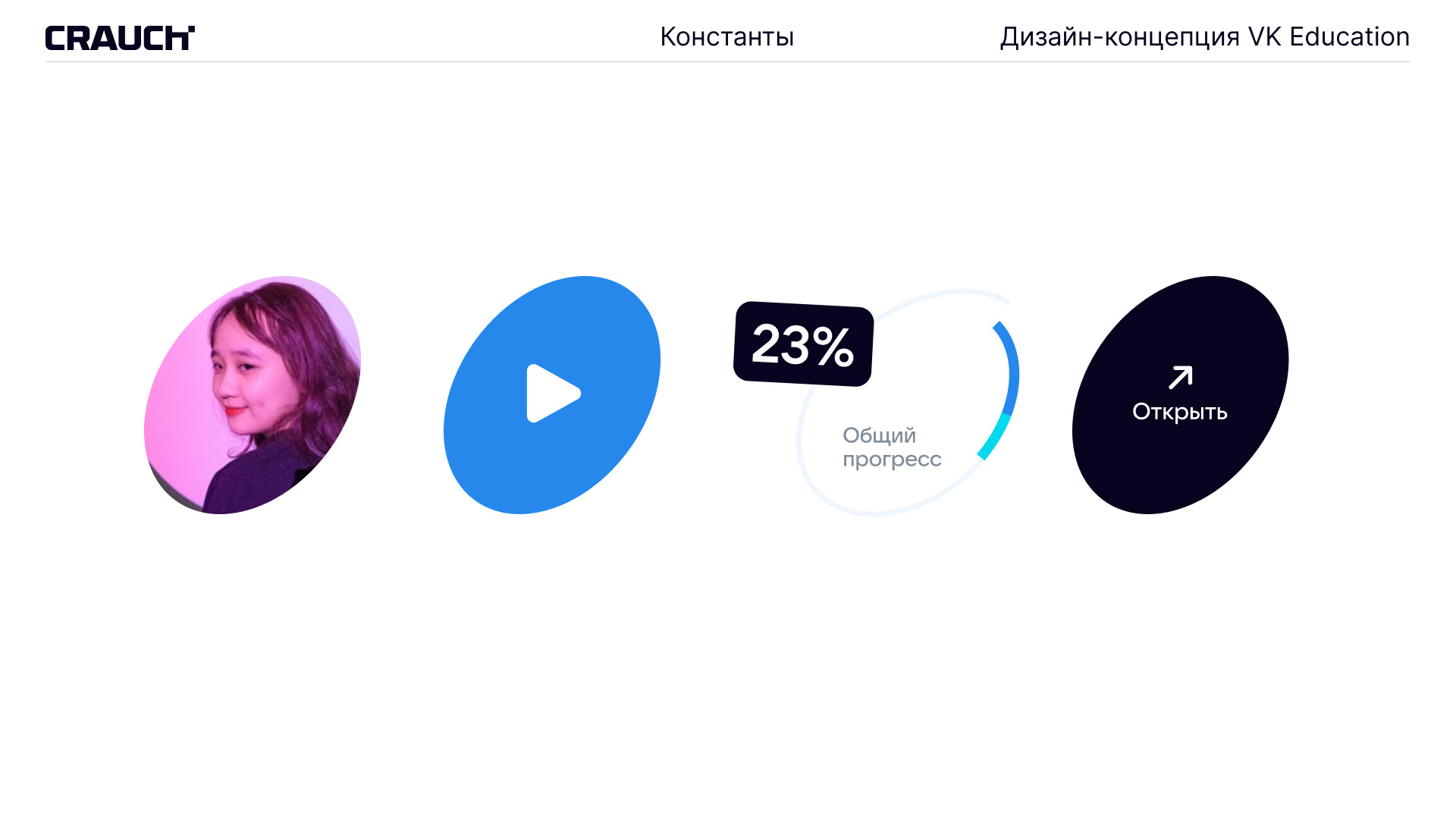 VK Education — это главная образовательная платформа VK, которая помогает школьникам, студентам, учителям и IT-специалистам прокачивать навыки и строить карьеру в digital-сфере. Немного цифр: Платформа уже работала и приносила результаты, но требовала редизайна. Навигация сложная, интерфейс устарел, а доходимость до конца курса (COR) — ниже, чем хотелось бы. Вот как система выглядела до редизайна: Чтобы VK Education продолжала расти и развиваться, нужно было не просто обновить визуал, а сделать платформу удобной и интуитивно понятной. Какие задачи перед нами стояли: Что было важно для VK: Проект был амбициозный, требовательный и долгий — 9 месяцев работы, десятки итераций, но в итоге мы сделали продукт, который решает задачи и бизнеса, и пользователей. Как именно — рассказываем дальше. Сперва расскажу, как мы взяли проект. Мы всегда подходим к пресейлу не как к формальности, а как к стратегическому этапу, который помогает выстроить эффективный процесс работы. Мы понимали, что в крупных корпорациях процесс согласования часто сложный и многоуровневый. Если начинать с глубокой аналитики и проектирования, это может затянуться из-за долгого рассмотрения документов и обсуждения. Поэтому мы изменили стратегию: первым шагом предложили сделать дизайн-концепцию, чтобы сразу продемонстрировать направление и сократить сроки согласования со стороны VK. Это позволило быстро получить фидбэк от клиента и на раннем этапе определить ключевые визуальные принципы. Благодаря тому, что мы погрузились в проблему клиента и предложили нужное решение — оно оказалось самым лучшим и мы смогли забрать проект. Первым шагом стала работа с мудбордами и референсами. Мудборды — это важный этап на пути к созданию классного дизайна. С их помощью мы не просто собираем красивые картинки, а задаем направление, ловим настроение будущего продукта и помогаем клиенту понять, каким он получится. Берем референсы из интернета или из наших прошлых проектов, собираем презентацию и показываем возможные векторы — так сразу становится понятно, в какую сторону двигаться дальше и что ждать от финального результата. На этапе презентации мы предложили два противоположных направления: 1. Дружелюбность — визуально мягкий, персонализированный стиль. 2. Сервисность — строгий, структурированный стиль. Вместе с клиентом мы поняли, что платформа должна сочетать оба подхода: сохранять структурированность, но при этом выглядеть дружелюбно и современно. На этапе проработки дизайн-концепции мы взяли в работу две страницы: учебных программ и страницу урока с домашним заданием. Первая содержит переиспользуемые элементы, а вторая насыщена контентом и требовала четкой структуры. Уже на этапе драфта смогли понять в верном ли направлении двигаемся, как хотим чтобы выглядели блоки и где они должны располагаться. Здесь, мы как студия всегда закладываем в концепцию больше свежий идей, чем может принять клиент, чтобы потом отсеивать, а не добавлять. Это позволяет поднять финальное качество выше изначальных ожиданий. В итоговом концепте мы создали лёгкий, просторный дизайн с мягкими формами и наклонными элементами, придающими интерфейсу динамику и ощущение «зефирности» . Овалы стали ключевым графическим приёмом, добавляя плавность и визуальную целостность. Когда мы презентовали концепцию, команда клиен