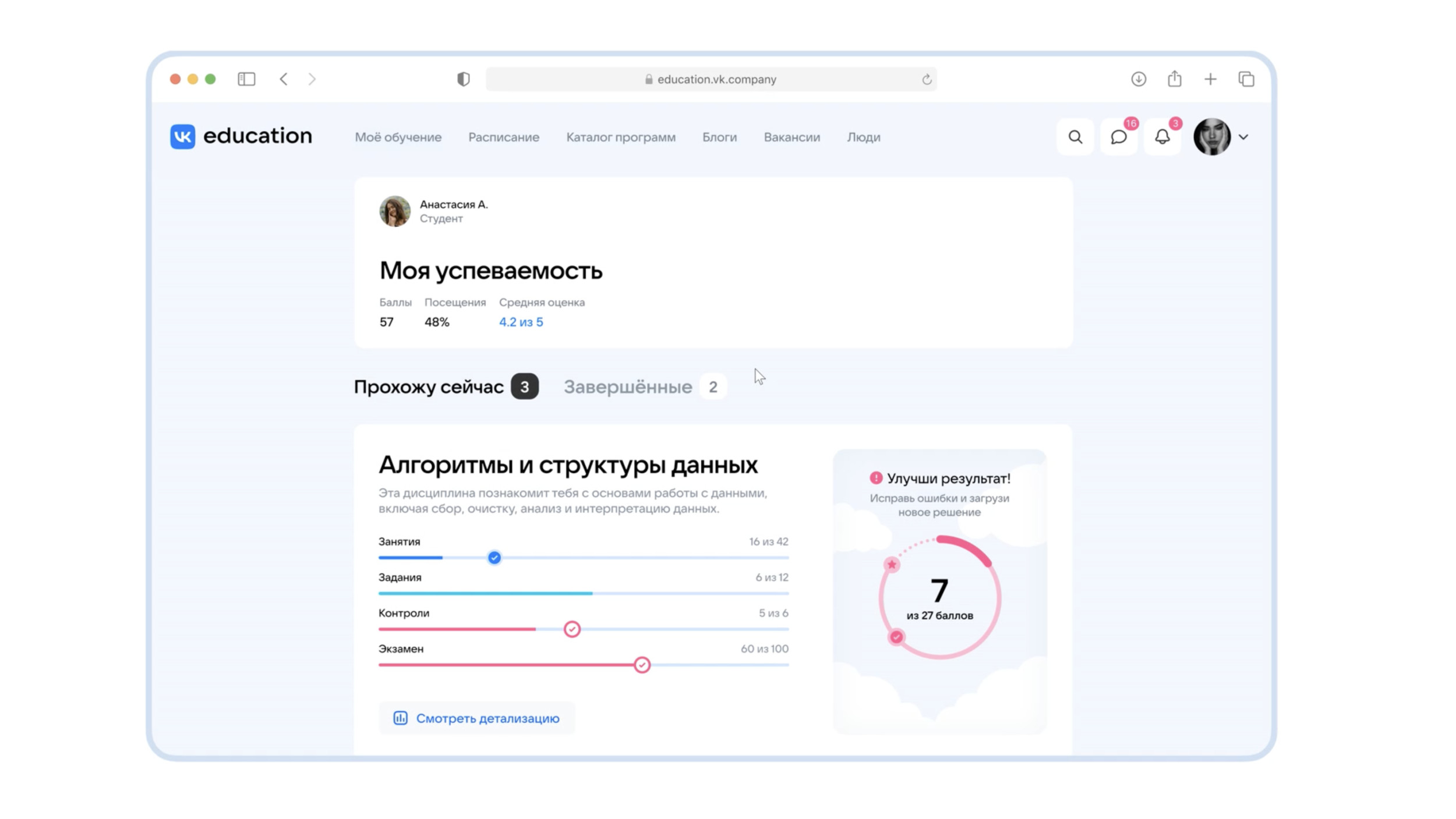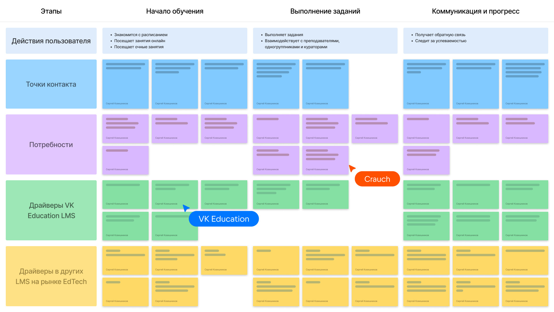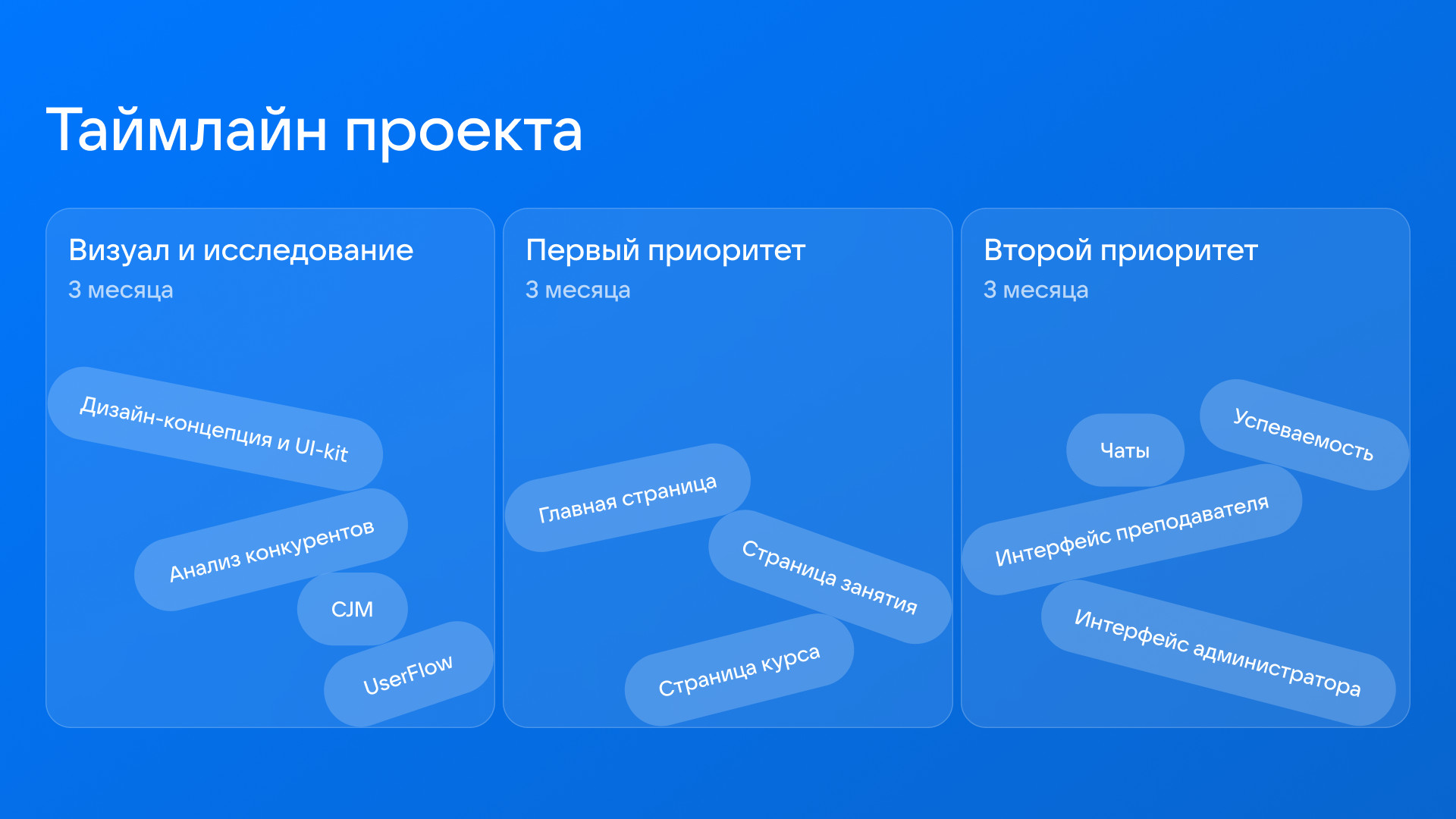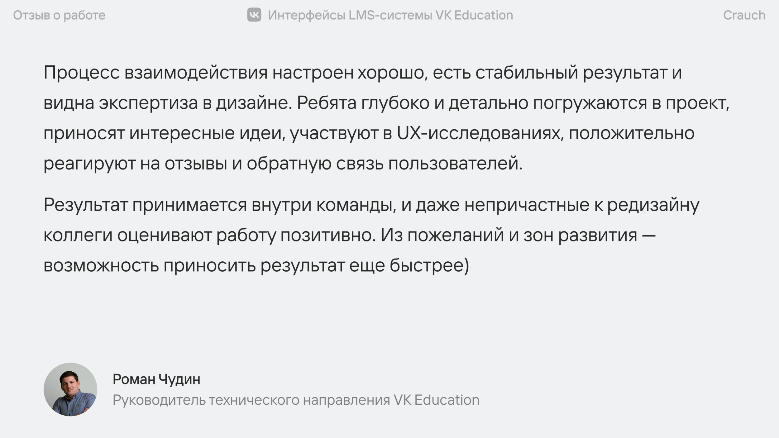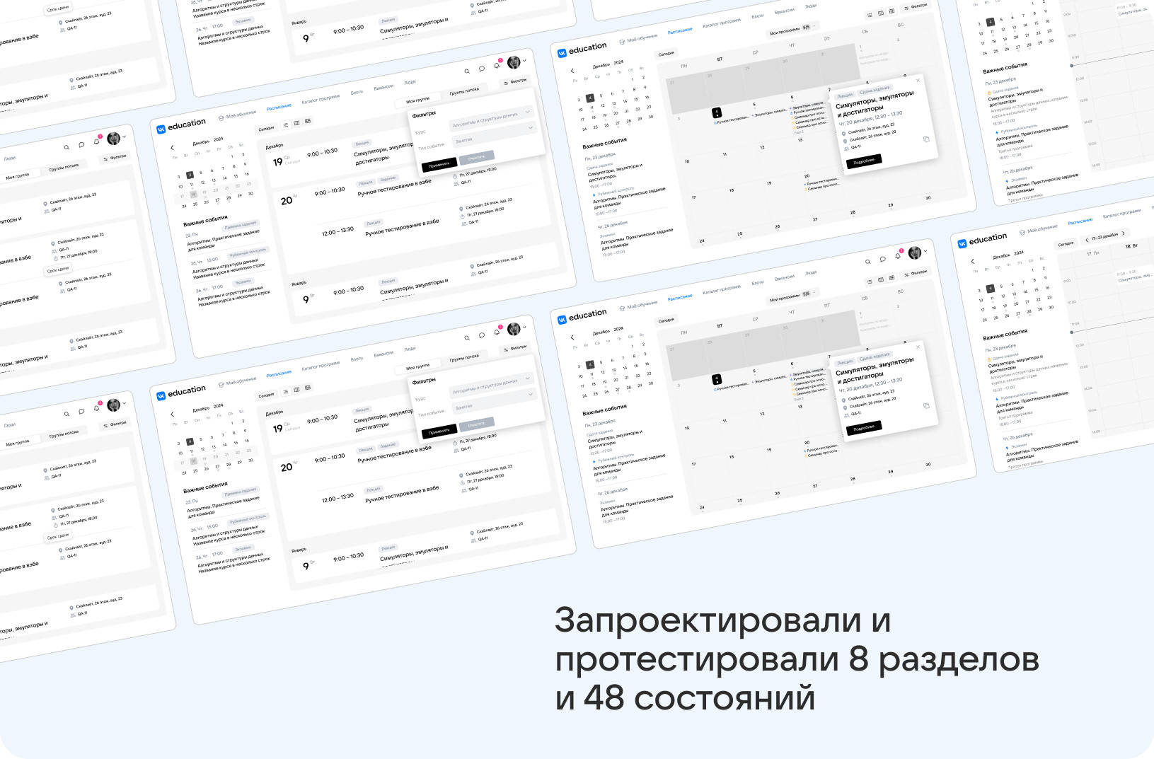 VK Education — это главная образовательная платформа VK, которая помогает школьникам, студентам, учителям и IT-специалистам прокачивать навыки и строить карьеру в digital-сфере. Немного цифр: Платформа уже работала и приносила результаты, но требовала редизайна. Навигация сложная, интерфейс устарел, а доходимость до конца курса (COR) — ниже, чем хотелось бы. Вот как система выглядела до редизайна: Чтобы VK Education продолжала расти и развиваться, нужно было не просто обновить визуал, а сделать платформу удобной и интуитивно понятной. Какие задачи перед нами стояли: Что было важно для VK: Проект был амбициозный, требовательный и долгий — 9 месяцев работы, десятки итераций, но в итоге мы сделали продукт, который решает задачи и бизнеса, и пользователей. Как именно — рассказываем дальше. Сперва расскажу, как мы взяли проект. Мы всегда подходим к пресейлу не как к формальности, а как к стратегическому этапу, который помогает выстроить эффективный процесс работы. Мы понимали, что в крупных корпорациях процесс согласования часто сложный и многоуровневый. Если начинать с глубокой аналитики и проектирования, это может затянуться из-за долгого рассмотрения документов и обсуждения. Поэтому мы изменили стратегию: первым шагом предложили сделать дизайн-концепцию, чтобы сразу продемонстрировать направление и сократить сроки согласования со стороны VK. Это позволило быстро получить фидбэк от клиента и на раннем этапе определить ключевые визуальные принципы. Благодаря тому, что мы погрузились в проблему клиента и предложили нужное решение — оно оказалось самым лучшим и мы смогли забрать проект. Первым шагом стала работа с мудбордами и референсами. Мудборды — это важный этап на пути к созданию классного дизайна. С их помощью мы не просто собираем красивые картинки, а задаем направление, ловим настроение будущего продукта и помогаем клиенту понять, каким он получится. Берем референсы из интернета или из наших прошлых проектов, собираем презентацию и показываем возможные векторы — так сразу становится понятно, в какую сторону двигаться дальше и что ждать от финального результата. На этапе презентации мы предложили два противоположных направления: 1. Дружелюбность — визуально мягкий, персонализированный стиль. 2. Сервисность — строгий, структурированный стиль. Вместе с клиентом мы поняли, что платформа должна сочетать оба подхода: сохранять структурированность, но при этом выглядеть дружелюбно и современно. На этапе проработки дизайн-концепции мы взяли в работу две страницы: учебных программ и страницу урока с домашним заданием. Первая содержит переиспользуемые элементы, а вторая насыщена контентом и требовала четкой структуры. Уже на этапе драфта смогли понять в верном ли направлении двигаемся, как хотим чтобы выглядели блоки и где они должны располагаться. Здесь, мы как студия всегда закладываем в концепцию больше свежий идей, чем может принять клиент, чтобы потом отсеивать, а не добавлять. Это позволяет поднять финальное качество выше изначальных ожиданий. В итоговом концепте мы создали лёгкий, просторный дизайн с мягкими формами и наклонными элементами, придающими интерфейсу динамику и ощущение «зефирности» . Овалы стали ключевым графическим приёмом, добавляя плавность и визуальную целостность. Когда мы презентовали концепцию, команда клиен