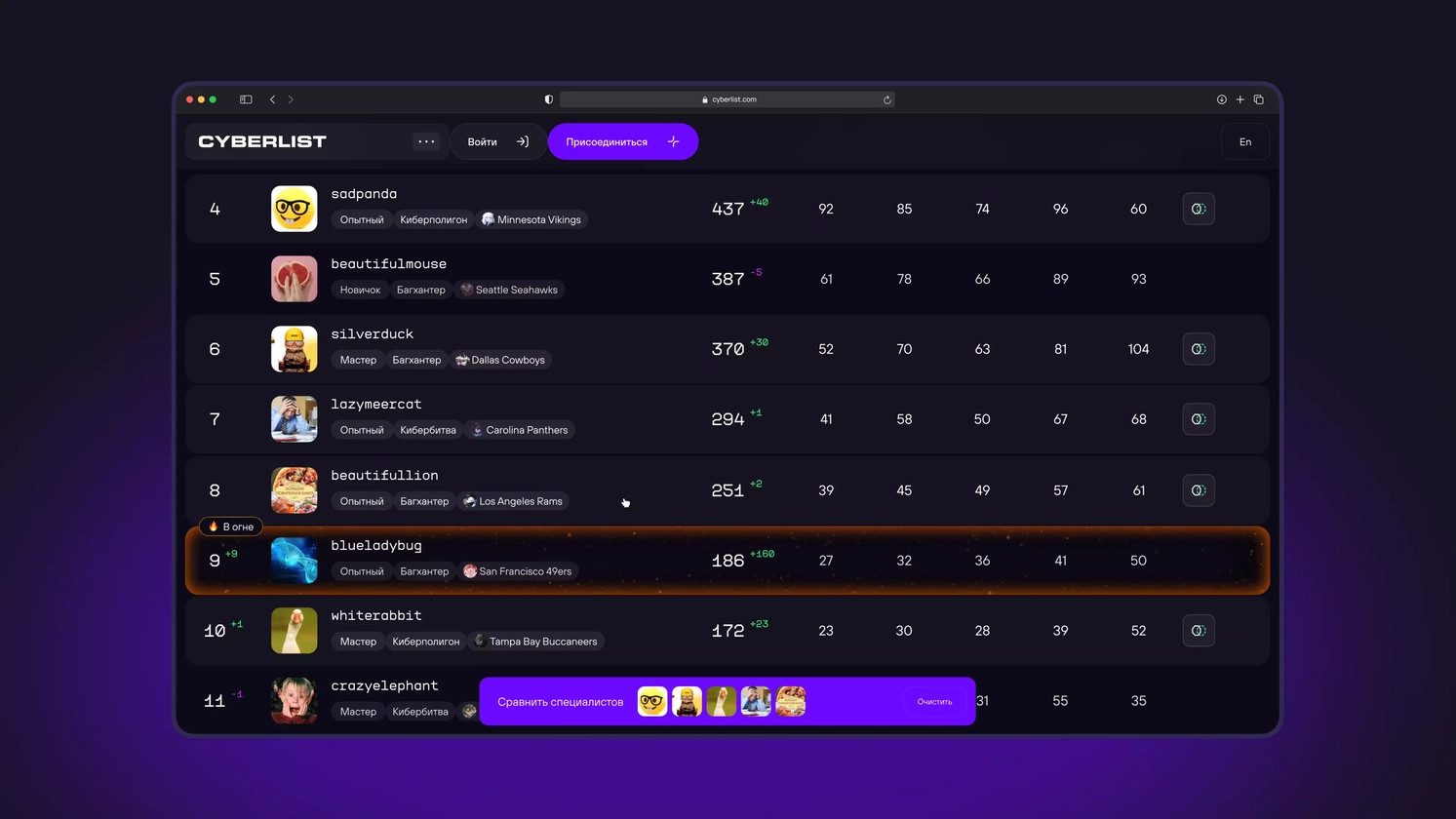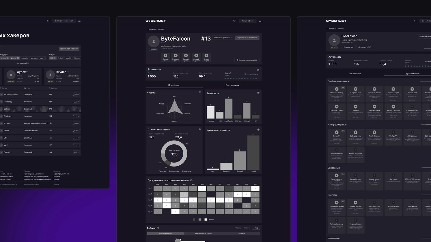 Итак, это платформа, где встречаются бизнес и белые хакеры. Компании публикуют задания (внутри их называют «программами») по проверке безопасности своих сервисов. А специалисты по кибербезу ищут уязвимости, оформляют отчеты и получают вознаграждение — чем критичнее найденная ошибка, тем больше выплата. По сути это агрегатор, который соединяет компании и исполнителей. У хакеров есть личный кабинет: можно откликаться на задания, вести историю отчетов, общаться с заказчиками. Но в проекте мы отвечали только за публичную часть — ту, что видят вообще все. Поиск там работал только по нику, и найти нужного специалиста было сложно — попробуй угадай, под каким именем прячется профессионал. Рейтинговая система не вызывала доверия: никто толком не понимал, за что начисляют баллы и как вообще можно подняться в списке. В итоге одни программы (то есть задания) моментально собирали десятки откликов, а другие так и оставались без внимания. Платформа не умела управлять этим потоком — все зависело от случая и личных предпочтений специалистов. При этом сами программы были разного типа: одни с денежным вознаграждением, другие — чисто репутационные, где взамен хакер получал только рейтинг и признание. Понятно, что второй формат популярностью вообще не пользовался. Без новой механики вовлечения платформа будет буксовать. Нужно было не просто «освежить интерфейс», а выстроить заново систему стимулов — чтобы она вызывала азарт, давала ощущение роста и работала одинаково хорошо для обеих категорий заданий. У платформы две целевые аудитории — бизнес и хакеры. И у каждой своя мотивация. Бизнес — это HR, специалисты по безопасности и менеджеры. Им нужен специалист, который не просто «найдет пару багов», а даст конкретные рекомендации, как сделать систему надежнее. Плюс им важно иметь на руках всю нужную информацию о специалисте, чтобы понять, можно ли ему доверить проверку. Хакеры приходят на платформу, чтобы хорошо зарабатывать. Для этого нужно быть на виду: чем выше ты в рейтинге, тем больше у тебя заказов и внимания от компаний. Поэтому им важно честное ранжирование в рейтинге, основанное только на их скиллах и опыте — и возможность вырваться в первые строчки. Получается, что платформа стоит на границе двух миров: с одной стороны, она должна выглядеть серьезно и профессионально для бизнеса, с другой — быть живой, соревновательной и фановой для хакеров. Смотрели не только багбаунти-сервисы, но и геймерские дашборды, киберспортивные трекеры и даже игровую статистику. Все — чтобы понять, как устроены рейтинги, как визуализируют прогресс и как управляют азартом, не превращая все в шоу. Мы разобрали HLTV, Speedrun, League of Graphs, Fortnite Tracker, интерфейсы в Dota 2, FIFA и других соревновательных платформах. Обратили внимание, как там подается динамика: кто тебя догоняет, насколько стабильно ты держишься в топе, где теряешь позиции. Все это не просто «красивые метрики», а эмоциональный триггер. В играх мы подсмотрели классные приемы, как показывать прогресс так, чтобы реально хотелось двигаться дальше — графики, всплески, подсветка достижений. Но тут важно не скатиться в мультяшность. После дискавери перед концепцией мы конечно же первым делом запроектировали все страницы и состояния. В Crauch этап дизайн-концепции — это технологически отточенный процесс. Перед тем как рисов