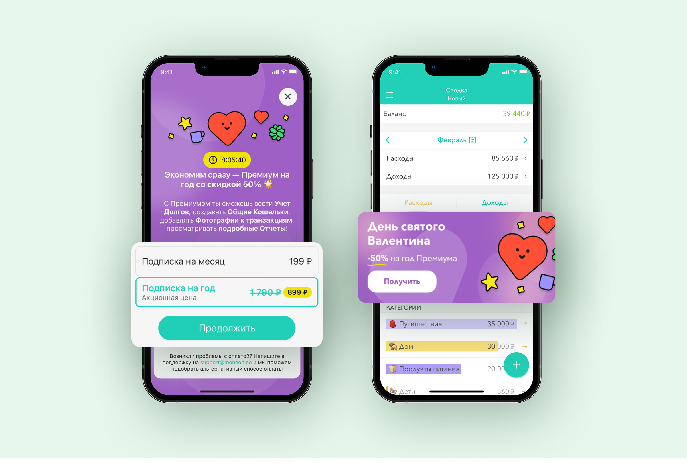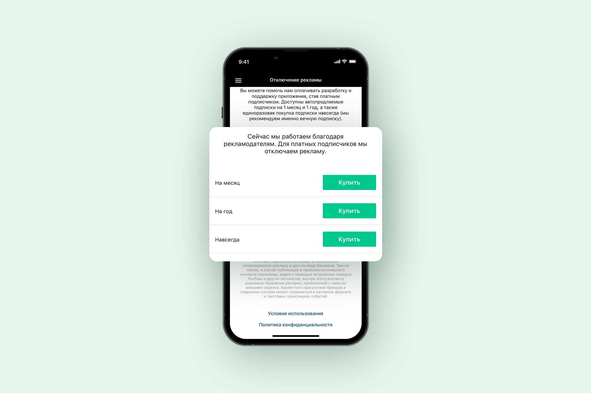 Платная загрузка хорошо работает для нишевых профессиональных инструментов или игр с уникальной механикой. Например, сервис для организации личных и рабочих дел Things требует единоразовой оплаты в App Store. Плюсы: Минусы: Когда использовать: Платное приложение в магазине подходит, если ваше приложение решает специфическую задачу, а конкуренция среди бесплатных аналогов невысока. Пользователь оплачивает доступ к контенту или функциям приложения на регулярной основе. А вы получаете стабильный доход. Модели подписки тоже стоит подбирать исходя из функциональности и задач, которые решает пользователь. Для одних мобильных продуктов лучше работает ежемесячная оплата, для других — недельные, квартальные или годовые тарифы. При оформлении длительной подписки обычно предлагается более выгодный тариф, мотивируя на покупку. Нужно протестировать разные варианты и выбрать тот, который максимально удобен пользователям и выгоден для бизнеса. Рекомендуем предлагать пользователям два-три варианта для увеличения конверсии в подписку. Плюсы: Минусы: Когда использовать: Подходит для сервисов, где пользователи готовы платить за постоянный доступ, например, образовательные платформы, SaaS-продукты, облачные хранилища, CRM-системы. В других случаях стоит смотреть в сторону Freemium. Монетизация через показ рекламы поможет получать плату от рекламодателей за показы и клики. Например, IT-платформа Хабр на этапе запуска приложения сотрудничала с известным банком, брендировала под партнёра и размещала рекламные блоки внутри приложения. Плюсы: Минусы: Хорошо зарекомендовали себя такие рекламные форматы: Видео с системой вознаграждения — реклама, за просмотр которой пользователь получает бонус (игровую валюту, бесплатный и удобный доступ к контенту). Нативная реклама — блоки, замаскированные под дизайн приложения, которые соответствуют контексту и выглядят уместно. Например, Premium App в приложении Авито — это крупноформатный медийный блок, но визуально похожий на обычные объявления. Межстраничная реклама на полный экран — показывается при переходах между экранами приложения. Привлекает внимание сильнее, чем баннеры. Когда использовать: Подходит для приложений с высокой вовлечённостью пользователей и большим количеством бесплатного контента. Ещё один способ монетизировать такие приложения — убрать рекламу за отдельную плату. Таким образом, дать пользователю выбор: либо оплатить и не видеть объявления, либо продолжить пользоваться бесплатной версией. Такая модель иногда встречается в сфере СМИ. Например, приложение «СПОРТС» для болельщиков и любителей спорта распространяется бесплатно и получает доход от показа объявлений. Пользователи, которые не хотят отвлекаться на рекламу, могут сделать разовую покупку и «убрать рекламу навсегда». Эта опция позволяет медиа компенсировать потерю рекламного дохода и сохранить аудиторию. Это популярная гибридная модель, в которой базовые функции предоставляется бесплатно, а расширенные возможности открываются при единоразовой покупке или подписке. Например, в приложении для управления личными финансами Moneon базовые функции учёта финансов бесплатны навсегда, а расширенные возможности — совместные кошельки, детальная аналитика и формирование отчётов — доступны по платной подписке. Плюсы: Возможнос