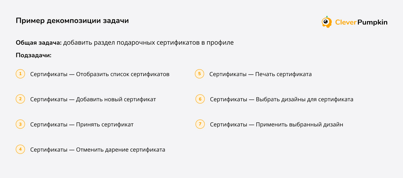 Следующий шаг — декомпозиция. Разбейте большую задачу на несколько небольших. Подзадачи не должны пересекаться или дублировать работу коллег. Это важно, чтобы: