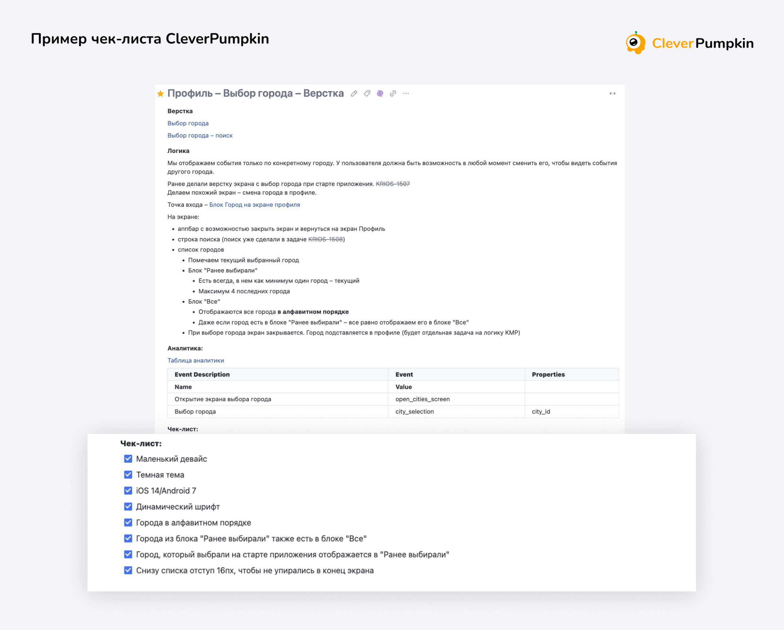 Аналитика: какие события нужно добавить для отслеживания. Чтобы задачи были понятными и исполнимыми, придерживайтесь простых правил: 1. Структура. Разбивайте описание на логические блоки. Это упрощает навигацию и позволяет быстро находить нужную информацию. Используйте шаблоны вашей task-системы. Это помогает быстро ориентироваться и ускоряет работу. 2. Исключение пересечений. Строго контролируйте зоны ответственности между разработчиками. Параллельные задачи с пересекающейся функциональностью приводят к конфликтам при слиянии кода, дублированию работы и росту трудозатрат. Если пересечения необходимы, важно предупредить об этом заранее и согласовать порядок работы. 3. Фиксация всех изменений. Оформляйте задачу на ЛЮБОЕ изменение в коде, так как это единственный способ доказать факт договоренностей, и гарантия, что изменение будет протестировано. 4. Межплатформенная синхронизация. Связывайте задачи для iOS и Android через специальные поля связи, общие чек-листы и комментарии. Так проще поддерживать актуальность описаний задач при изменениях на обеих платформах. Когда один разработчик опирается на логику или решение другого, скорость всей команды растет. 5. Визуальная поддержка. Добавляйте к задачам скриншоты с аннотациями, схемы взаимодействия, диаграммы состояний, видео с примерами работы и визуальный контекст. Зачастую эта информация эффективнее текстового описания. В YouTrack мы используем шаблон, который автоматически добавляет формат задачи с местом для верстки, логики и сразу с базовым чек-листом. Чек-лист — это инструмент самопроверки. Он помогает ничего не упустить и учесть все возможные сценарии. Обязательными пунктами для любой задачи являются: Дополнительно, в зависимости от специфики задачи, список может включать: У разработчика не должно оставаться вопросов формата «а как это может выглядеть в этом случае?» — все возможные сценарии нужно заранее прописать. Менеджеру важно проконтролировать, что список дополнен тестировщиком. Если на одной платформе тестирование выявило ошибки по непрописанным кейсам, нужно добавить эти пункты в чек-лист и для второй платформы. Всегда обращайте внимание на оценку трудозатрат, которую дает разработчик. Если она сильно расходится с вашими ожиданиями и с первоначальной оценкой (original estimate), нужно разобраться в причинах. Разрыв может возникнуть из-за неоднозначного описания задачи, недооценки сложности или, наоборот, переоценки. Возможно, разработчик не знает о готовом компоненте для переиспользования, или вы забыли указать это в задаче. Если на этапе оценки выяснилось, что какие-то работы упустили изначально, этот вопрос необходимо обсудить с заказчиком, согласовать изменения по срокам, функциональностям и бюджету. Важно! Если разработчик понимает бизнес-контекст задачи, он может предложить альтернативные решения, как сделать быстрее и лучше. Поэтому стоит обсуждать эстимейты не только с точки зрения сроков, но и с позиции, как полезнее и выгоднее для продукта. Резюмируем все ключевые шаги: Главное — сделать эту последовательность действий привычкой. Когда вы научитесь мысленно проверять себя по этим пунктам, то сэкономите время всем: у разработчиков будет меньше уточняющих вопросов, а тестирование пройдет быстрее и с меньшим количеством багов. Формализация задач — не пр