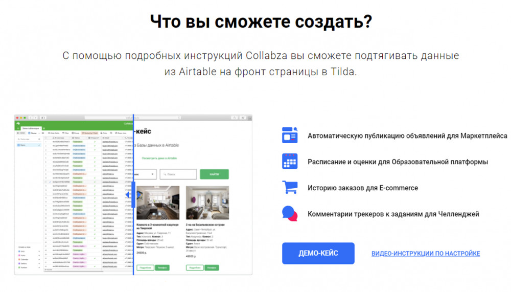 Collabza решает основное ограничение Tilda в части отсутствия возможности персонализировать личный кабинет и автоматизировать публикацию объявлений из внешней базы данных. Теперь в Tilda можно собрать single-page site наподобие AirBnb, который подтягивает на страницу разные данные по объявлениям из Airtable в зависимости от запроса.