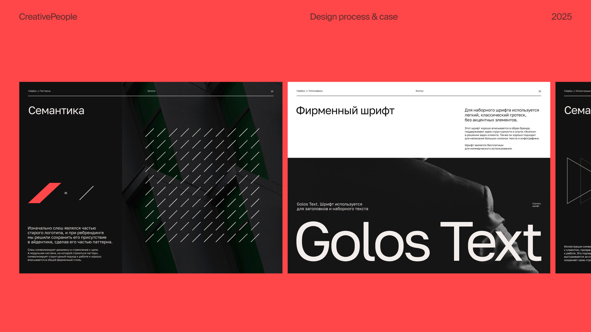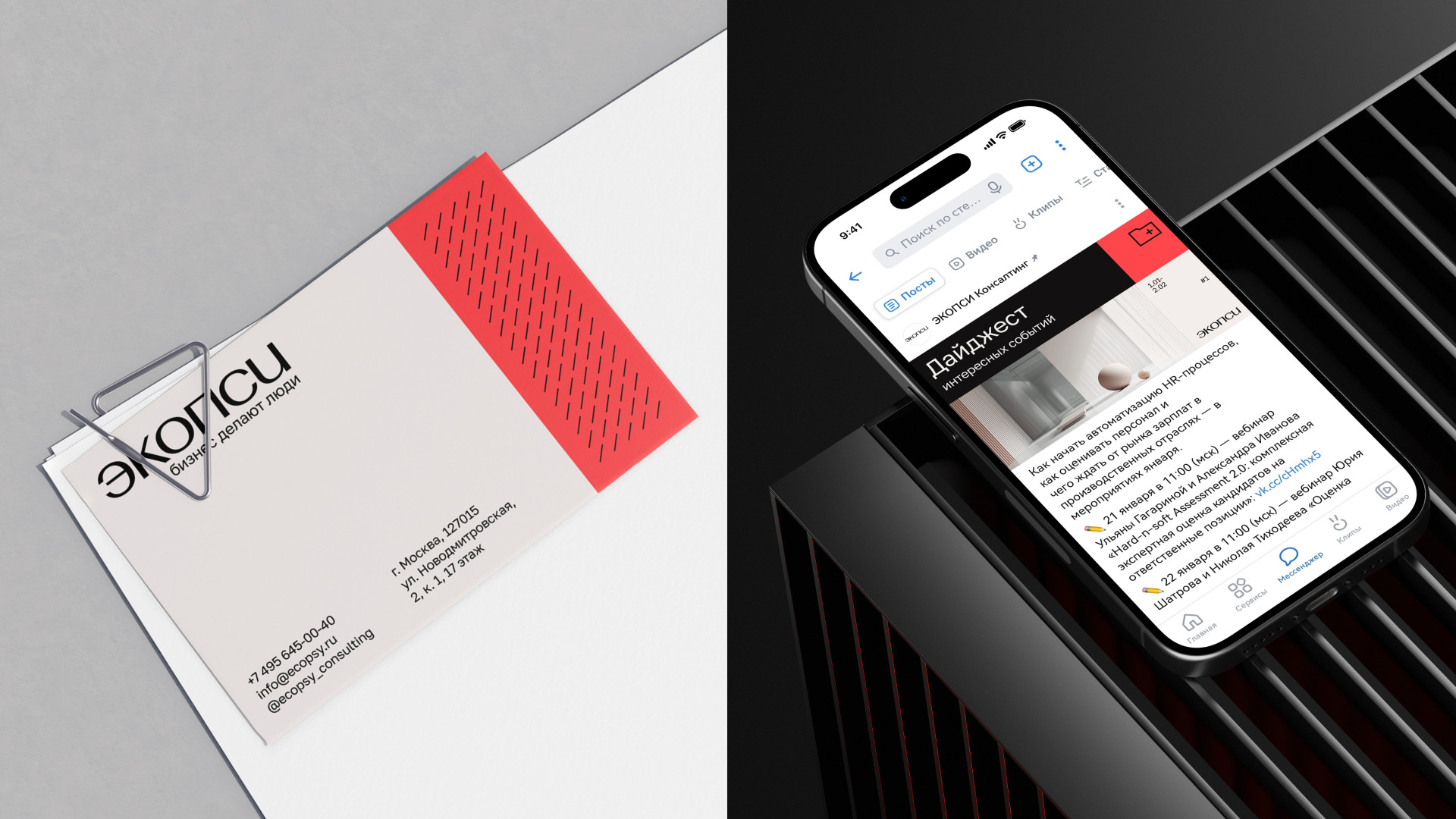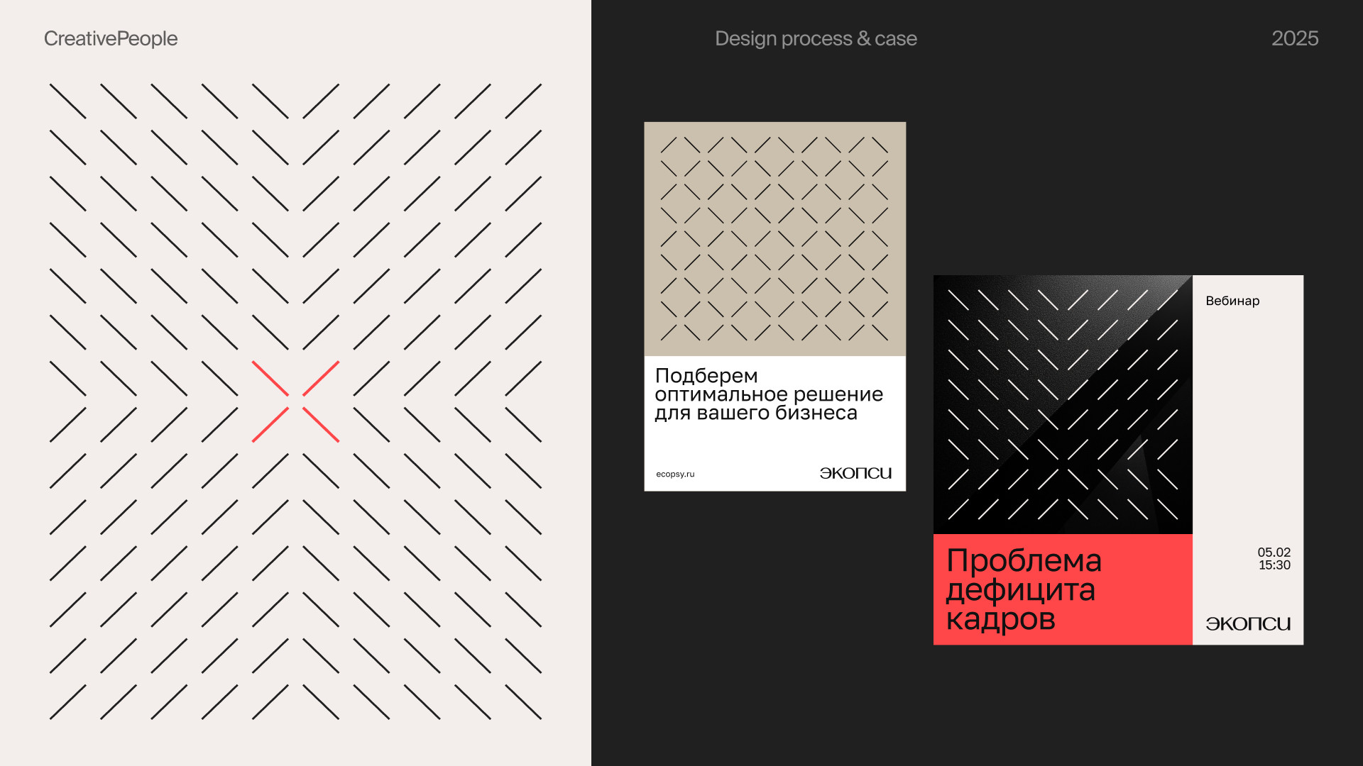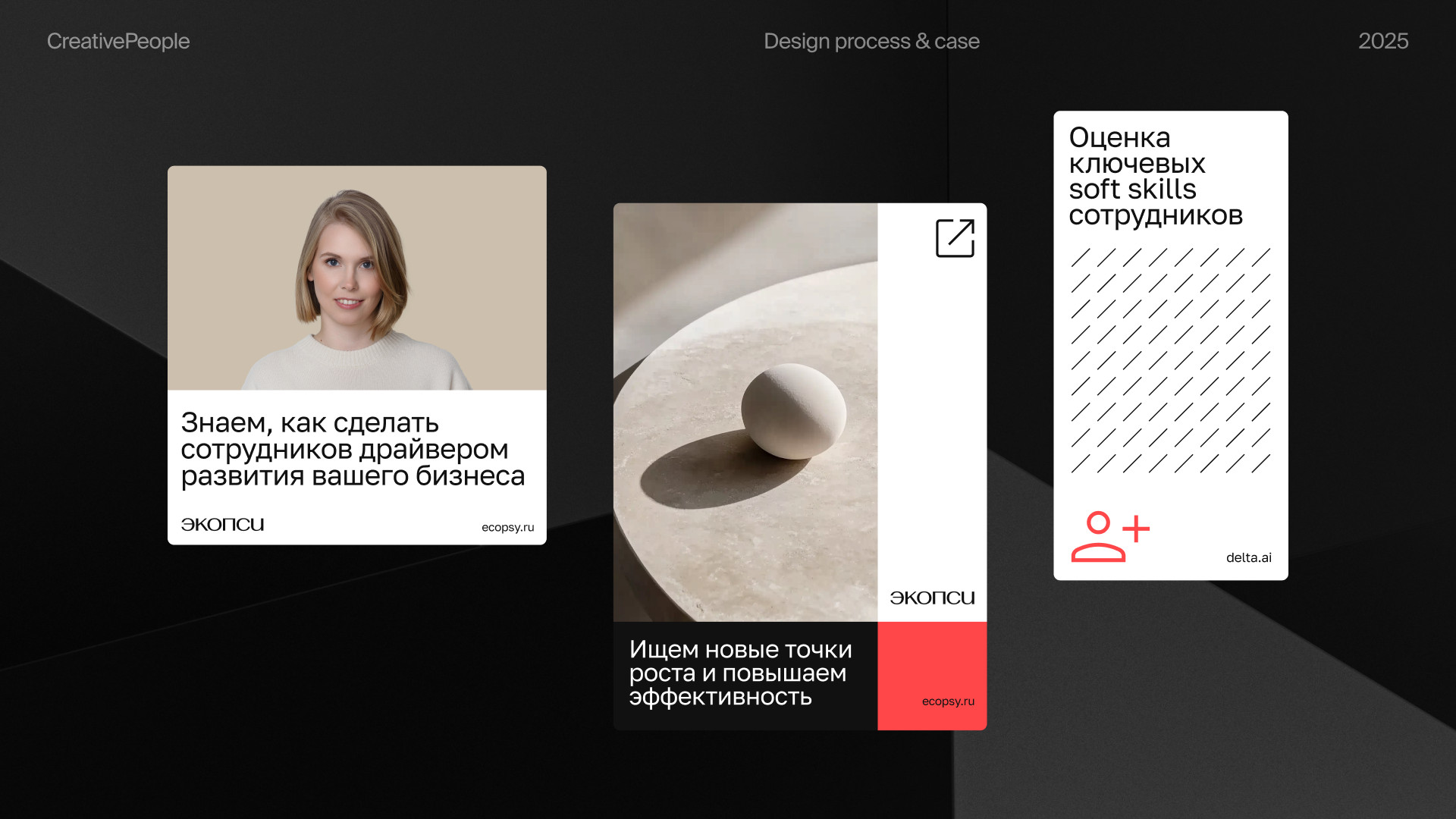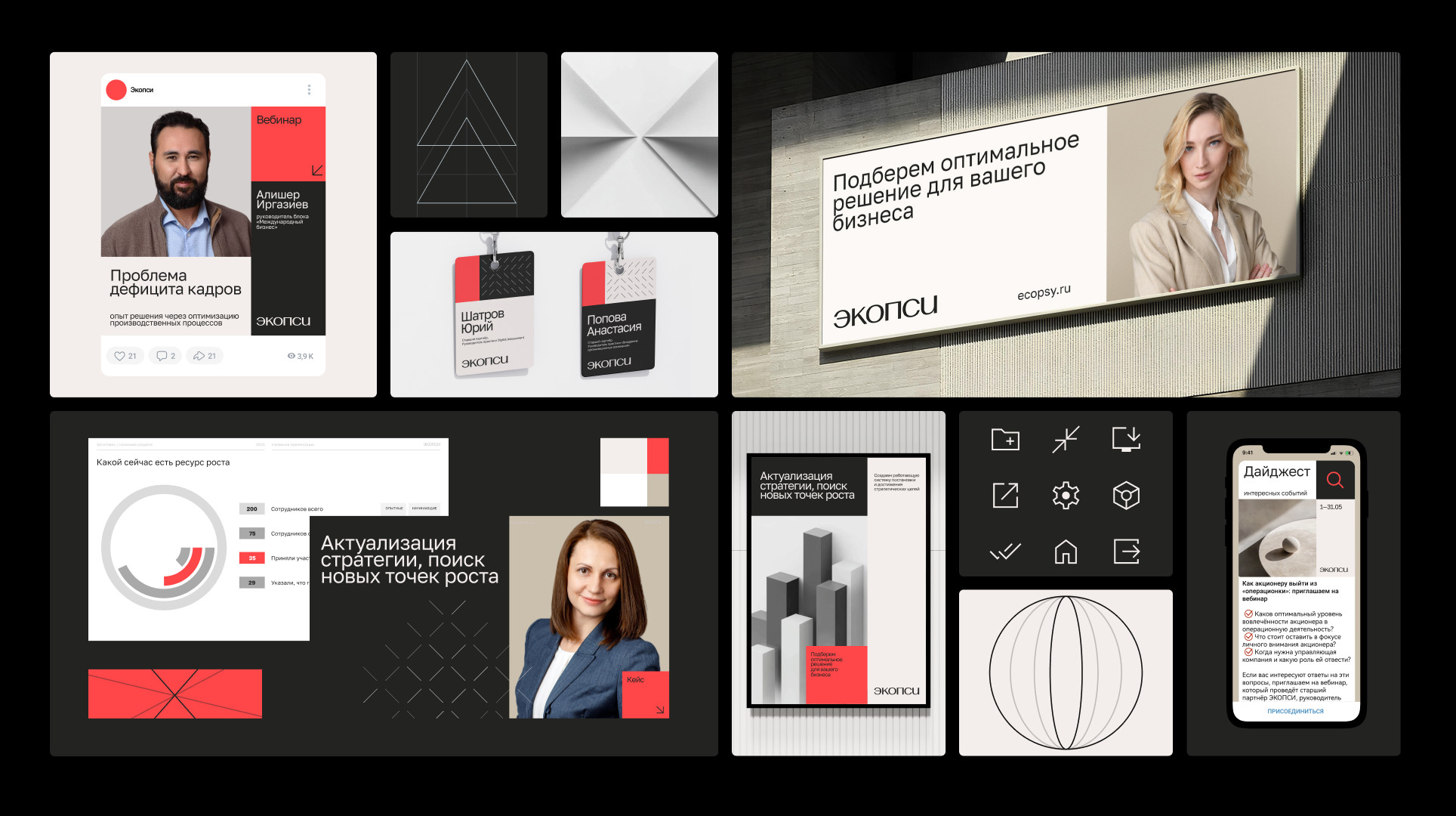 Одним из ключевых элементов фирменного стиля ЭКОПСИ был слэш, который фигурировал в логотипе, соединяя две части названия — ЭКОномику и ПСИхологию. Мы решили сохранить его, но переосмыслить: из логотипа он исчез, зато стал отправной точкой для паттернов в новом стиле, символизируя динамичность и устремлённость к цели. С командой ЭКОПСИ мы решили, что в новом логотипе должны считываться экспертность и интеллигентность, при этом образ должен выглядеть современно и стильно. Так мы остановились на строчном написании названия компании, выполненном контрастным гротеском. Плавные линии в совокупности с общей лаконичностью и сдержанностью образа удачно сочетают строгость и мягкость, отсылая к человекоцентричности компании. Цветовая гамма тоже была выбрана с ориентиром на ценности и платформу бренда. Основные цвета не должны отвлекать или развлекать пользователя, их задача — подчеркнуть профессионализм, качество и практичность предлагаемых решений, ориентацию на результат, поэтому базовыми стали лаконичные чёрный, серый и белый цвет, а также дополнительные бежевые оттенки. Акцентным мы выбрали мягкий и энергичный коралловый. Он отлично передает баланс между эмоциональной теплотой и проактивностью бренда и добавляет образу динамики и драйва, свойственных команде ЭКОПСИ. Для оформления макетов мы выбрали блочную структуру, похожую на конструктор. Плашки-модули могут собираться в различные комбинации в зависимости от задач коммуникации и носителей. Это тоже отсылка к подходу ЭКОПСИ: компания аккумулирует опыт своих экспертов и отдельные решения в единую, логичную и эффективно работающую систему, уникально выстроенную для каждого конкретного случая. Графические иллюстрации мы предложили создавать на основе простых геометрических фигур — складываясь в различные комбинации, они приобретают новые смыслы, например: Новый фотостиль состоит из двух основных элементов — фотографий экспертов и ИИ-абстракций. Чтобы смягчить блочную структуру макетов и добавить человечности, мы сохранили в новом стиле возможность использовать фотографии. Фото экспертов мы рекомендовали делать живыми, расслабленными, на светлых и бежевых фонах из основной палитры, чтобы пользователя ничего не отвлекало от спикера, при этом у него могла создаваться эмоциональная связь с экспертом как с человеком. Кроме фотографий людей, мы предложили использовать абстрактные изображения, сгенерированные нейросетями. Например, картинки с разнообразными текстурами, цветами и формами; они позволяют уйти от «буквальных» стоковых картинок в более интересные ассоциативные и делают изображения более мягкими по характеру. Наша команда разработала готовые промпты для Midjourney, позволяющие легко создавать новый визуальный контент в рамках фирменного стиля. При создании дизайн-системы мы продумали разные варианты макетов носителей, в которых сочетаются все элементы стиля: блоки, паттерны, иллюстрации и фотографии. Новый фирменный стиль ЭКОПСИ получился современным, лаконичным и в то же время динамичным и человечным. Он подчёркивает экспертизу компании, её подход, базирующийся на эффективных решениях, которые приносят пользу бизнесу. Мы уверены, что новый визуальный облик поможет ЭКОПСИ продолжать уверенно заявлять о себе в мире управленческого консалтинга 