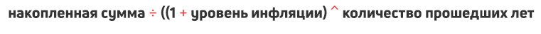 Чтобы сделать более точными расчёты, сколько получится накопить денег и насколько весома эта сумма окажется через 18 лет, мы будем учитывать инфляцию с помощью формулы: