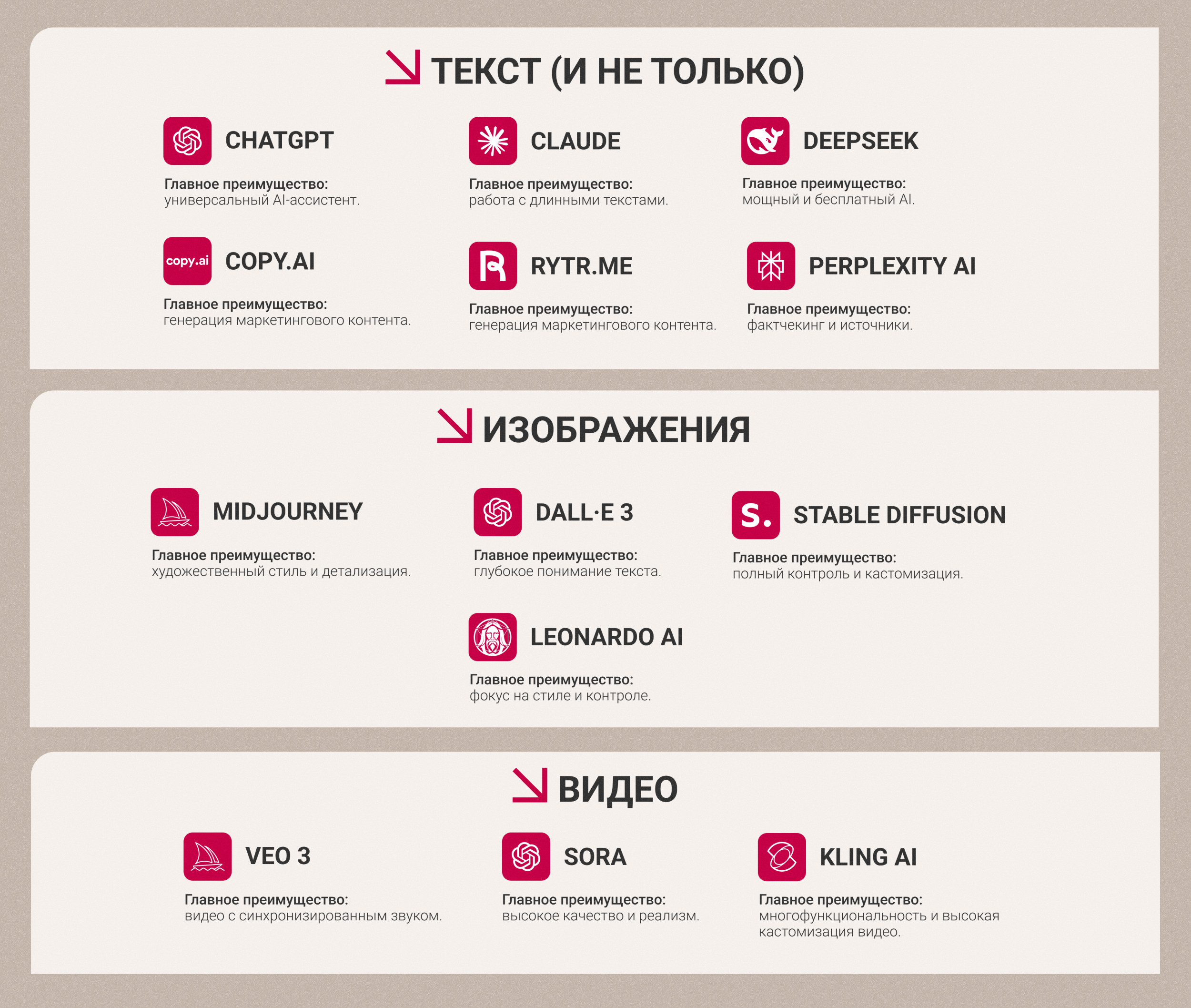 Для удобства — собрали все инструменты и их преимущества в карточке: Нейросети не заменят команду. Но помогут быстрее, проще и структурнее дойти до нужного результата. Важно понимать, где им место — а где нужен человек, который чувствует, выбирает и решает. Мы в CROP media подключаем ИИ-инструменты, когда они усиливают идею или экономят время. Но смысл, идея, финальная подача — всегда на стороне команды. Было полезно? Делитесь с командой!А если хочется применить что-то из прочитанного к своему проекту — мы на связи.