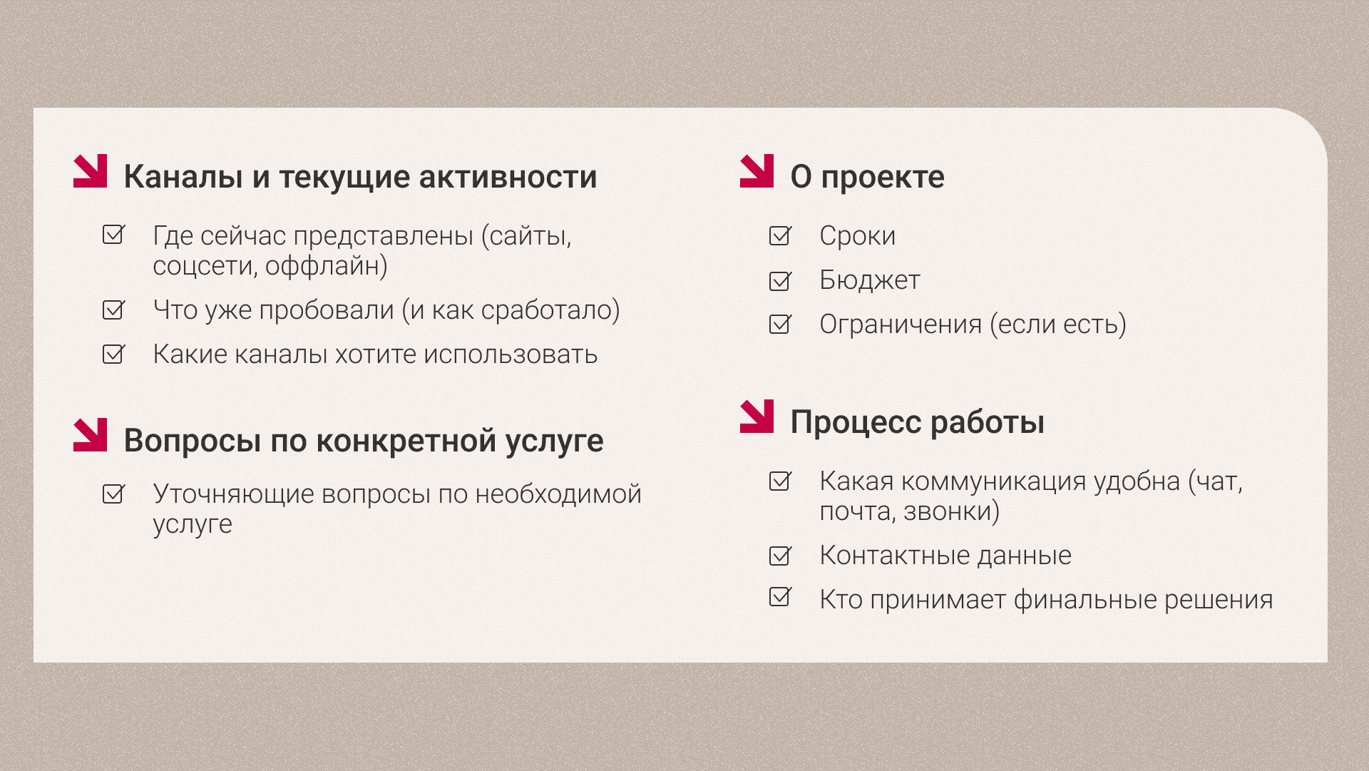 Бриф — как карта: чем он точнее, тем быстрее и проще прийти к нужному результату. Мы собрали универсальную структуру, которая может пригодиться под любую услугу, сохраняйте. Важно: Этот план подходит под любую услугу, но для каждого инструмента нужны уточняющие вопросы. Так вы избежите размытых ответов и глубже поймёте конкретное направление. Например: Помните: Это не только сбор данных, но и момент, когда клиент решает, доверять ли вам проект. Иногда удобнее, чтобы клиент заполнил бриф сам, особенно если в проект вовлечено несколько людей. Но чтобы это не было формальностью, подготовьте его так, чтобы отвечать было легко. Хороший брифинг — это только половина дела. Вторая половина — что вы сделаете с собранной информацией. Если оставить всё на уровне разговора, детали быстро теряются, а уверенность клиента — вместе с ними. После брифинга обязательно: Брифинг — это не просто старт проекта. Это момент, когда вы закладываете фундамент отношений с клиентом. Чем точнее вы задаёте вопросы, тем меньше придётся додумывать. А чем меньше догадок — тем быстрее и качественнее результат. Хотите брифинг, после которого всё будет чётко, без сюрпризов и потери времени? Мы так умеем.