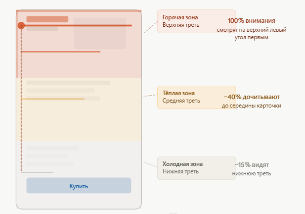 F-паттерн — это физиология. Мозг не читает карточку слева направо и сверху вниз равномерно. Он сканирует по траектории которую за него выработала эволюция: первая горизонталь — самое важное, потом вниз по левому краю. Поставь оффер туда куда смотрят и карточка начнёт продавать до того как покупатель прочитает хоть слово.