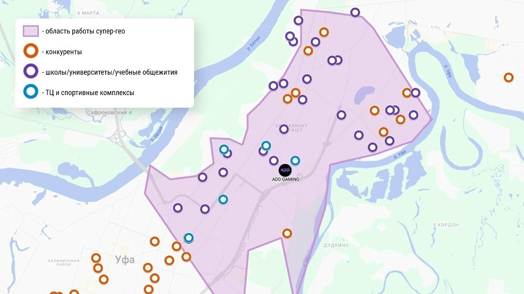 Перед запуском рекламы мы провели анализ локации и целевой аудитории города (конкуренты, школы, университеты, учебные общежития, крупные спортивные комплексы, торговые центры и т.д.) А также определили основную зону работы таргетированной рекламы
