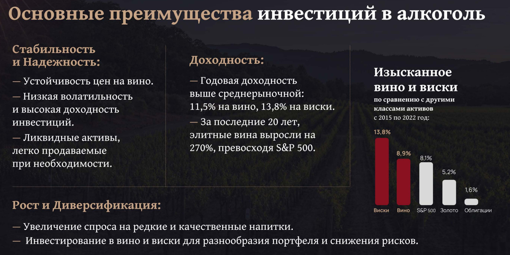 Коллекционный алкоголь давно зарекомендовал себя как надежное средство для сбережения и приумножения капитала. Редкие виды вина, старые виски, эксклюзивные ромы и другие напитки обладают потенциалом значительного увеличения стоимости со временем. Причинами этого являются их ограниченное производство, уникальность, историческая ценность и повышение качества напитка в процессе старения.