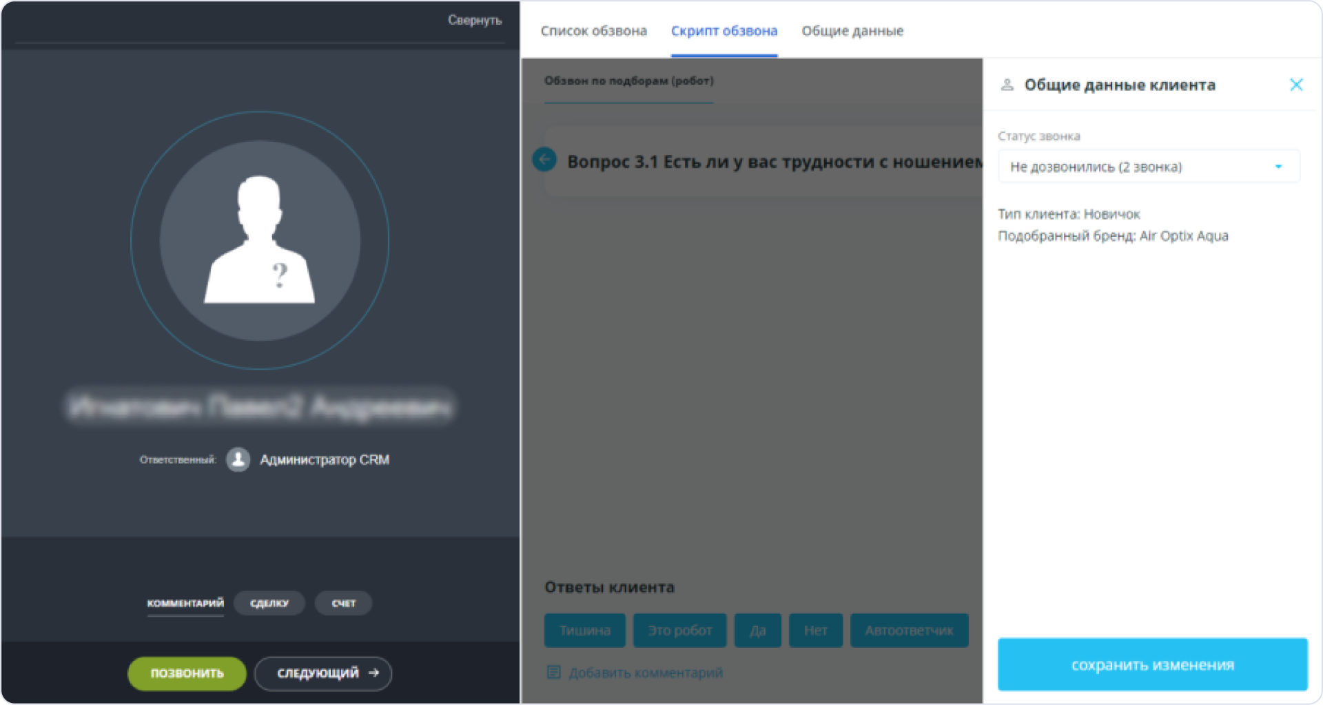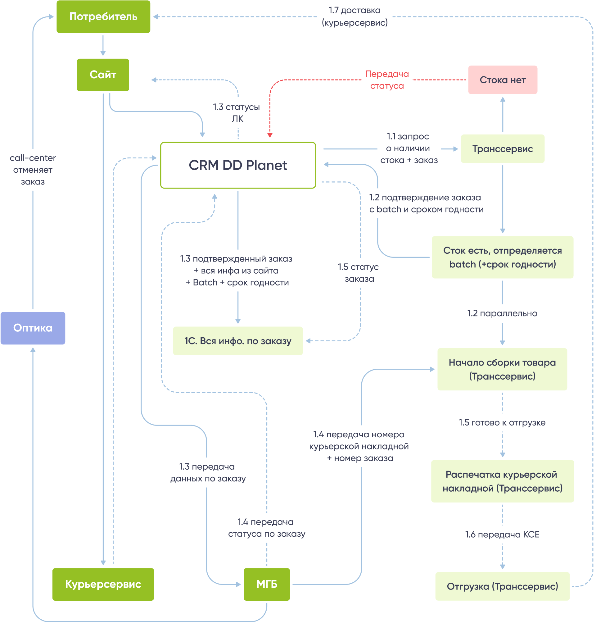 Внедрение CRM2 Перенос исторических данных3 Автоматизация работы операторов call-центра с помощью динамических скриптов4 Интеграция CRM с внешней системой аналитики5 Подключение роботов автообзвона Задача Клиенты Alcon делятся на две группы: специалистов (врачи, магазины оптики) и розничных покупателей линз, растворов и капель. Call-центр компании оповещает их о новых продуктах бренда, собирает отзывы, проверяет качество подбора линз. Ранее call-центр вел отчетность в Google Таблицах, поэтому даже самая простая аналитика поведения покупателей требовала много ручного труда.Телефонные разговоры с клиентами записывались, но эти данные не использовались для аналитики, поэтому контролировать и оптимизировать работу операторов было сложно. Необходимо было внедрить в компании автоматизированные инструменты для работы call-центра и сбора данных о покупателях. Проанализировав потребности компании, команда разработки DD Planet предложила внедрить CRM-систему — на первом этапе в формате MVP (minimal viable product): В дальнейшем внедренная CRM-система должна была стать ядром многих сервисов Alcon. После подключения и настройки CRM в нее нужно было перенести накопившиеся у компании данные о потребителях — около 220 тысяч записей. Импорт данных мы произвели в три этапа: Также был разработан сервис для динамического обмена между базой данных CRM и личным кабинетом потребителя на сайте. Теперь все изменения в одной из систем приводят к автоматическому обновлению данных в другой. Для операторов call-центра в CRM была настроена функция отображения скрипта разговора с клиентом в зависимости от его типа и темы разговора. Операторы могут не только читать вопросы с экрана во время звонка, но и сразу вносить информацию о клиенте в поля для ответов, выбирая или вводя значение. Компания Alcon предлагает своим клиентам услугу подбора линз в оптиках по всей России. Результаты подбора вносятся в отдельную систему аналитики. После внедрения CRM мы выполнили интеграцию этих систем. Обмен данными происходит следующим образом: Позднее, со стартом работы интернет-магазина Alcon, к сценариям обзвонов добавились звонки покупателям — например, для подтверждения заказа. Сценарии обзвонов настраиваются в виде графов, что позволяет описать в них любые, даже наиболее разветвленные ситуации. В зависимости от ответа пользователя система показывает оператору разные «ветки» скрипта: так, если пользователь оставляет негативный отзыв, оператор увидит одну ветку разговора, если задает вопрос — другую. Компания Alcon предлагает своим клиентам услугу подбора линз в оптиках по всей России. Результаты подбора вносятся в отдельную систему аналитики. После внедрения CRM мы выполнили интеграцию этих систем. Обмен данными происходит следующим образом: Позднее, со стартом работы интернет-магазина Alcon, к сценариям обзвонов добавились звонки покупателям — например, для подтверждения заказа. Сценарии обзвонов настраиваются в виде графов, что позволяет описать в них любые, даже наиболее разветвленные ситуации. В зависимости от ответа пользователя система показывает оператору разные «ветки» скрипта: так, если пользователь оставляет негативный отзыв, оператор увидит одну ветку разговора, если задает вопрос — другую. Во время звонка оператор видит карточку пользователя, где содержится вся информация о нем и его п