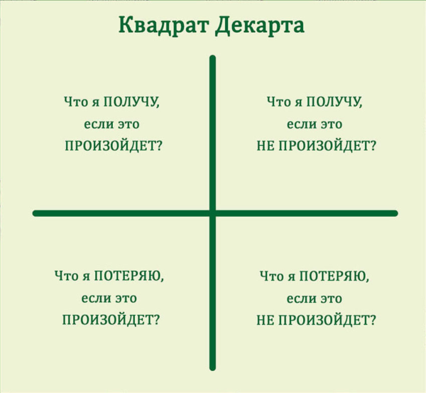 Техника принятия решений названа в честь французского философа и математика Рене Декарта. Она схожа с обычным сравнением плюсов и минусов выбора, но разделяется сразу на четыре сектора, чтобы посмотреть на проблему со всех сторон. Для построения квадрата Декарта понадобится листок бумаги, ручка (карандаш) или любые электронные ресурсы с возможностью начертить небольшой график с двумя осями.