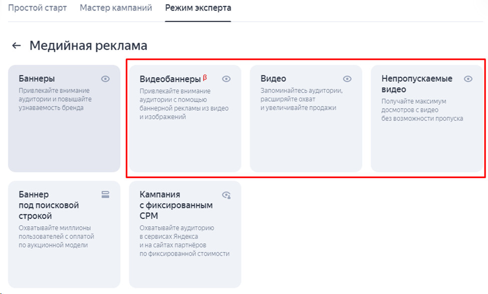 4. Разнообразие инструментов. В Яндекс Директ предусмотрены разные типы видеорекламы, что позволяет гибко выстраивать стратегию: от массового охвата до стимулирования прямых продаж.