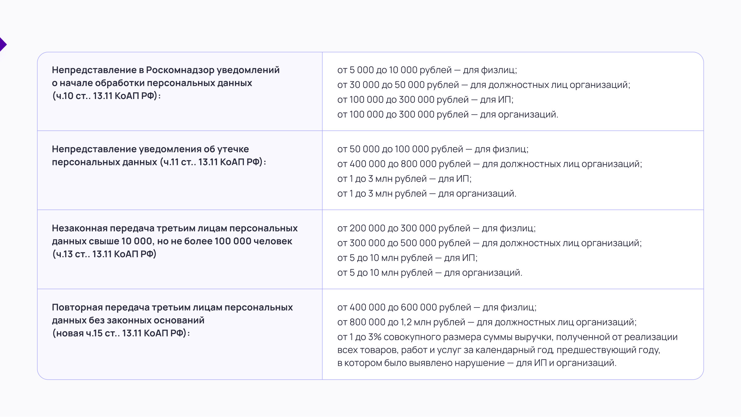 Если на вашем сайте есть формы обратной связи, онлайн-заявки, кнопки подписки на рассылку или установлены системы веб-аналитики — вы уже работаете с персональными данными пользователей. А значит, обязаны соблюдать требования закона № 152-ФЗ «О персональных данных». 1 сентября 2022 года и 1 марта 2023 года в этот закон были внесены серьезные изменения. Они касаются не только обработки персональных данных, но и трансграничной передачи — то есть отправки информации на серверы, находящиеся за пределами России. Все это требует повышенного внимания со стороны владельцев сайтов. Игнорирование новых требований влечет за собой наложение серьезных штрафов. А с 30 мая 2025 года размер штрафных санкций стал еще больше. Ниже приведем размеры некоторых штрафов: