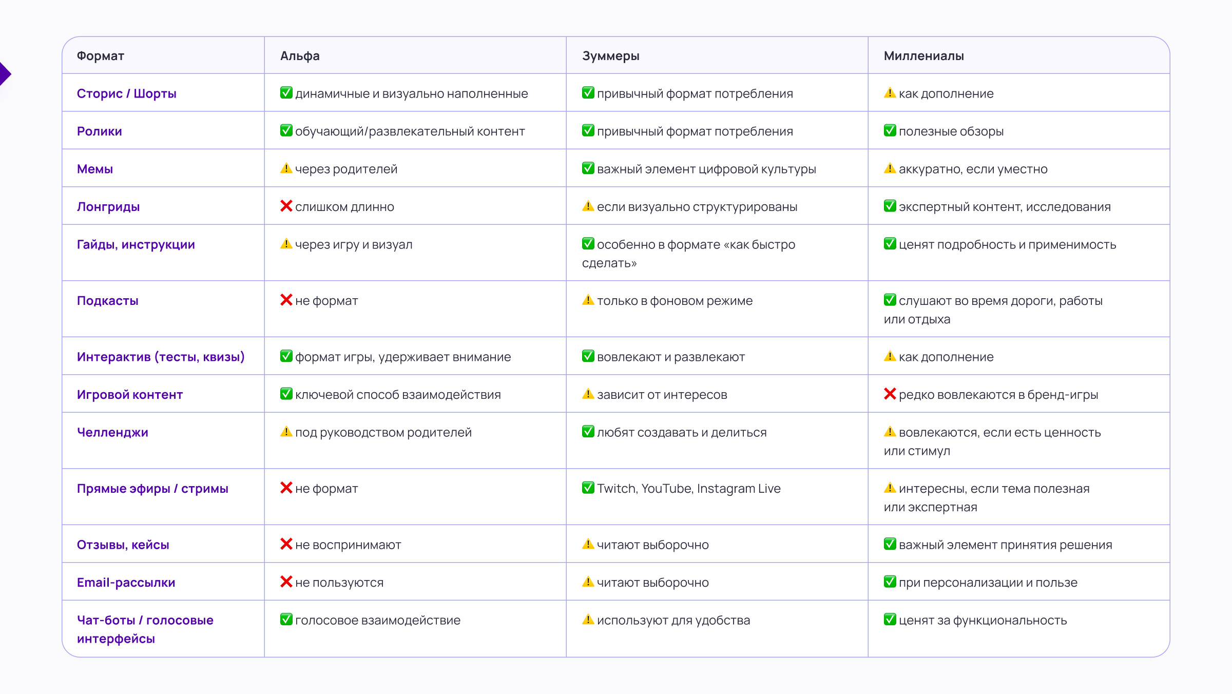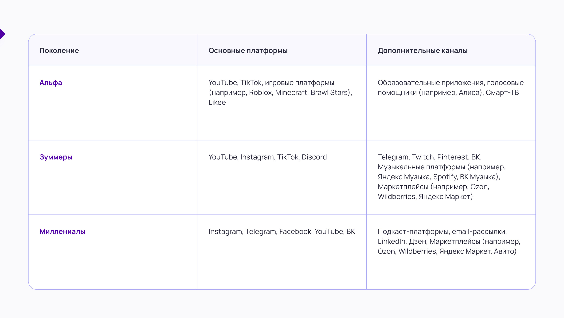 Миллениалы выступают «мостом» между аналоговым и цифровым миром. Они росли в эпоху дисков и кассет, но стали взрослыми с приходом интернета, социальных сетей и онлайн-сервисов. Благодаря этому опыту они стали гибкими, адаптивными и требовательными к качеству контента и продукта. Их подход к потреблению — осознанный и взвешенный. Миллениалы выбирают бренды, которые не просто продают, а предлагают реальную пользу, соответствующую их личным убеждениям и ценностям. Прежде чем купить, они читают отзывы, сравнивают предложения, задают вопросы. Поколение Z / Зуммеры Зуммеры — это первое поколение, для которого интернет был не новшеством, а естественной средой. Они выросли в мире коротких видео, сторис и вирусного контента, где все решают первые секунды. Именно поэтому их внимание — один из самых ценных и дефицитных ресурсов: стоит промедлить или быть неубедительным, и пользователь уже проскролил дальше. Для зуммеров критически важна честность. Они мгновенно считывают фальшь, чувствуют натянутый тон, неискренние эмоции и отвергают шаблонный маркетинг. Их доверие невозможно купить — его можно только заслужить. Поколение Альфа Поколение Альфа — это первое поколение, которое с рождения оказалось в цифровом мире. Они растут среди сенсорных экранов, YouTube-каналов, голосовых ассистентов и игровых платформ. Эти дети нередко начинают «свайпать» раньше, чем говорить, и осваивают гаджеты быстрее родителей. Их медиа опыт — это мир игр, видео и интерактива, где контент должен мгновенно увлекать. Главная особенность поколения альфа — двойная модель потребления: выбор делают родители, но инициатива исходит от детей. Компаниям, работающим с детской аудиторией, приходится говорить сразу с двумя поколениями: быть понятными и привлекательными для детей, но при этом вызывать доверие у взрослых. Знать, кто ваша аудитория, — это только половина работы. Вторая, не менее важная часть — научиться говорить с ней на ее языке. Формат подачи, канал коммуникации и tone of voice — все имеет значение. Каналы: где искать каждое поколение Какой контент интересен каждому поколению Помимо выбора каналов и форматов, ключевую роль играет и тональность общения бренда. Tone of voice должен точно отражать ожидания конкретного поколения — иначе коммуникация может показаться неестественной, а иногда и отталкивающей. Правильный тон помогает выстраивать доверие, говорить «на одном языке» и органично встраиваться в информационную среду аудитории. Разберем, как необходимо говорить с каждым поколением: 1. Персонализация контента Эпоха универсального контента осталась в прошлом. Сегодня аудитория ждет от компаний не просто внимания, а точного попадания в свои интересы, стиль жизни и потребности. Персонализированные сообщения, основанные на поведении, предпочтениях и истории взаимодействия, позволяют выстроить эмоциональную связь. 2. Вовлечение в контент, созданный пользователями Сегодня именно контент, созданный пользователями, вызывает наибольшее доверие. Когда компания показывает не рекламные слоганы, а настоящие лица, искренние истории и подлинные впечатления своих клиентов, это пробуждает искреннюю симпатию и отклик. Такой подход особенно хорошо работает с зуммерами и миллениалами, для которых важна подлинность и честность. 3. Больше доверия к микроинфлюенсерам Сегод