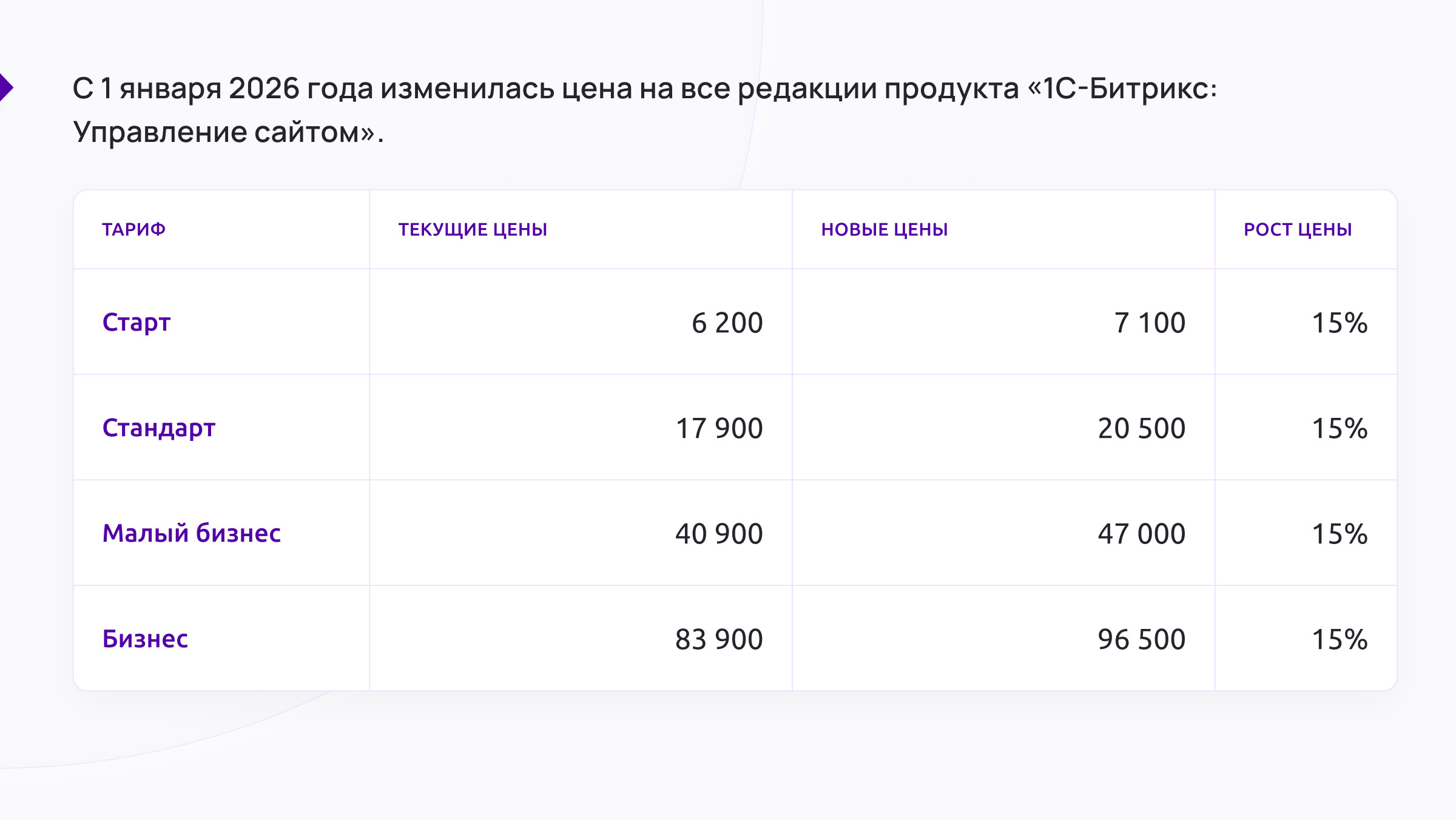 С 1 января 2026 года меняется цена на все редакции продукта «1С-Битрикс: Управление сайтом». Актуальные цены приложены в таблице ниже. 2. Масштаб и функционал сайта Бюджет проекта напрямую зависит от того, какой сайт нужен компании. 3. Дополнительные расходы Многие клиенты забывают о скрытых статьях бюджета, которые появляются до или после запуска. В них входят: 4. Разработка и команда Цена проекта также складывается и из количества специалистов и их уровня. В стандартную команду входят дизайнер, верстальщик, frontend- и backend-разработчики, тестировщик и менеджер проекта. Если привлекается SEO-специалист или аналитик — бюджет увеличивается. На итоговую сумму влияет и тип исполнителя: 5. Скорость разработки Скорость разработки — еще один фактор, влияющий на цену. Если проект нужно было запустить «вчера», добавляется коэффициент срочности. Оптимальный срок для разработки корпоративного сайта среднего уровня составляет от 1,5 до 3 месяцев. Любые попытки «ускорить» процесс без увеличения бюджета почти всегда ведут к снижению качества и проблемам после запуска. Стоимость корпоративного сайта на 1С-Битрикс формируется из множества факторов, но, несмотря на индивидуальные особенности каждого проекта, можно выделить несколько уровней бюджета, которые помогают клиентам ориентироваться при планировании расходов. Разработка корпоративного сайта — это инвестиция, и при грамотном планировании часть бюджета можно сэкономить без потери качества. Рассмотрим основные направления, где оптимизация оправдана. 1. Дизайн 2. Функционал и интеграции 3. Планирование и управление проектом 4. Планировать техническую поддержку заранее 1. Безопасность Защита данных пользователей и корпоративной информации критична. Сюда относятся SSL-сертификаты, обновления CMS и модулей, настройка прав доступа и резервное копирование. Экономия на безопасности может привести к взломам, утечкам данных и штрафам. 2. UX и мобильная адаптивность Удобство пользования и адаптация под мобильные устройства напрямую влияют на конверсии и пользовательские показатели. Сайт с неудобным интерфейсом или слабой мобильной версией теряет клиентов. 3. Тестирование Пропуск этапа тестирования или сокращение времени на него приводит к ошибкам в функционале и росту расходов на исправления после запуска. 4. Обновления Попытка сэкономить на обновлениях может сделать сайт нестабильным, небезопасным и устаревшим. Создание корпоративного сайта — это не просто статья расходов, а стратегическая инвестиция в развитие бизнеса. На итоговую цену влияет множество факторов: выбор лицензии, масштаб и архитектура проекта, уровень дизайна, количество интеграций и профессионализм команды. Однако важно помнить: главное — не сумма, потраченная на разработку, а то, насколько проект решает задачи компании. А если вы в поиске надежного партнера для разработки вашего сайта — пишите нам на почту: office@digimatix.ru или оставляйте заявку на сайте.