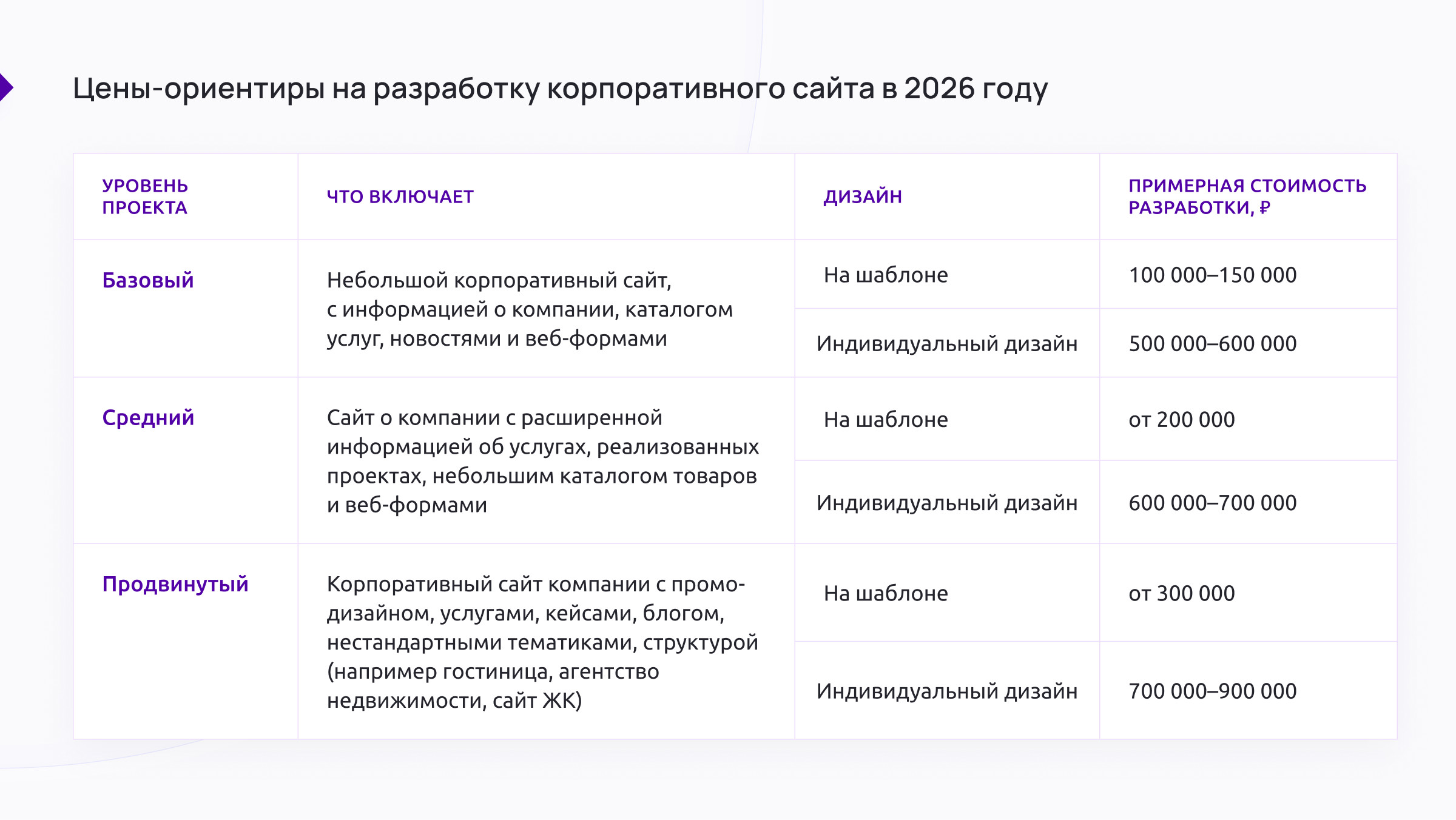Цены-ориентиры на разработку корпоративного сайта в 2026 году