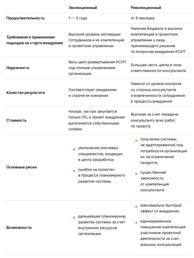 - эволюционный — постепенное внедрение и развитие КСУП в компании, когда рост компетенций участников проектной деятельности растет параллельно развитию функциональных возможностей ПО для управления проектами;