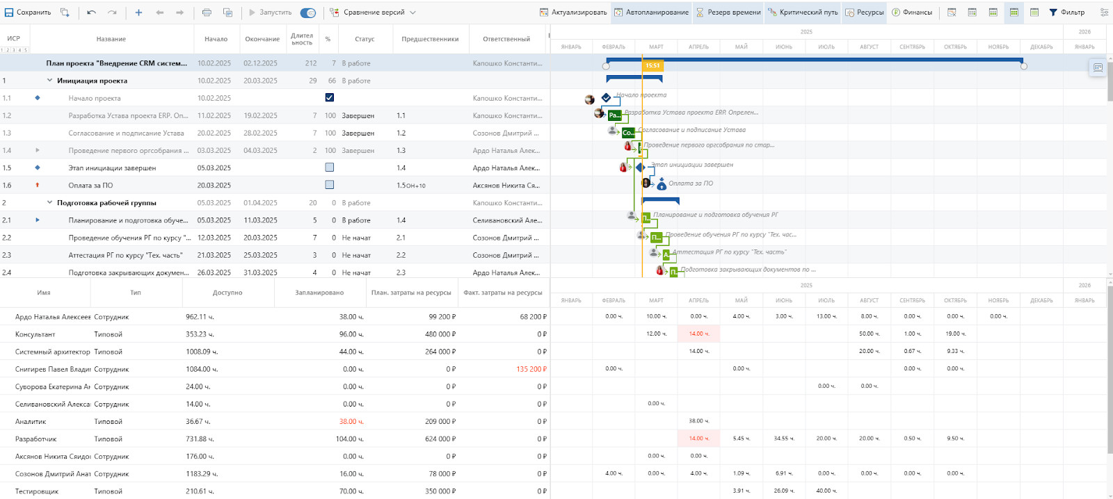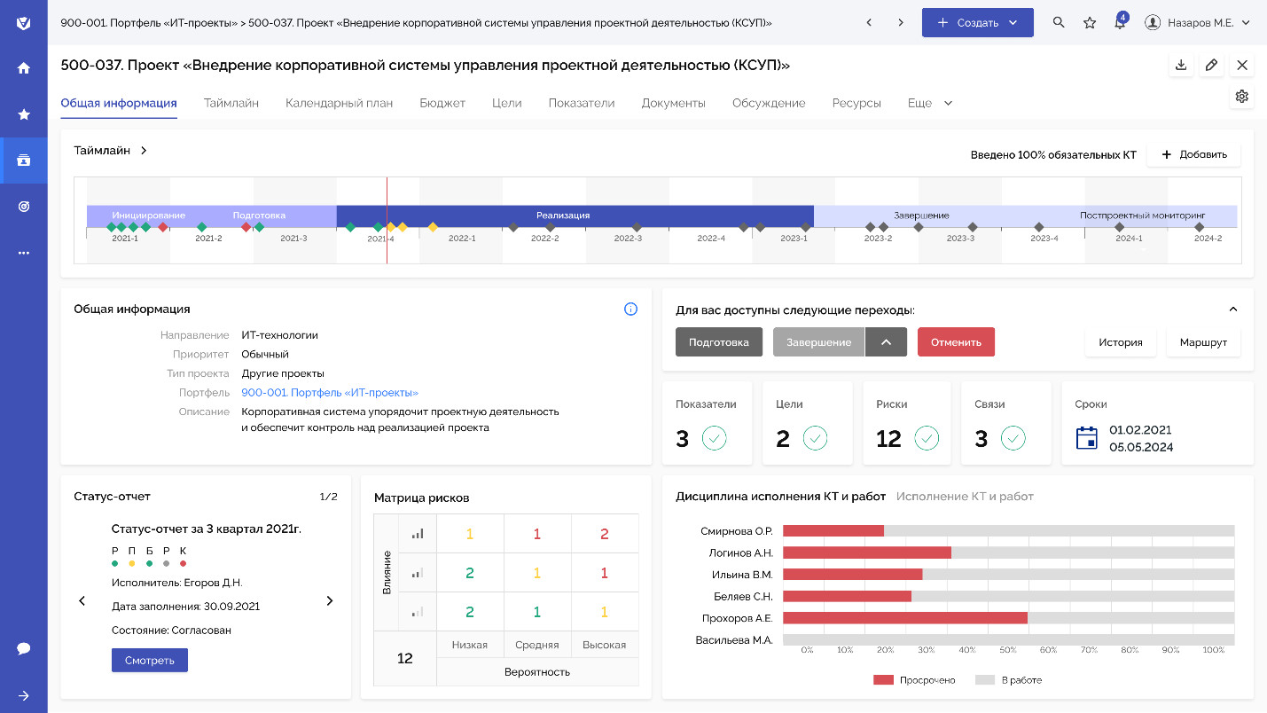Профессиональная система управления проектами, программами и портфелями. Помогает автоматизировать процессы стратегического и операционного управления проектами, в том числе контроль ресурсов, составление бюджета и аналитику. Преимущества: ● инструменты для стратегического управления и управления портфелями; ● встроенные механизмы контроля ресурсов и финансов; ● отчетность с возможностью настройки дашбордов и KPI; ● мобильное приложение; ● опыт внедрения. Недостатки: ● сложность первоначальной настройки и внедрения; ● отсутствие инструментов для Agile-подхода; ● высокая стоимость владения и поддержки; ● непростой интерфейс, требует обучения пользователей; ● нет календарей доступности ресурсов; ● не поддерживает ОС Linux. Кому подойдет: · крупным, в том числе государственным корпорациям; · предприятиям с классическим подходом к ведению проектов; · компаниям, которые используют управление по стратегическим инициативам. Решение поможет вести сложные инвестиционные и инфраструктурные проекты. Комплексная система управления проектами, включает в себя инструменты и методологию для стратегического планирования. Основной упор сделан на регламентированное проектное управление и аналитические возможности. Преимущества: ● консалтинг и внедрение методологии вместе с ПО; ● работа с ключевыми показателями эффективности проектов; ● управление целями и стратегическими инициативами; ● система отчетности и дашбордов с аналитикой по проектам; ● поддержка всех стандартов ГОСТ; ● нейропомощники. Недостатки: ● высокая сложность настройки и длительное внедрение; ● требуется полноценное обучение пользователей для эффективной работы; ● нет поддержки Agile-подхода; ● слабая no-code-настройка; ● высокая стоимость владения и поддержки; ● отсутствие операционной деятельности. Кому подойдет: · ведомственным организациям; · государственным структурам; · предприятиям с высокой степенью регламентированного управления проектами. Оптимально для сложных инвестиционных проектов, где важны строгий контроль, прогнозирование и отчетность. Не подойдет для ведения ИТ-проектов и работы небольших команд. Отечественная система управления проектами, программами и портфелями. Помогает перевести в цифру ключевые бизнес-процессы проектной работы. Часть экосистемы 1С. Преимущества: ● интеграция с другими решениями 1С (ERP, бухгалтерия, документооборот); ● встроенный учет трудозатрат и финансовых операций; ● работа с проектами на всех уровнях — от портфеля до отдельных задач; ● поддержка классических методологий управления проектами (диаграмма Ганта, контрольные точки, управление рисками); ● гибкая настройка отчетности и аналитики на базе встроенных инструментов 1С; ● работа с государственными стандартами (ГОСТ, ПМИ, строительные нормы). Недостатки: ● устаревший интерфейс, требует адаптации под современные UX/UI-требования; ● отсутствие гибких методологий (agile, scrum, kanban); ● высокая зависимость от экосистемы 1С — ограниченная интеграция с внешними информационными системами; ● требует специальных знаний для настройки и кастомизации; ● высокие затраты на доработку и адаптацию под специфические нужды бизнеса. Кому подойдет: · компаниям, которые уже используют решения 1С. Облачная российская система управления проектами. Включает в себя 7 онлайн