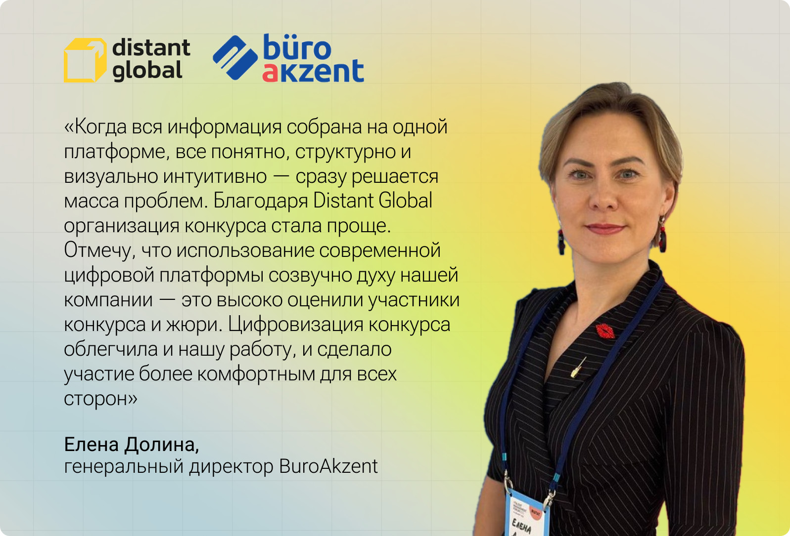 BuroAkzent более 20 лет развивает российское T&D-сообщество и помогает бизнесу выстраивать эффективное корпоративное обучение. Компания специализируется на обучении и развитии персонала. Ключевой проект BuroAkzent — всероссийский конкурс «Тренерское мастерство». Это мероприятие, на котором эксперты обмениваются опытом, лучшими практиками и формируют профессиональные стандарты обучения. Для его переноса в дистанционный формат требовалась цифровая платформа с гибкой, модульной архитектурой. Стандартизированные решения здесь были бы неэффективны, поскольку платформа не должна была стать просто средой для размещения заданий в онлайн-формате. Организационная модель всероссийского конкурса «Тренерское мастерство» отличается высокой сложностью. В нем участвуют одиночные специалисты и корпоративные команды, а задания проверяются анонимно. Платформа для реализации конкурса должна поддерживать загрузку и проверку работ, кастомную логику отбора финалистов, прозрачную механику расчета рейтингов и возможность гибко управлять составом жюри. Для реализации перечисленных требований BuroAkzent требовалась IT-инфраструктура со множеством взаимосвязанных блоков, которые могли бы одновременно учитывать логику конкурса, автоматизировать процессы и мониторить действия участников. Вот лишь часть требований, которые нужно было реализовать в рамках проекта: Каждое из требований — это отдельный логический блок в архитектуре конкурса, и как следствие, — модуль на платформе. Реализация такой сложной логики потребовала от платформы IT-компании Distant Global архитектурной гибкости. Кроме того, BuroAkzent стремилось протестировать новый подход, чтобы переосмыслить привычные организационные методы и оценить возможности дистанционного формата с перспективой масштабирования проекта. Переход на цифровую платформу стал для организаторов конкурса «Тренерское мастерство» возможностью упростить и автоматизировать множество рутинных процессов. Там, где раньше был почтовый хаос и ручной контроль, благодаря цифровизации появилась структура и предсказуемость. Как это было реализовано на платформе Distant Global: Кроме того, участники конкурса и жюри отметили современный, понятный и удобный дизайн платформы, в то время организаторам удалось убрать множество точек напряжения и ускорить финальную обработку данных, что позволило комфортно управлять процессом реализации проекта. С переводом всероссийского конкурса «Тренерское мастерство» на платформу компании Distant Global команда BuroAkzent смогла сосредоточиться на его содержании, а не на организационных вопросах. Упростилось взаимодействие с участниками и жюри, сократились временные издержки, повысилась точность и управляемость проекта. Кроме того, организаторы отмечают следующие итоги взаимодействия с компанией Distant Global: Также BuroAkzent отмечает возможность сопровождения проекта и оперативность техподдержки Distant Global, которая была на связи даже в выходные. Это были пиковые моменты, когда загружалось большинство работ. В целом комфортное управлением процессом реализации проекта даже в режиме высокой нагрузки стало одним из ключевых факторов успеха, отмечает BuroAkzent. Конкурс «Тренерское мастерство» показал, что даже уникальные, нетипичные проекты можно успешно перевести в цифровую среду при наличии кастомизирован