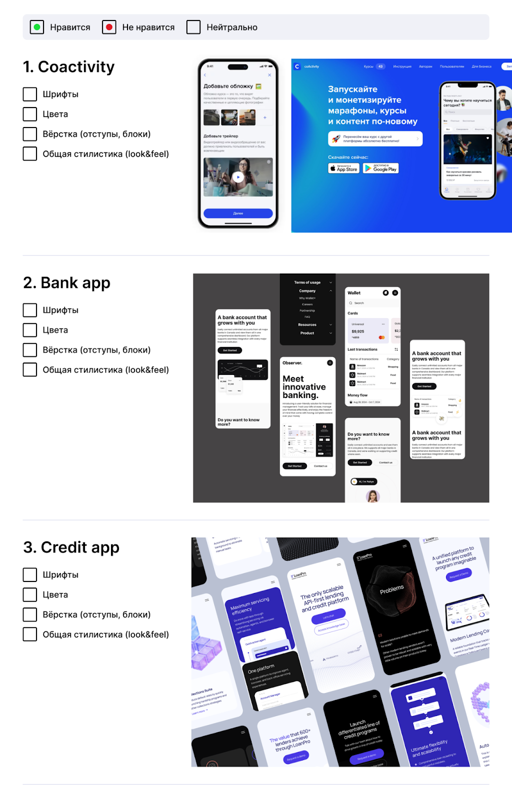 Для начала просим клиента заполнить бриф: 30+ вопросов о бизнесе, о целях, метриках, конкурентах, референсах. Пример брифа можно посмотреть здесь. Не все готовы вручную вписывать ответы на все вопросы. В этом случае мы заполняем их вместе с клиентом в формате интервью.