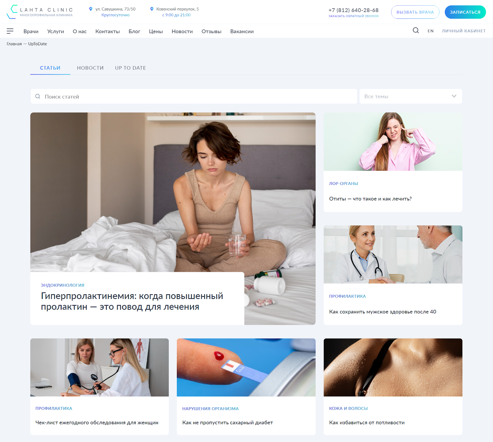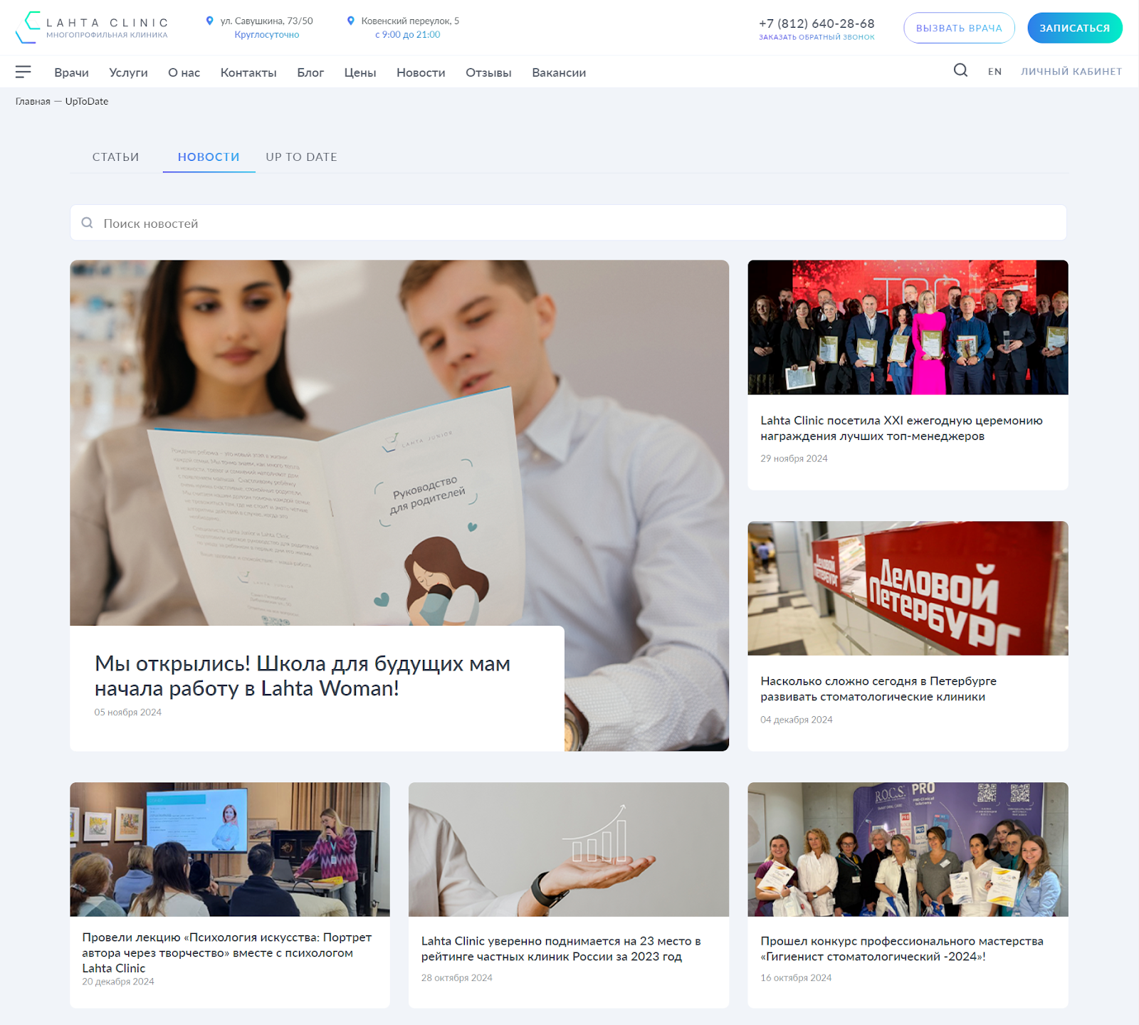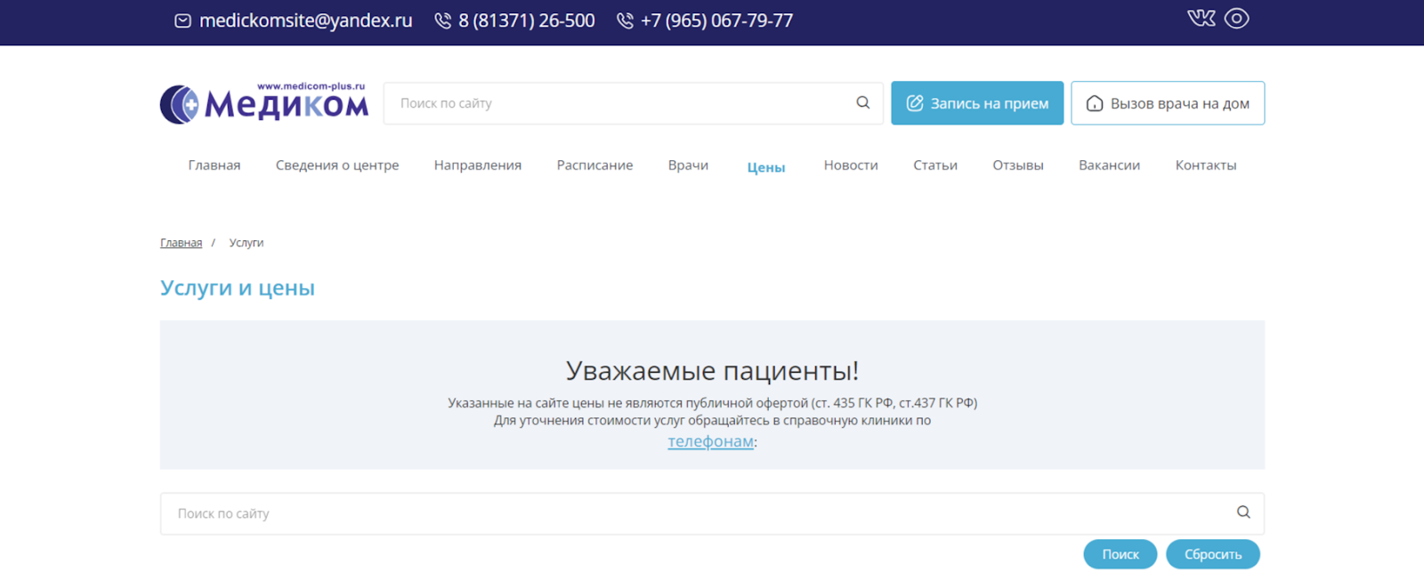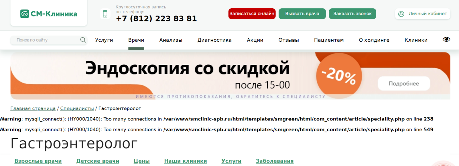Многопрофильные клиники предлагают множество услуг, различающихся не только по направлению (от аллергологии до эндокринологии), но и по целевой аудитории (мужчины, женщины, родители). Для удобной навигации уместно использовать отдельные страницы под каждое направление, например, как здесь: Большое значение для структуры имеет продуктовая линейка, продуманная маркетологом. Ну и упомянутый уже раздел «Стоимость». Оцените сами, где вы быстрее найдете цену нужной услуги: на странице, где есть строка быстрого поиска и сортировка по направлениям, или в таблице без них? Скорость решает. Сайт должен быстро загружаться, иначе он теряет в конверсии. Сколько именно — зависит от множества факторов, например, Google считает, что если сайт загружается дольше трех секунд, 53% пользователей уйдут. Удобная мобильная версия — мастхэв. В 2024 году во всем мире пользователи чаще выходили в интернет со смартфонов — 69% трафика. По наблюдениям нескольких моих знакомых маркетологов в большинстве ниш эта цифра может достигать 80-90%. Поэтому, если сайт не адаптирован для просмотра на смартфоне, клиника рискует потерять в конверсии. Задача SEO — привести пользователей на сайт и «прогреть» их до готовности совершить покупку. Сегодня один из лучших инструментов — блог клиники с полезными и релевантными статьями, оптимизированными под поисковые запросы. Он может существенно повысить видимость сайта. Но важно не переспамить с ключевыми словами и не закладывать в статьи манипулятивные посылы: современные пользователи защищают свои границы и не терпят запугивания и обвинений. Вот антипример: клиника утверждает, что процедура омоложения женских половых органов рекомендована абсолютно всем женщинам после 45 лет. При этом на сайте нет ссылок на исследования, которые выявили такое показание. В блоге здорового человека несколько разделов, включая статьи и новости. Чтобы сайт хорошо ранжировался, темы выбирают из популярных запросов в поисковике. Можно пользоваться статистикой запросов Яндекс Вордстат. Важно учитывать не только популярность запросов, но и ограничения в рекламных стратегиях, например, пациентам нельзя обещать стопроцентный результат. Еще одно требование SEO: на сайте не должно быть пустых страниц: они плохо сказываются на поисковой оптимизации, а еще дезориентируют пользователя. Посмотрите на скрин ниже: наводит на мысль о том, что компания что-то скрывает или забивает на клиентоориентированность. Стоит позаботиться и о том, чтобы посетитель не натыкался на предупреждения о системных ошибках. Халатность в дизайне и разработке создает впечатление халатности в работе организации. Конечно же, сайт не является источником клиентов сам по себе, но даже если вы не даете рекламу — люди приходят на сайт из поисковиков, справочников, отзовиков, рейтинговых сайтов и соцсетей. Это постоянный и условно бесплатный источник клиентом. Если какой-то канал отвалится, останется сайт. Именно так и произошло с Инстаграмом* и Фейсбуком*: таргетированная реклама стала там недоступной, когда их владельца, компанию Meta*, запретили в России. Были опасения, что с 2024 года инфлюенс-маркетинг сократится из-за обязанности крупных блогеров с аудиторией от 10 000 подписчиков регистрироваться в реестре Роскомнадзора. В целом, медицинский маркетинг регулируется статьей 24 закона 