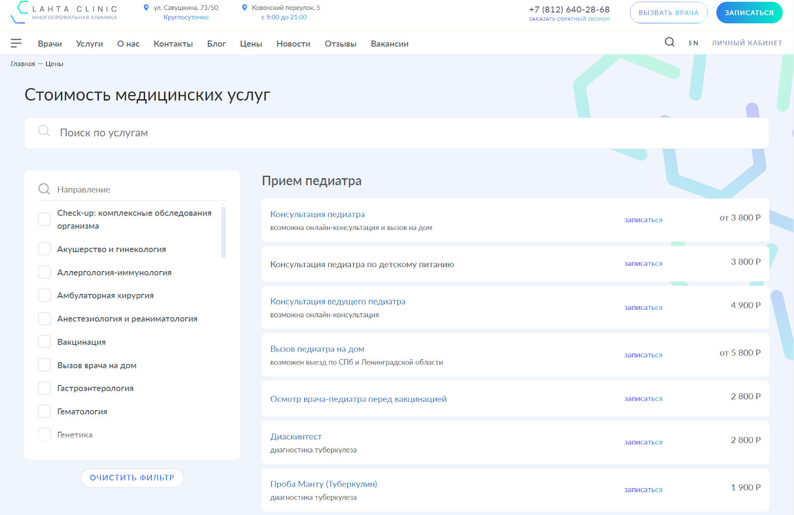 С каждым годом гигиенический минимум для сайта растет. Клиенты становятся требовательнее, набираются впечатлений при использовании других сервисов: никто ведь не захочет звонить в такси, зная, что можно заказать машину в пару кликов. Потому и тяжелые сайты клиник с прайсом на несколько страниц без фильтров и поиска — раздражают. Мы же знаем, что клиника могла позаботиться о клиентах и сделать удобнее. Поэтому испытываем недовольство и уходим к конкуренту.